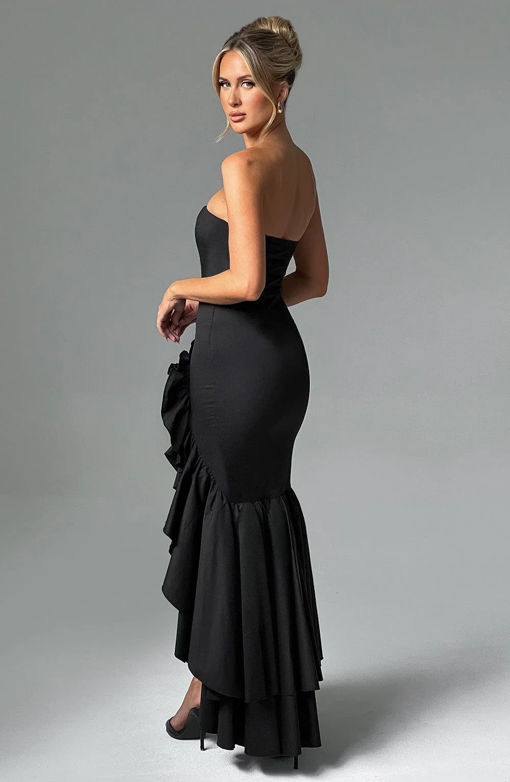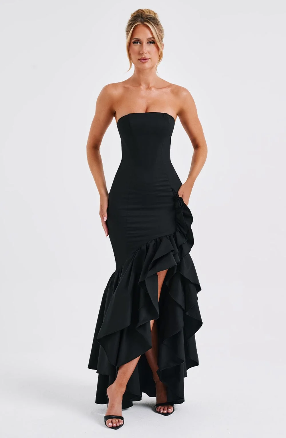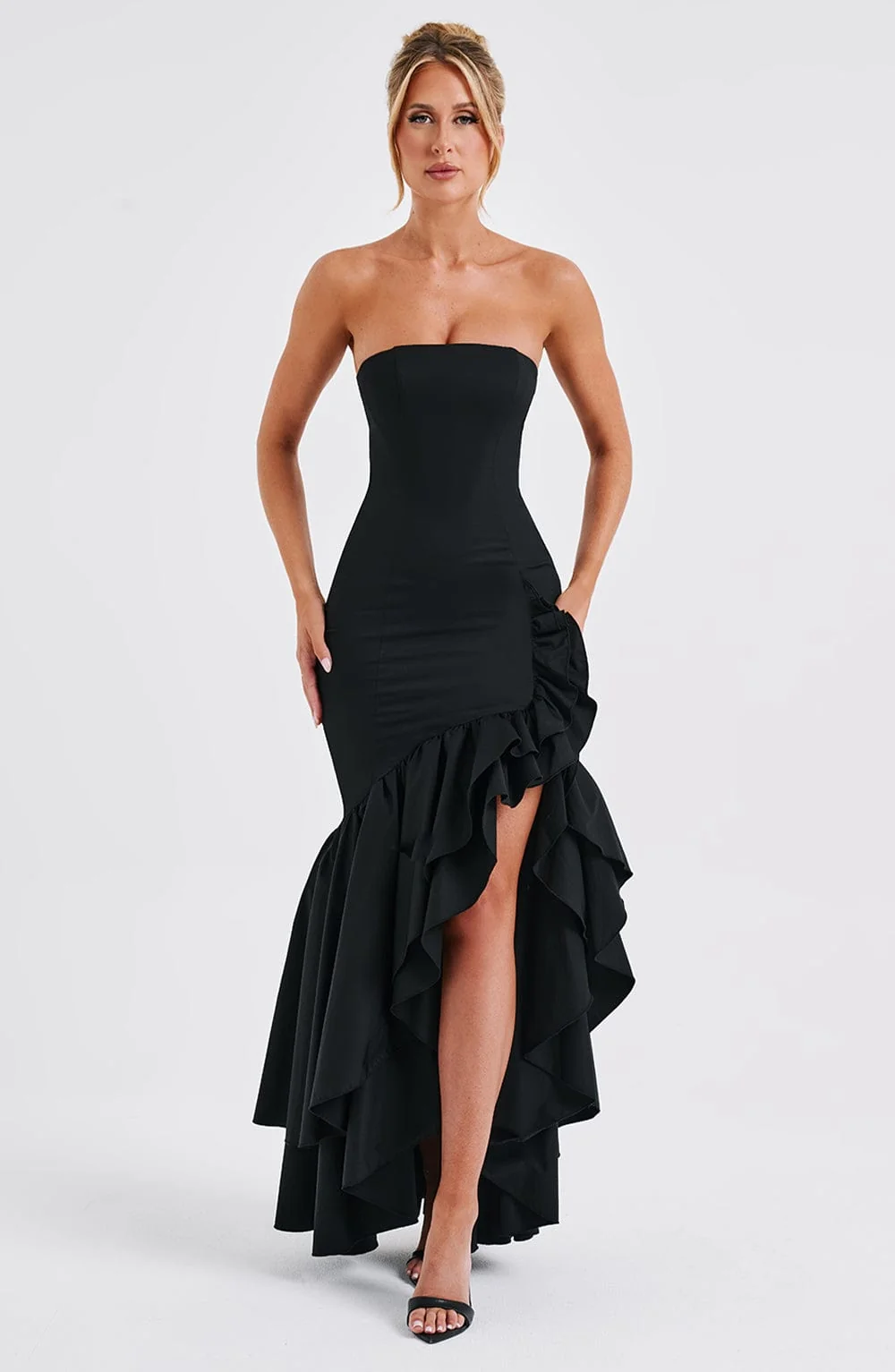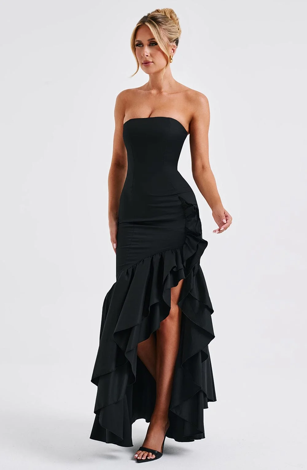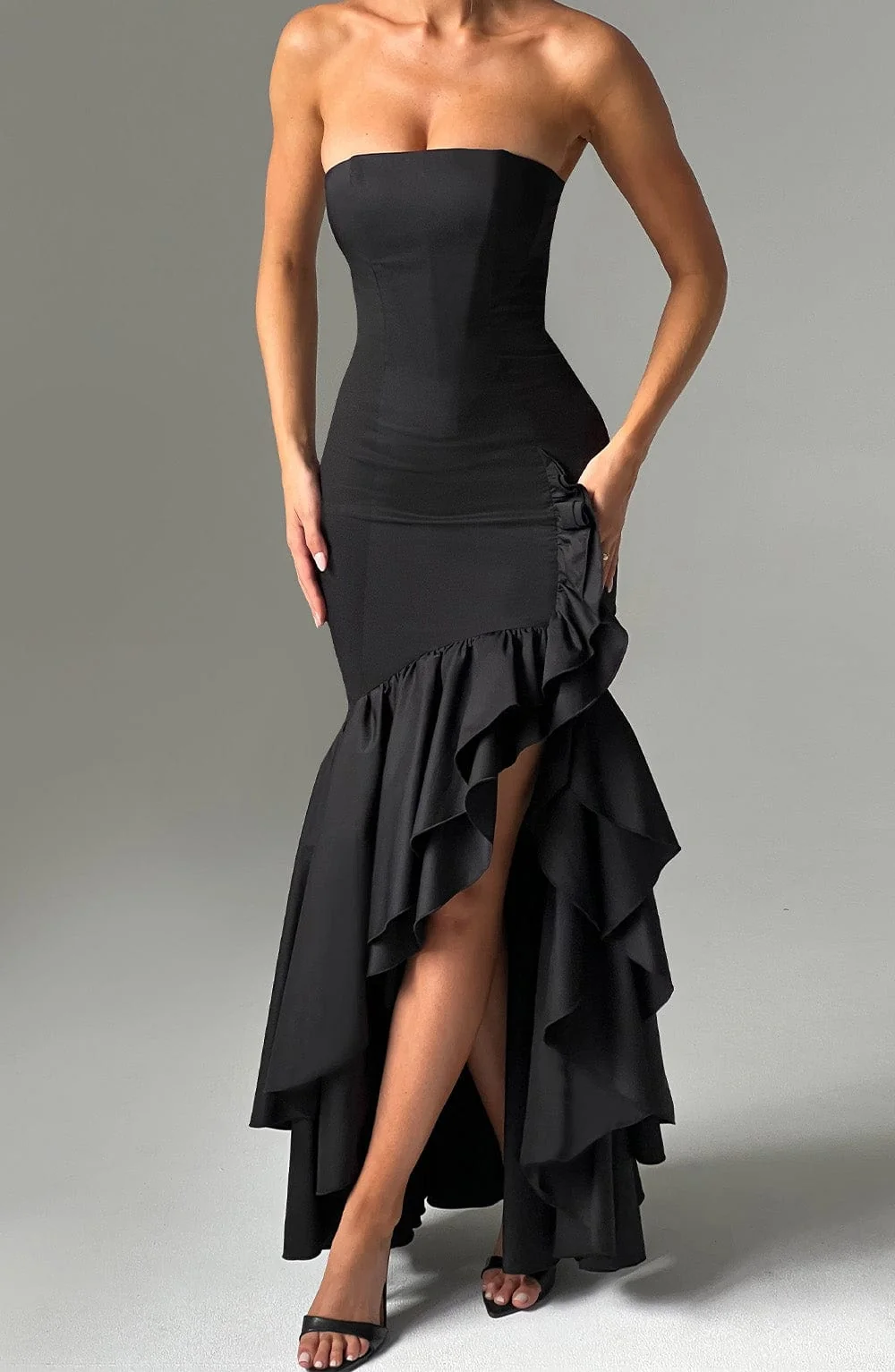 Step into your soft girl era with the Angelina maxi dress. Crafted from premium non-stretch cotton blend fabric, this strapless dress features a voluminous frilled high low skirt that adds a playful touch to your outfit. Designed with contour seams and a boned bodice, this dress hugs your figure elegantly. Whether its a wedding, party, or formal event, this black dress is both pretty and stylish. Model is XS size. Available sizes: XS, S, M, L, XL, XXL.