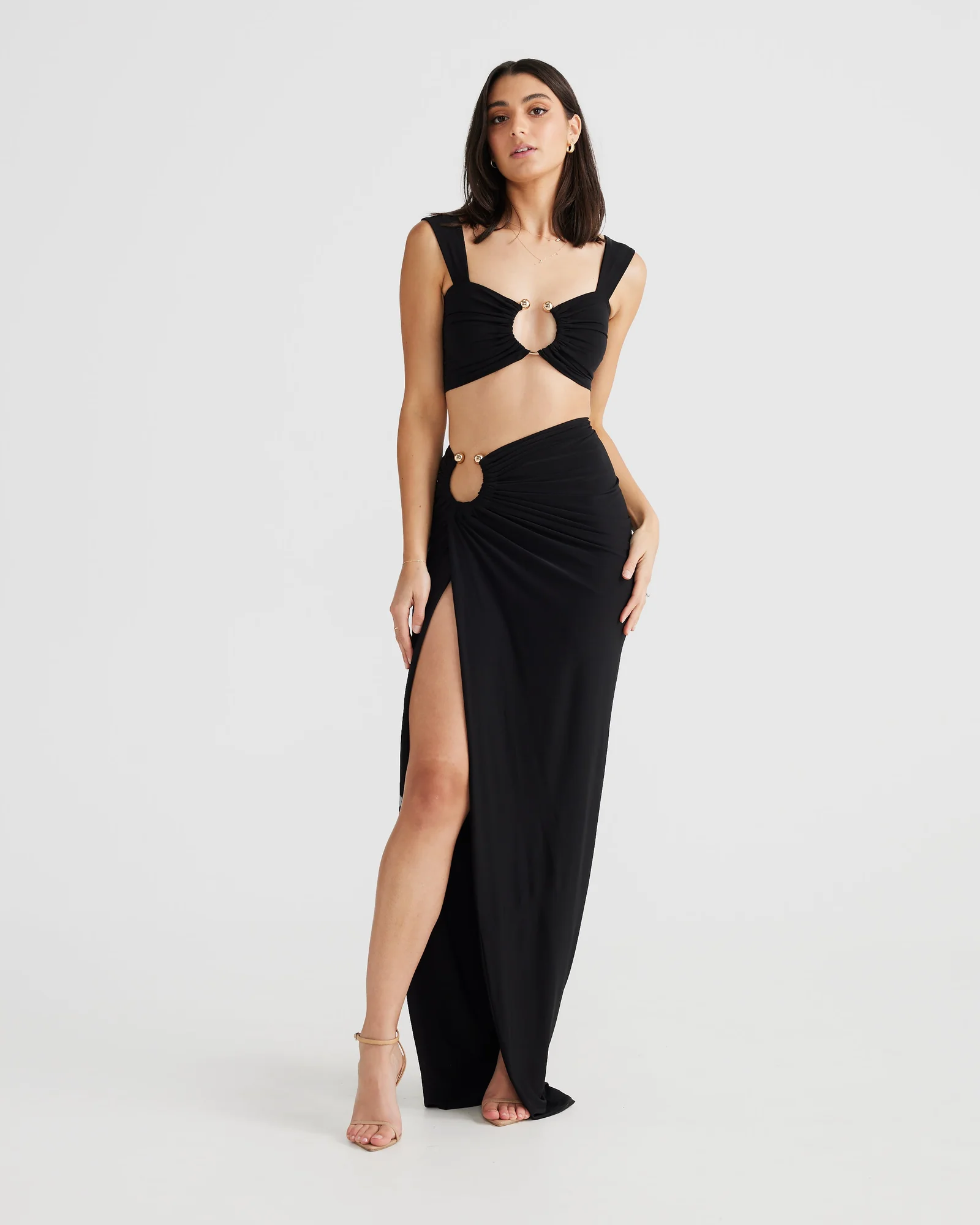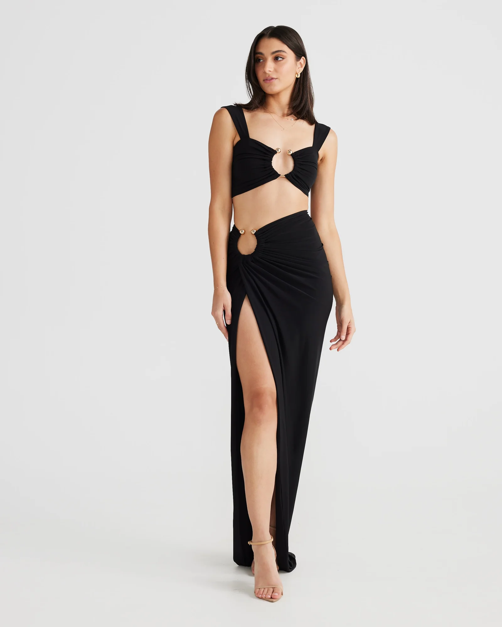 Elevate your style with the Bandit Strappy Pleated Slit Skirt Set in black. Crafted from our signature stretch fabrication, this daring ensemble features a high slit, Grecian-inspired gold metal detailing, and a gold clasp back closure. Fully lined with double layers for a luxurious feel. Step into confidence with Bandit! Model height: 167cm.
