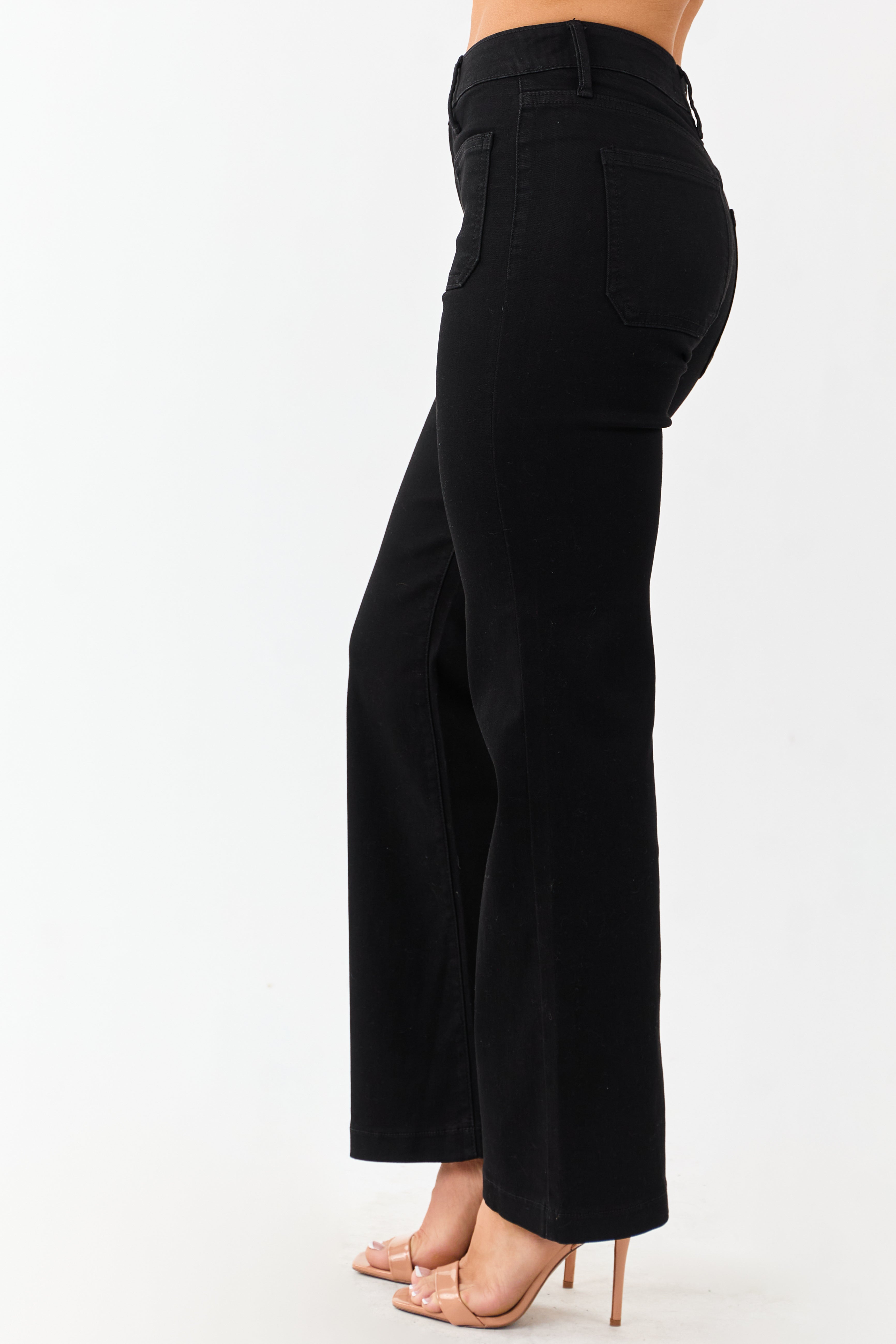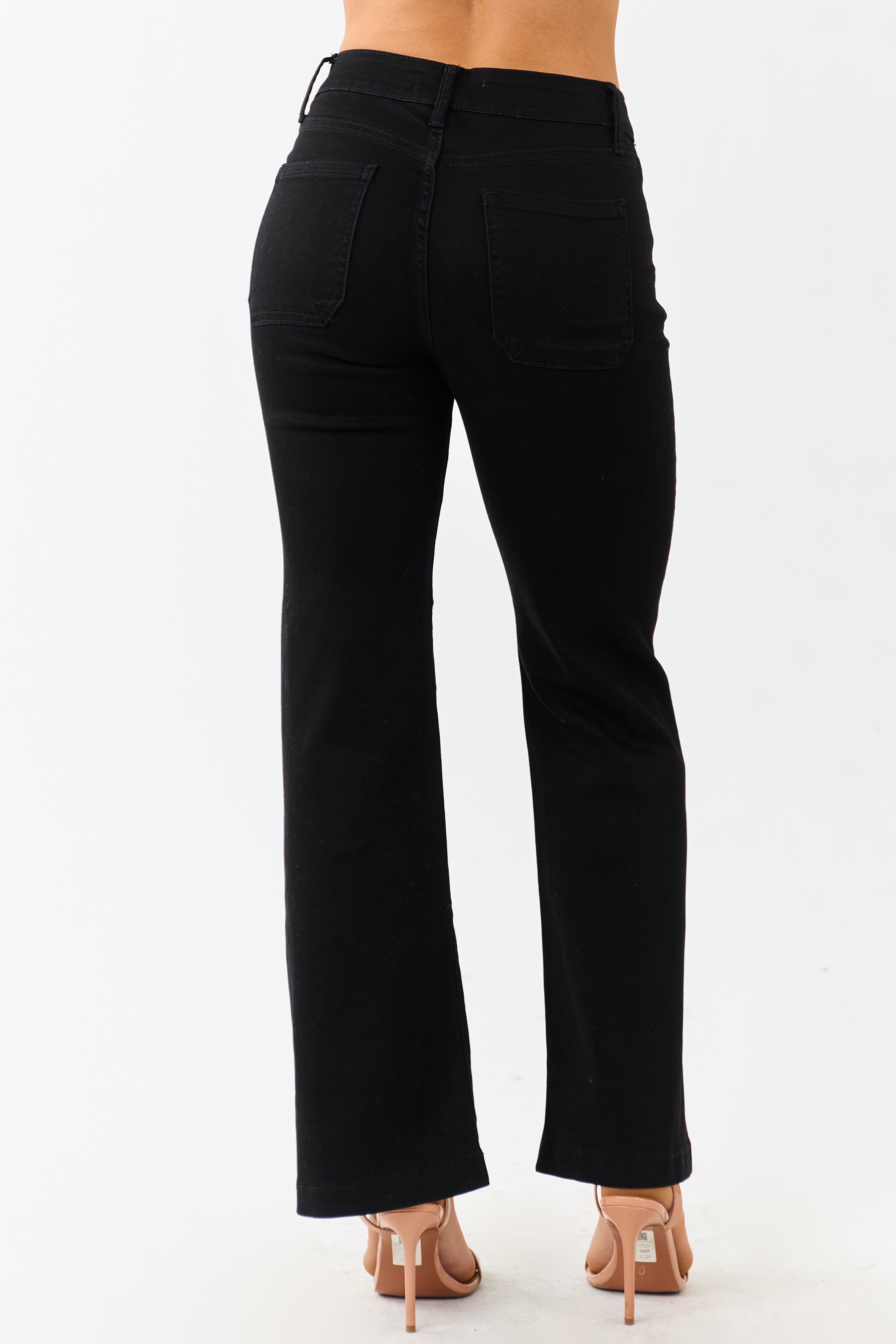 These black stretch denim flare jeans with cute patch pockets offer a comfortable fit, featuring a mid-rise design with a zipper fly and button closure. Made of 70% Cotton, 21% Polyester, 8% Rayon, and 1% Lycra, these jeans are very fitted in the hips and have an inseam of 29.5″. Whether for a casual day out or a night on the town, these jeans will complement any outfit. Order now and elevate your style!