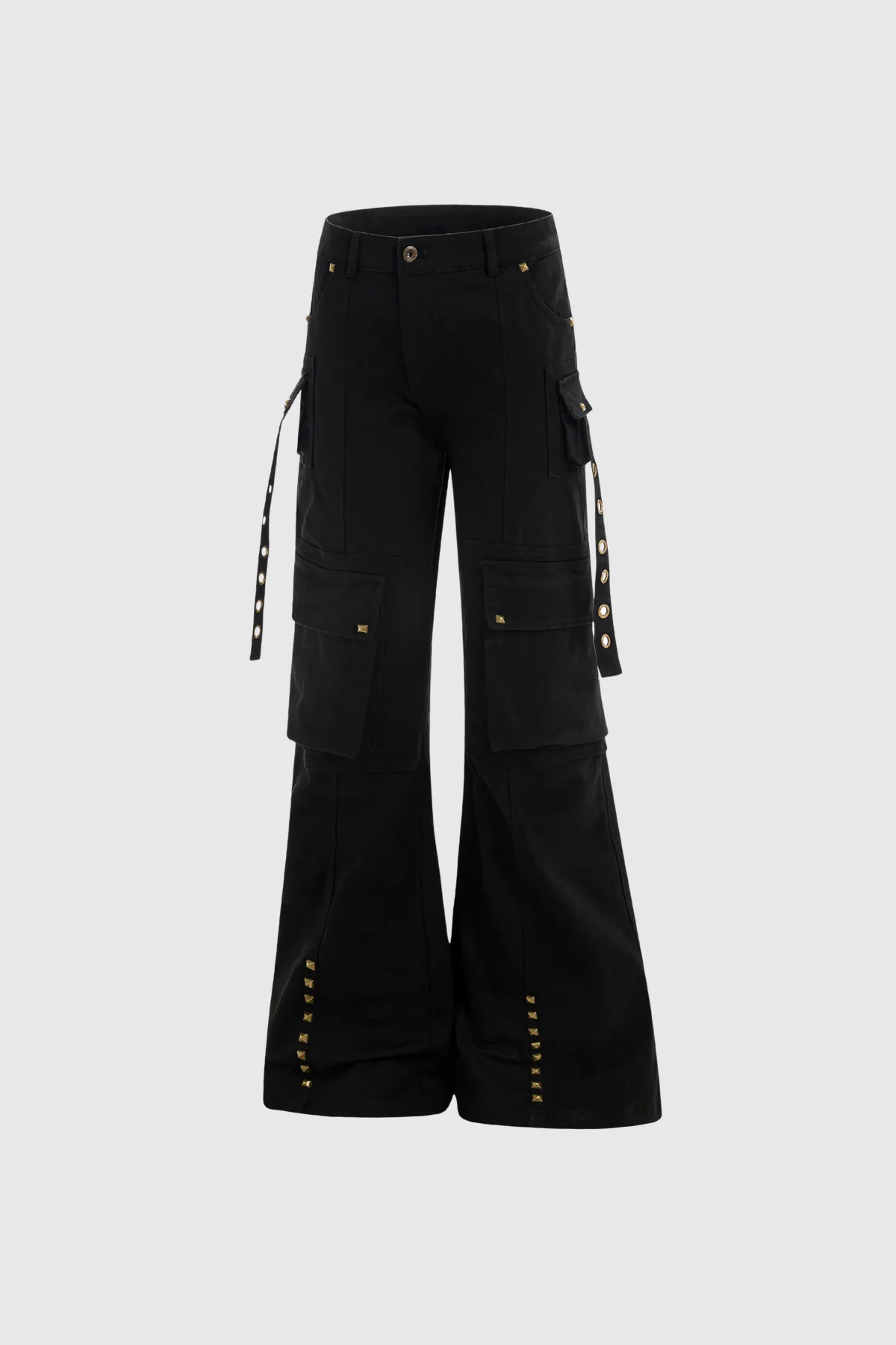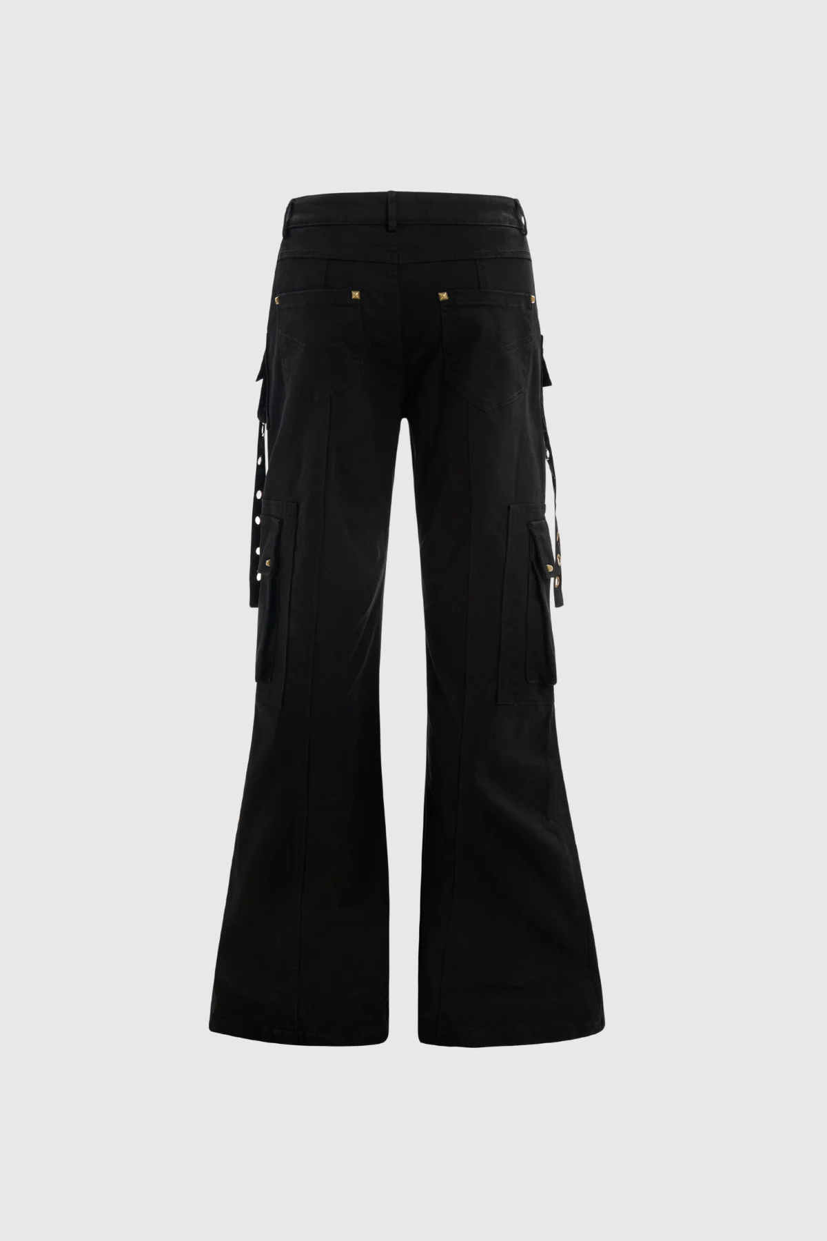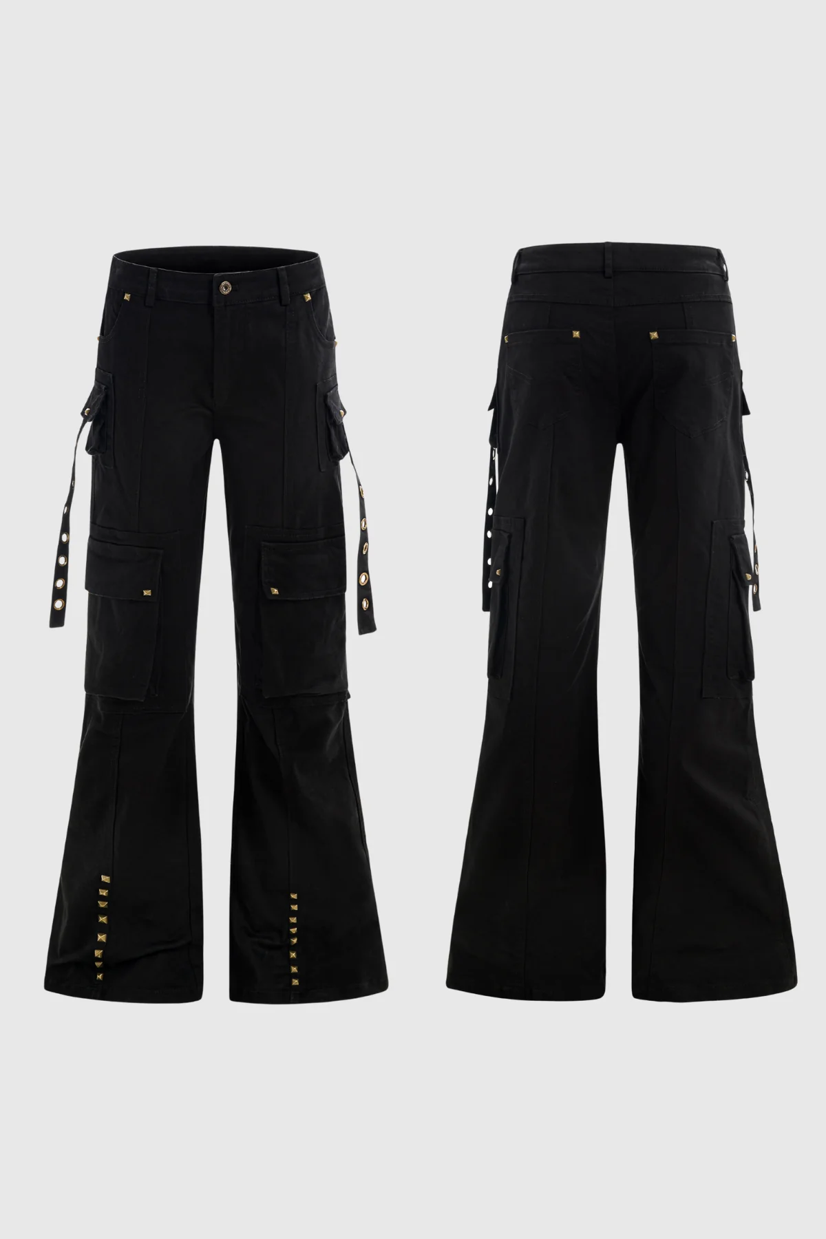 Elevate your style with the Black Studded Cargo Bootcut Jeans . Designed for versatility, these jeans blend edgy accents with practical features like durable cargo pockets and subtle studs. The bootcut silhouette ensures a balanced look that pairs effortlessly with various footwear, suitable for all occasions. Crafted for lasting comfort and durability, these non-stretch jeans are a fashion-forward staple in any wardrobe. Make a statement while staying comfortable and chic with these urban edge jeans. Color may vary slightly due to lighting. Machine wash gentle for best care.