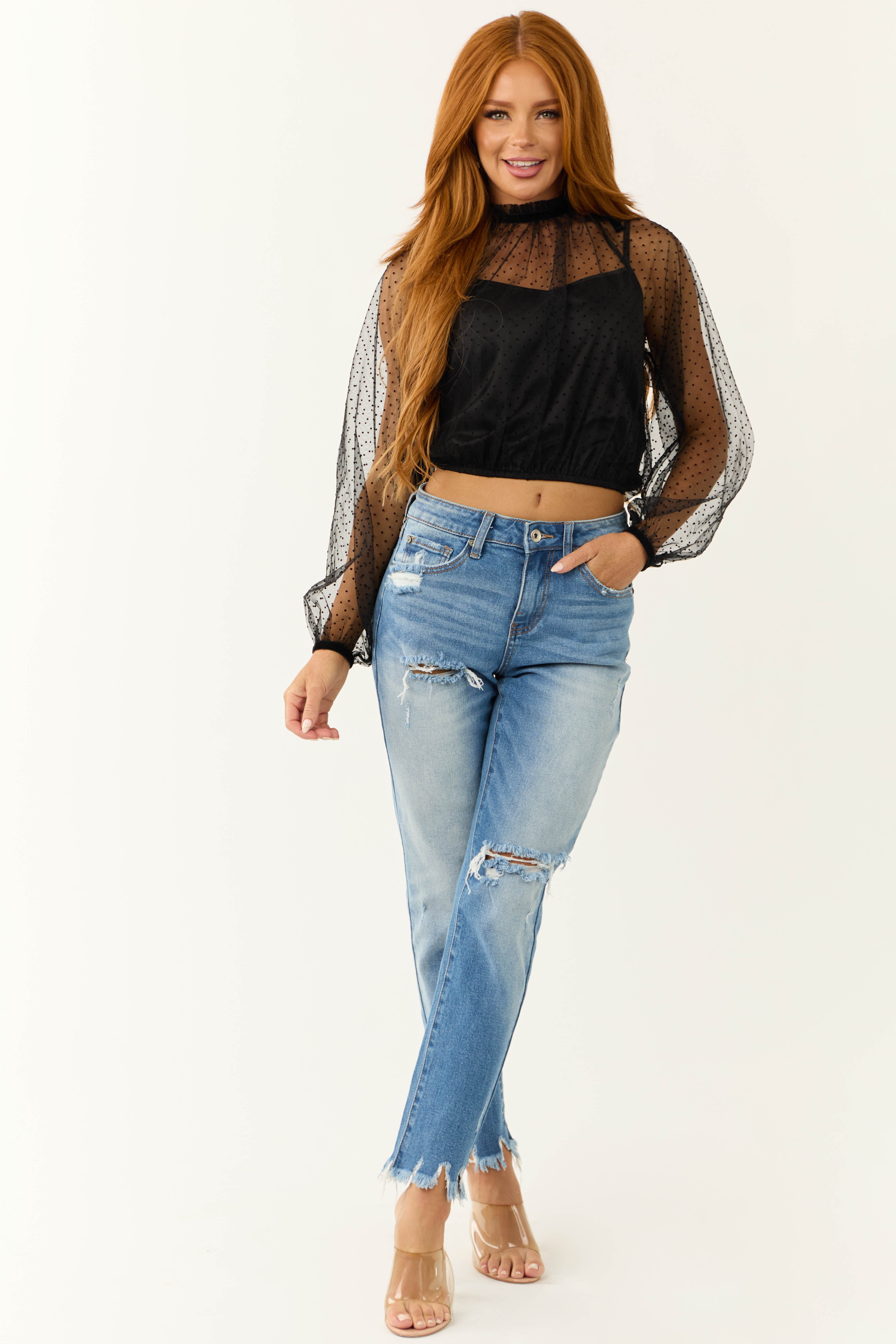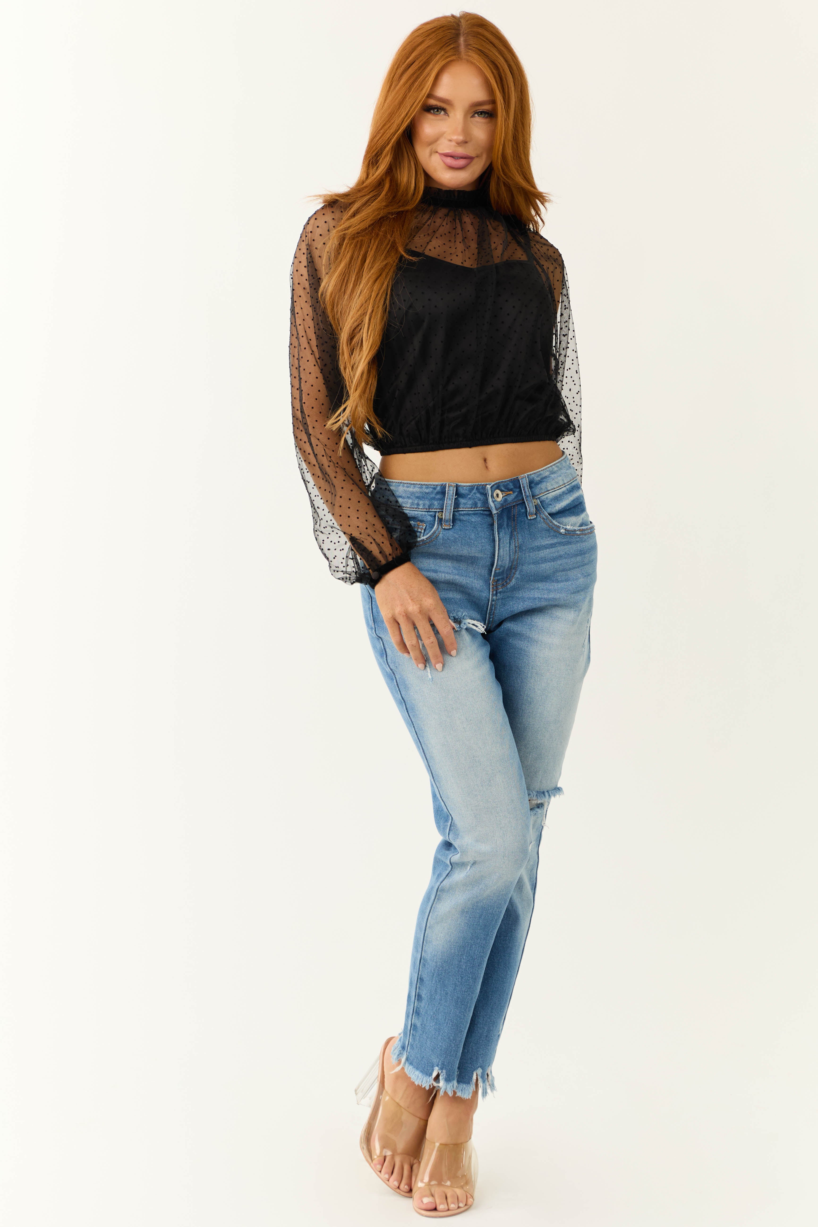 Elevate your wardrobe with this stunning Black Textured Mesh Long Sleeve Top. Crafted from semi-stretchy mesh, it features a frill high neck, back keyhole with tie closure, and button cuffs for a touch of elegance. The top comes with an attached V-neck satin camisole for added style. Perfect for date nights or any special occasion. Available in sizes S, M, and L. Hand wash cold, separately, hang to dry. Model is wearing size Small, measuring 55″ tall with a 31″ bust and 24″ waist.
