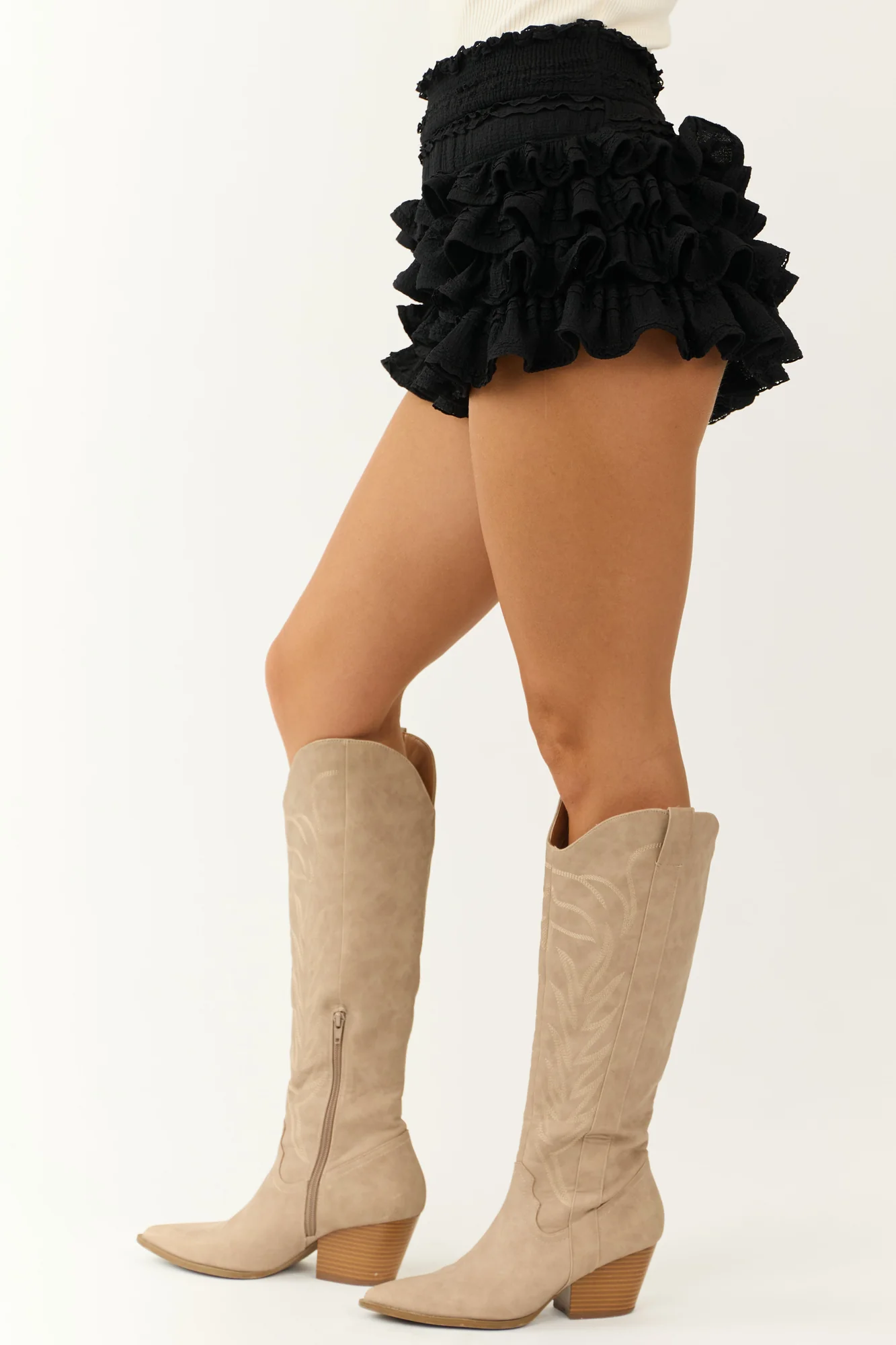 The Black Textured Tiered Ruffle Mini Skort offers a stylish and versatile addition to your wardrobe. Available in sizes S, M, and L with waist measurements ranging from 20-36 inches, this skort features a non-stretchy knit construction with shorts lining for comfort. The stretchy waistband provides flexibility, while the materials include 75% Nylon and 25% Polyester in the self layer and 100% Rayon in the lining. Ideal for various occasions, this imported skort with a 12-inch length and 1.25-inch inseam is perfect for both daytime and evening wear. Please note that it requires dry cleaning and should not be bleached or tumble dried. Model is wearing a size Small. Models measurements: Size 1, Height 57″, Bust 34″, Waist 26″.