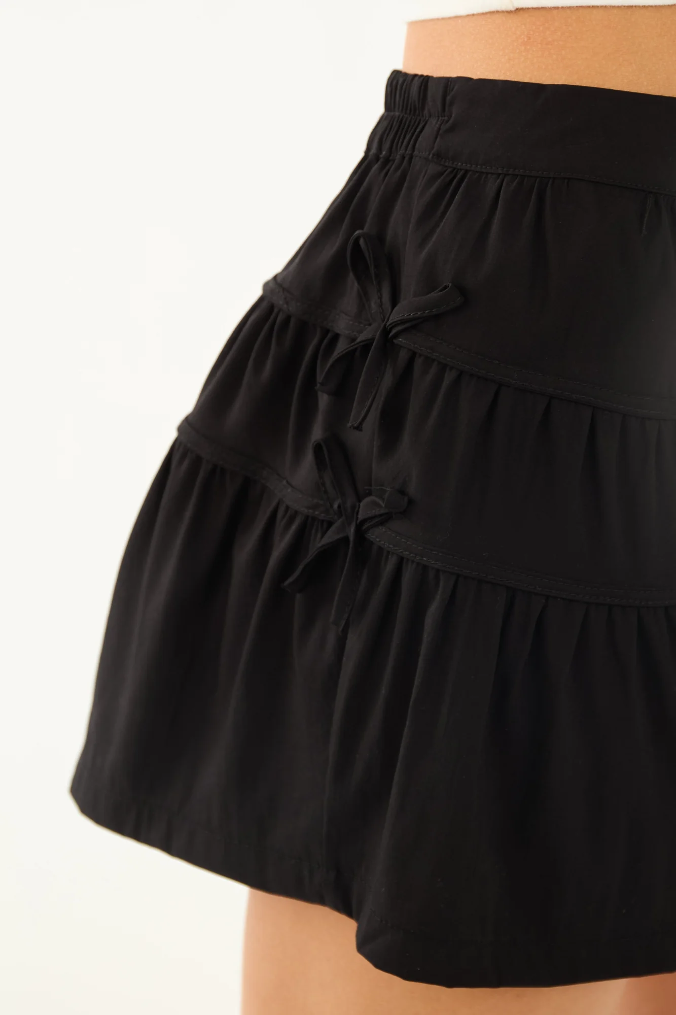 The Black Tiered Smocked Waist Shorts feature a stylish side bow detail and a comfortable elastic waist that allows for extra room. Available in sizes S, M, and L with waist measurements of 28-34 inches and hip measurements of 42-48 inches. Made of 55% Rayon, 40% Nylon, and 5% Spandex, these non-stretchy woven shorts are perfect for spring and summer outings. Hand wash cold to preserve the rich black color. Model is wearing a size Small.