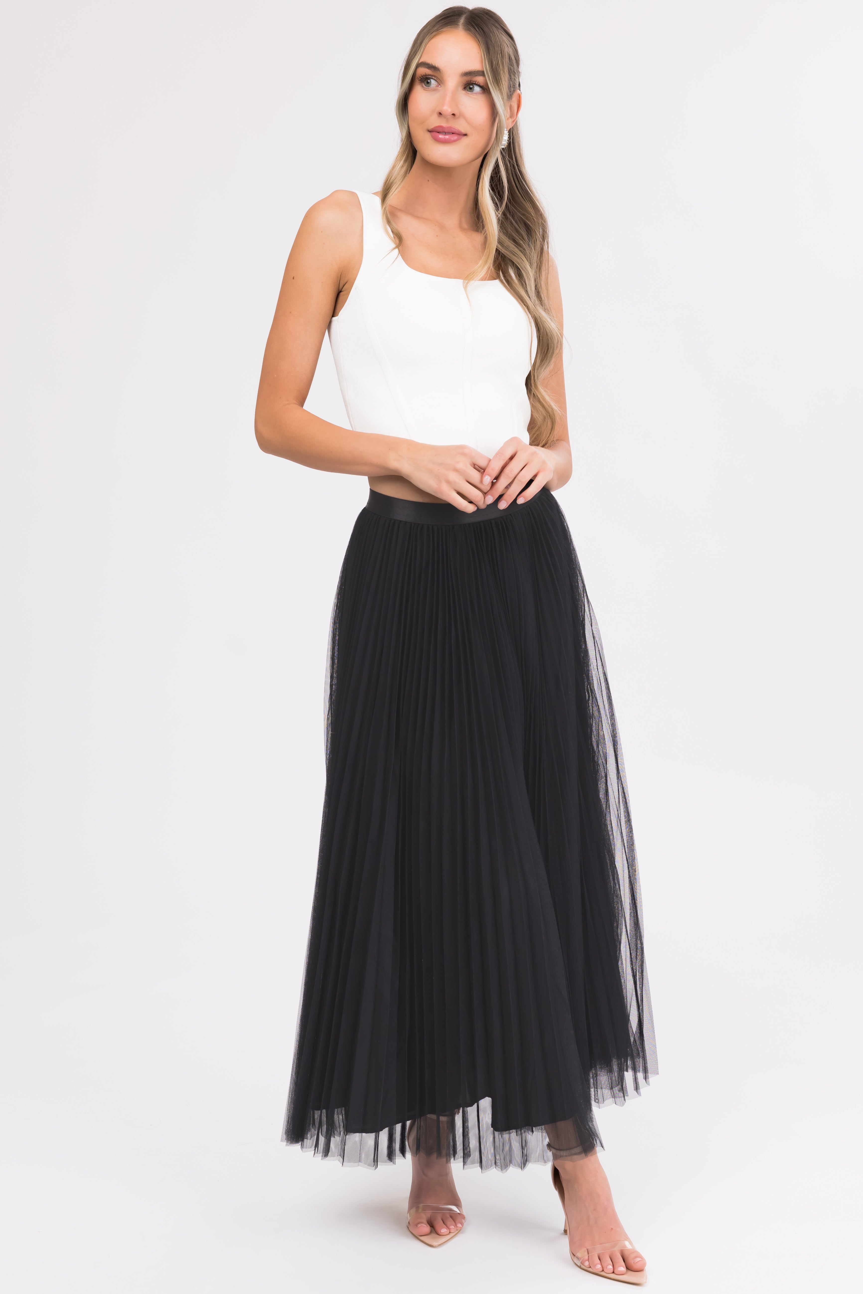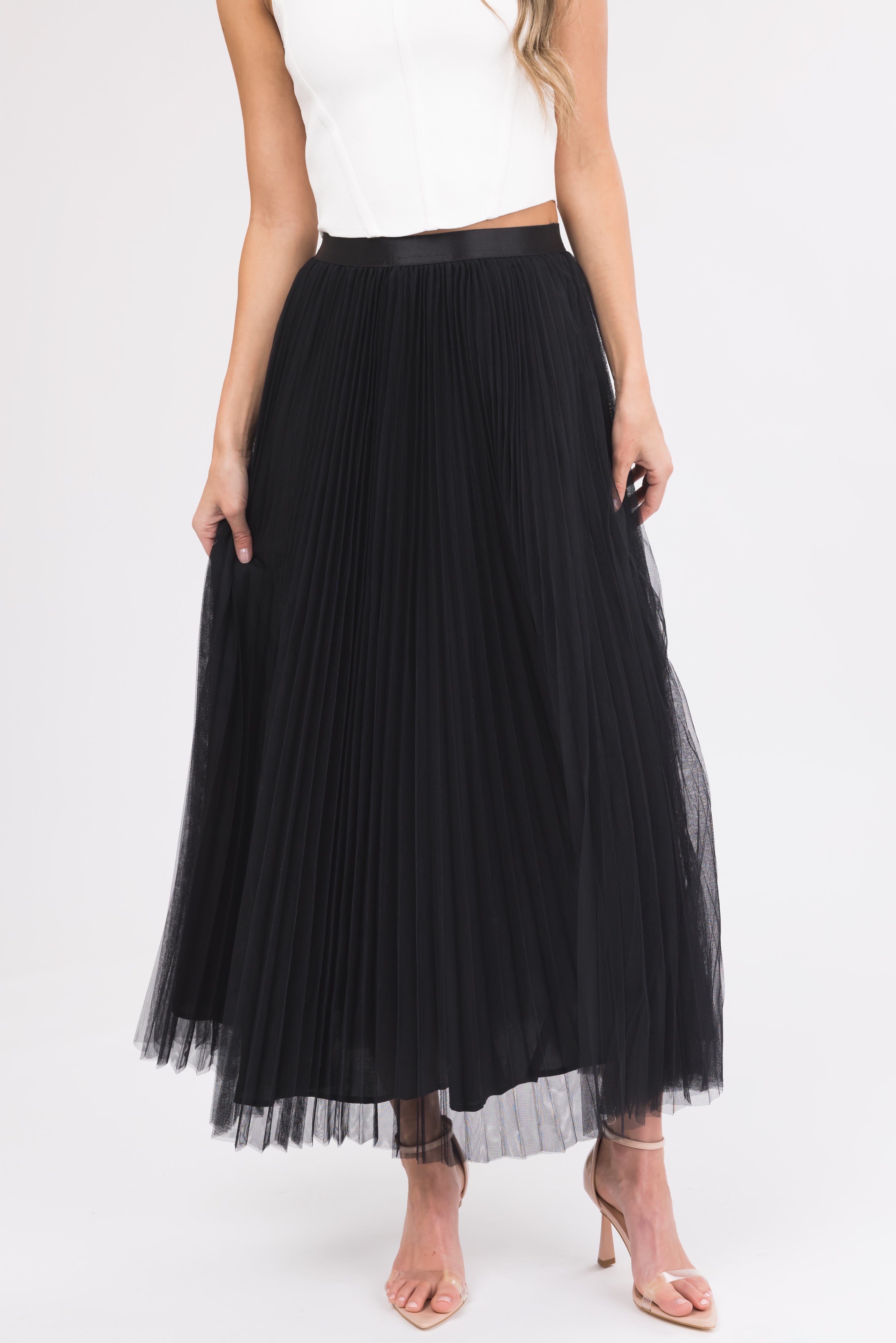 Experience elegance with our Black Tulle Pleated Midi Skirt! Crafted from non-stretchy mesh tulle and lined with 100% Polyester for comfort. This high-waisted skirt features an elastic waist for a perfect fit. Imported with attention to detail, it is available in S, M, and L sizes. Pair it effortlessly for daytime or date night occasions. Care instructions: Hand wash cold separately, colors may bleed, do not bleach, hang to dry. Model is wearing size Small. Elevate your wardrobe with this sophisticated piece!