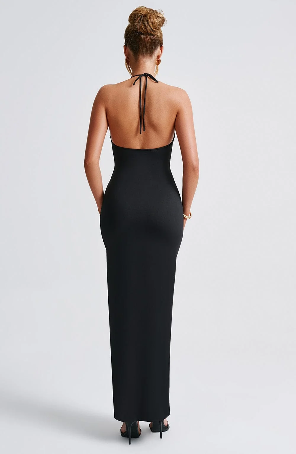 Elevate your style with the striking black Twist Detail Halter Neck Maxi Dress by DIA. Crafted from premium slinky jersey fabric, this form-fitting design features twist detail cups, high apex cups, and a flattering thigh-high split for an alluring look. The halter neck tie adds a chic touch, while the dress molds beautifully to your figure. Perfect for occasions like parties, weddings, or evenings out, this dress exudes confidence and sophistication. Pair it with tonal heels and accessories for a timeless ensemble that will turn heads wherever you go. Embrace elegance and grace with this stunning black maxi dress. Available in sizes XS to XXL.