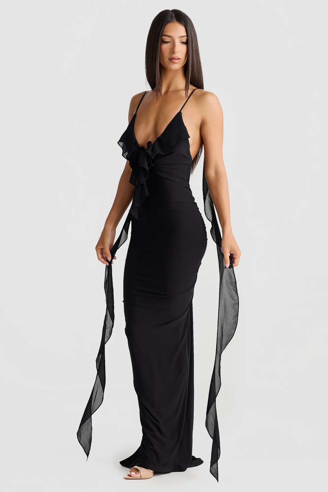 Get ready for a romantic night in this black backless maxi dress. Perfect for special events, this dress features adjustable straps, delicate ruffles, and a touch of playfulness that will steal the show. Fully lined with a lightweight, floor-length design, it offers comfort and style. Made of stretch fabric to ensure a perfect fit. Model is 167cm tall and wears size S.