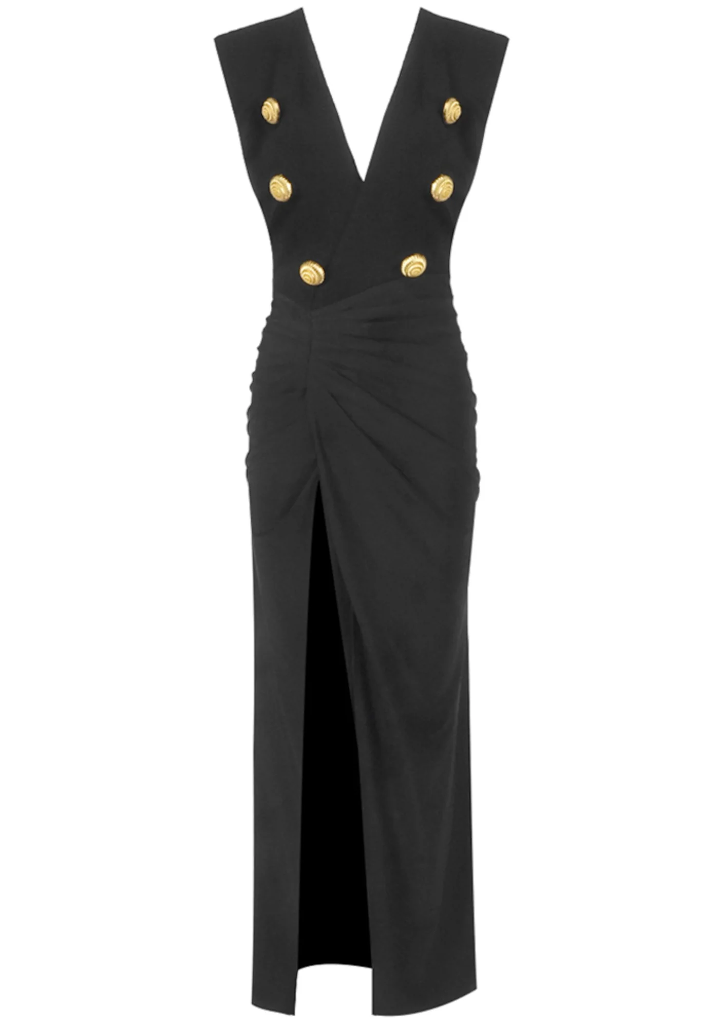 This elegant black maxi dress features a V-neck, sleeveless design with button detailing and an exposed zipper at the back for easy wear. Made of durable polyester and cotton blend, it ensures comfort and style. Carefully crafted with high-quality stitching and a YKK zipper for lasting wear. Keep it looking its best with gentle dry cleaning. Enjoy the versatile black color that suits various occasions. Please note that the actual product color may vary slightly due to lighting. Elevate your wardrobe with this timeless piece today!