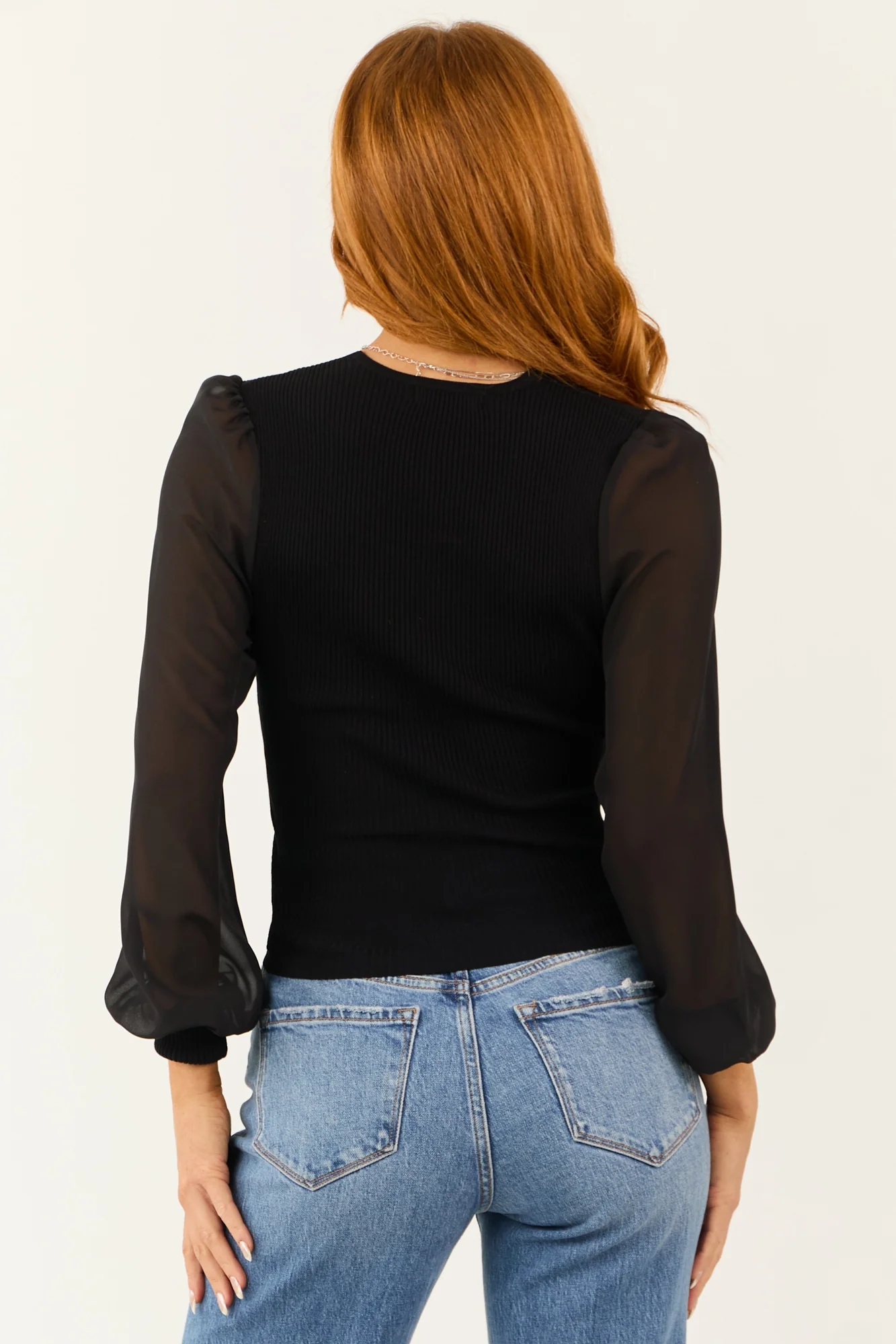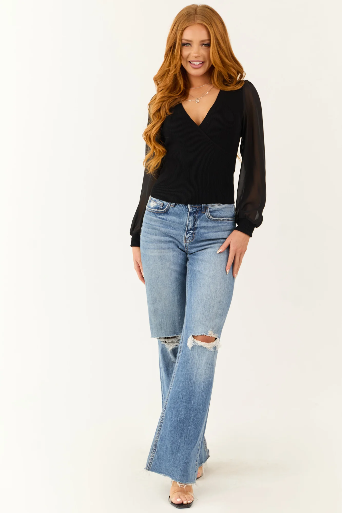 Stay cozy and chic in this Black V-Neck Chiffon Sleeve Sweater available in sizes S, M, and L. Crafted from a stretchy knit with ribbed cuffs, long chiffon sleeves, and unlined finish. The front features a stylish surplice V-neckline for a flattering look. Made of 70% Rayon and 30% Polyester with contrasting 100% Polyester sleeves. Perfect for everyday wear and can be dressed up or down effortlessly. Hand wash cold, line dry, iron low. Model is wearing a size Small – Height: 55″, Bust: 33″, Waist: 24″.