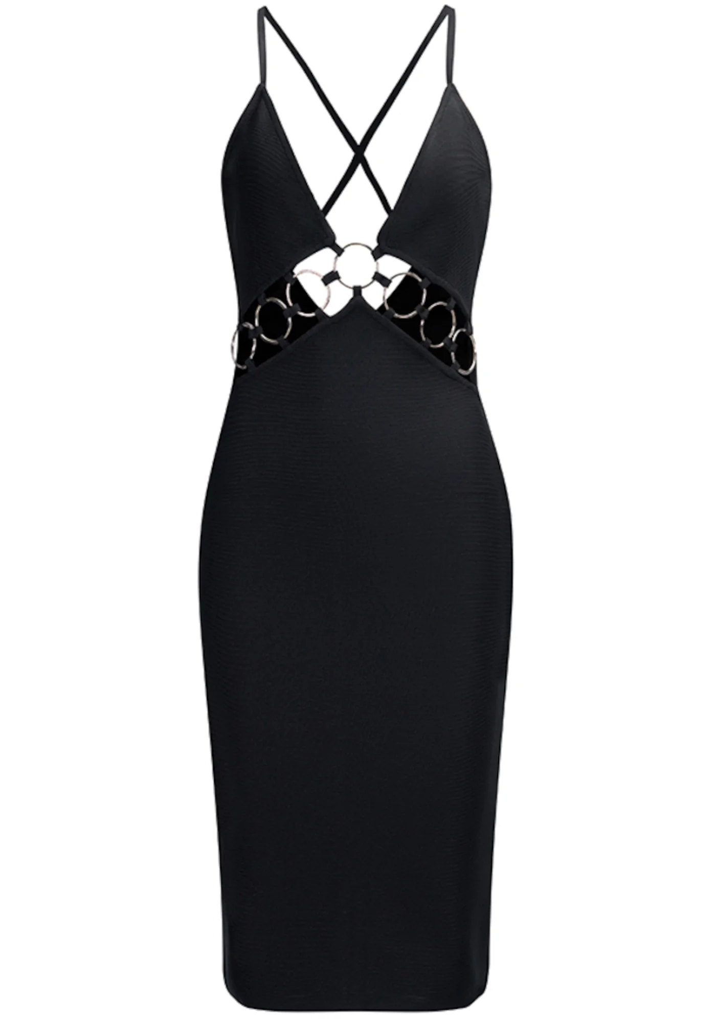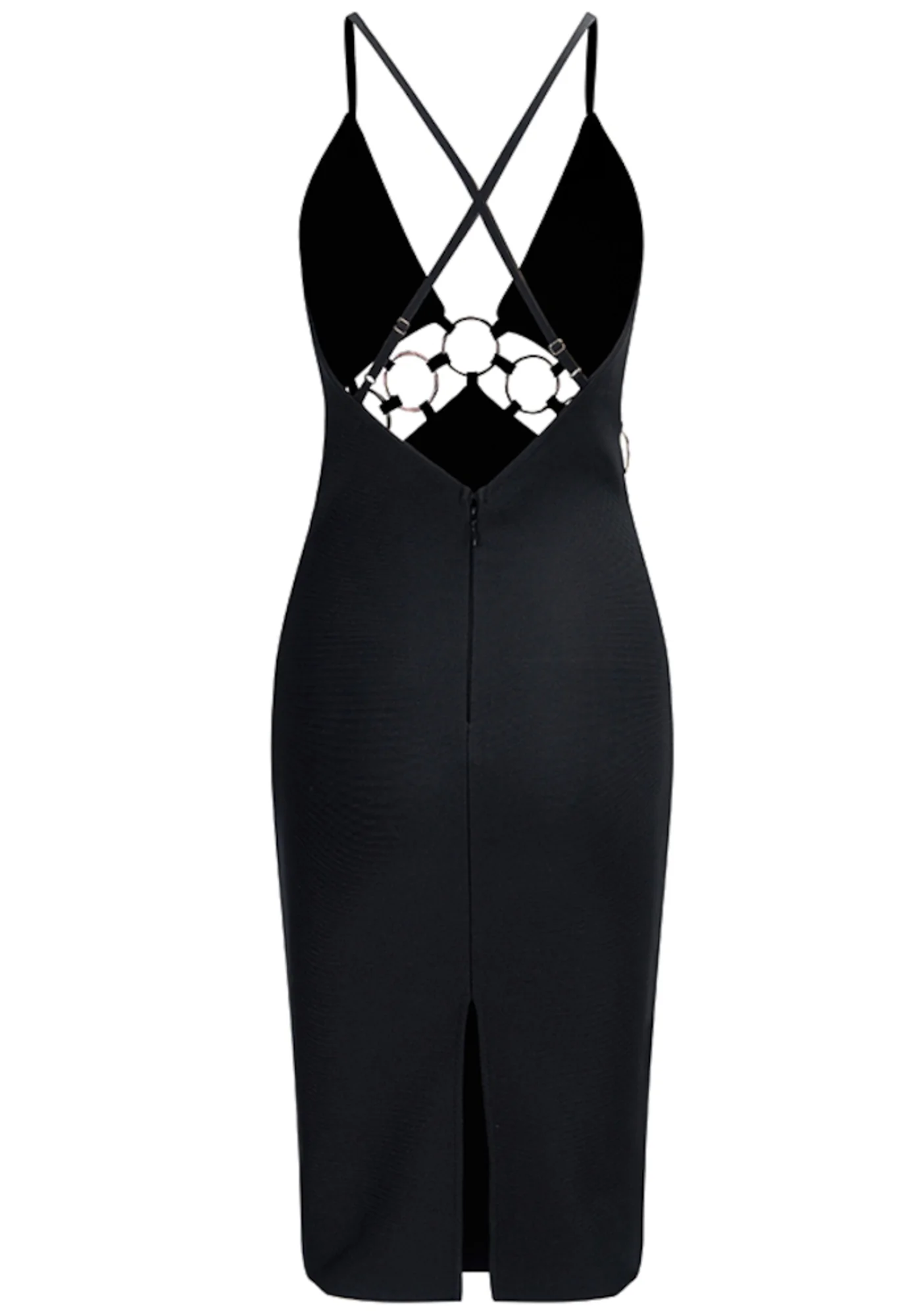 This elegant black midi dress features a V-neck, cut-out details, and adjustable spaghetti straps. Made of high-quality 90% rayon, 9% nylon, and 1% spandex for anti-wrinkle properties, bright colors, and durability. The high elasticity ensures a perfect fit while the YKK zipper adds reliability. Care instructions included. Perfect for various occasions. Color may vary due to lighting. Pair this knee-length dress with your favorite accessories for a sophisticated look.