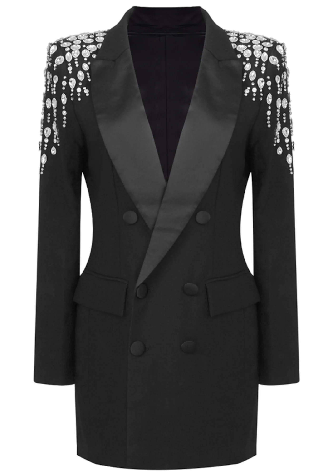 This gorgeous Black V-neck Blazer Dress features long sleeves and is embellished with rhinestones for a touch of elegance. The button detail adds extra charm, while the dress is made of high-quality Polyester, Cotton, and Silk blend. Carefully crafted with delicate sewing and hemming, using a durable needle lockstitch machine. Includes a YKK zipper for durability. Ensure lasting beauty with gentle dry cleaning. Variations: S, M, L, XL, XXL.