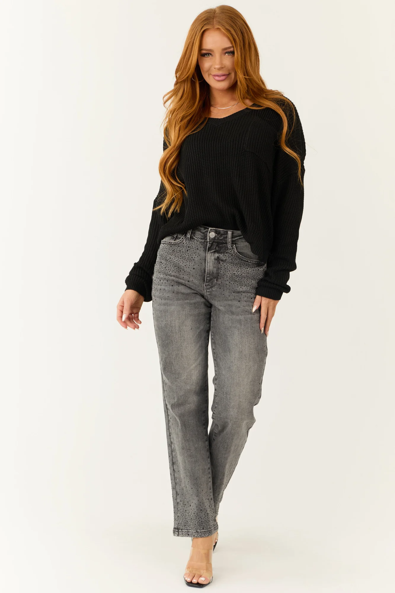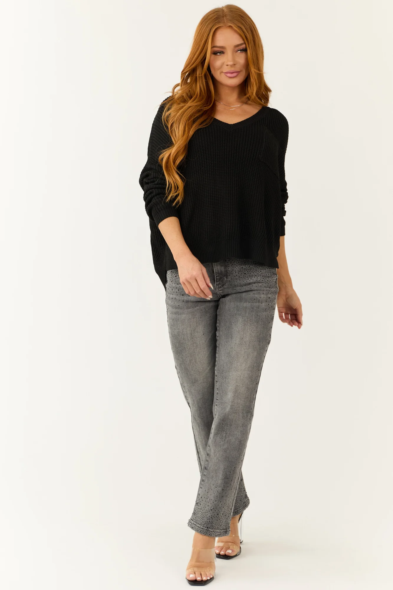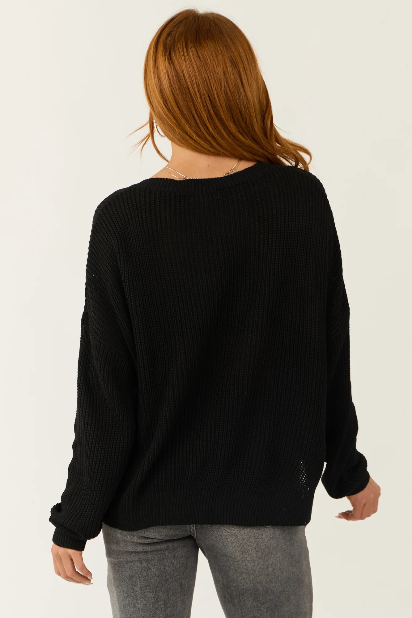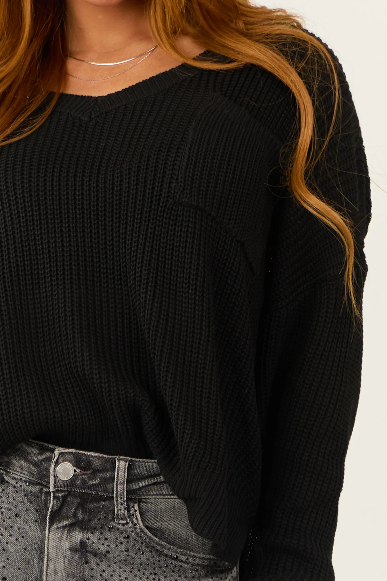 Stay cozy and stylish with our black V-neck knit sweater featuring a chest pocket. This oversized sweater boasts stretchy knit fabric, drop shoulders, banded ribbed trim, a V-shaped neckline, and long sleeves for a trendy look. Crafted from 95% polyester and 5% nylon, this sweater offers warmth and comfort. Hand wash cold and lay flat to dry for easy care. Available in sizes S, M, and L. Perfect for casual daytime wear during the winter season. Model is wearing a size Small.