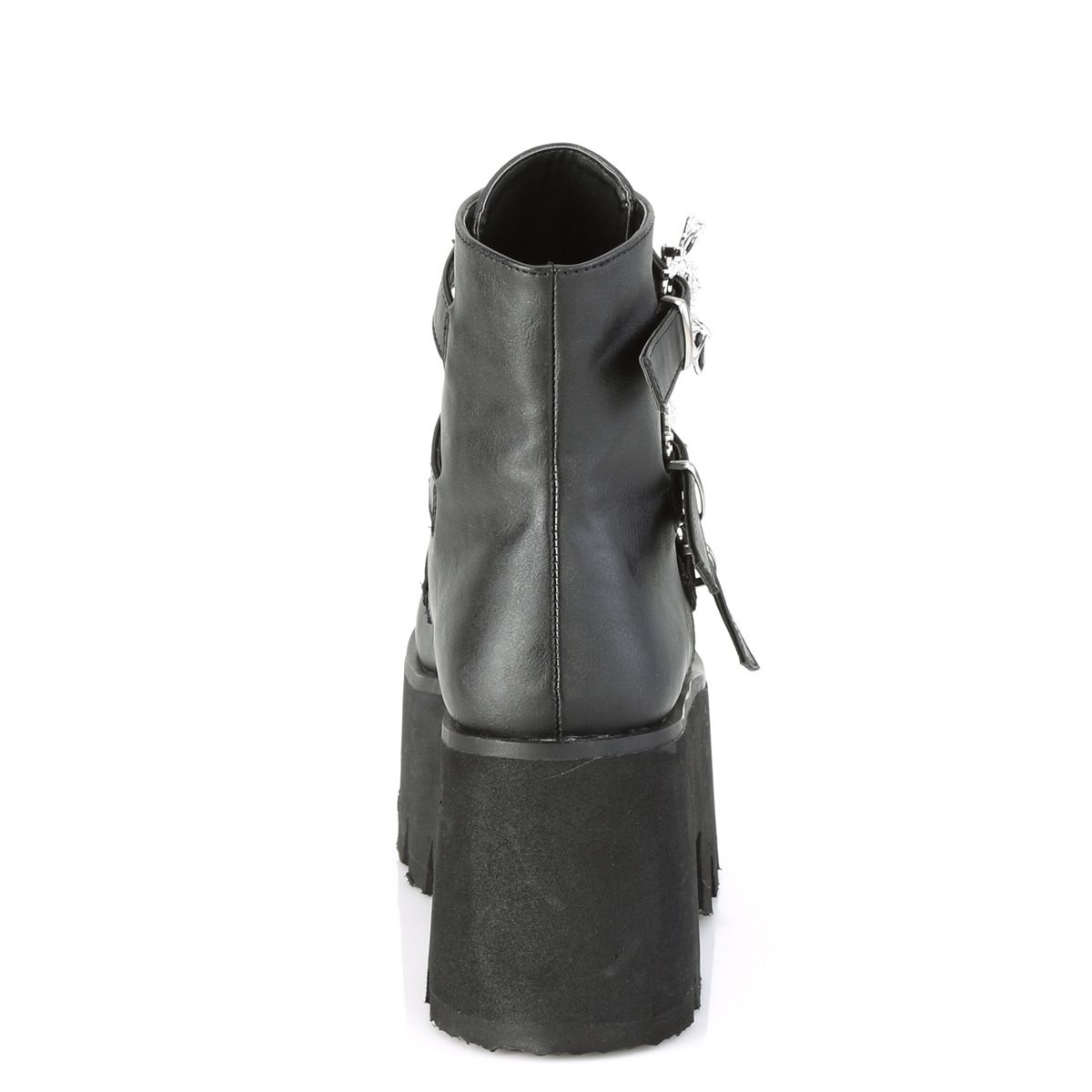 Step up your style with these stunning black vegan faux leather platform boots featuring a trio of studded straps with unique bat buckles. Comfortable and cool, these ankle boots boast a big platform for added height. The cruelty-free material ensures you can look fabulous guilt-free. Please note that the bat buckles have a matte finish in real life, enhancing the wickedly stylish look. Crafted with Vegan Faux Leather and an EVA sole, with a 3.5″/9cm heel, 9.5″/24cm calf circumference, and 5.5″/14cm shaft height. Elevate your fashion game with these statement boots!