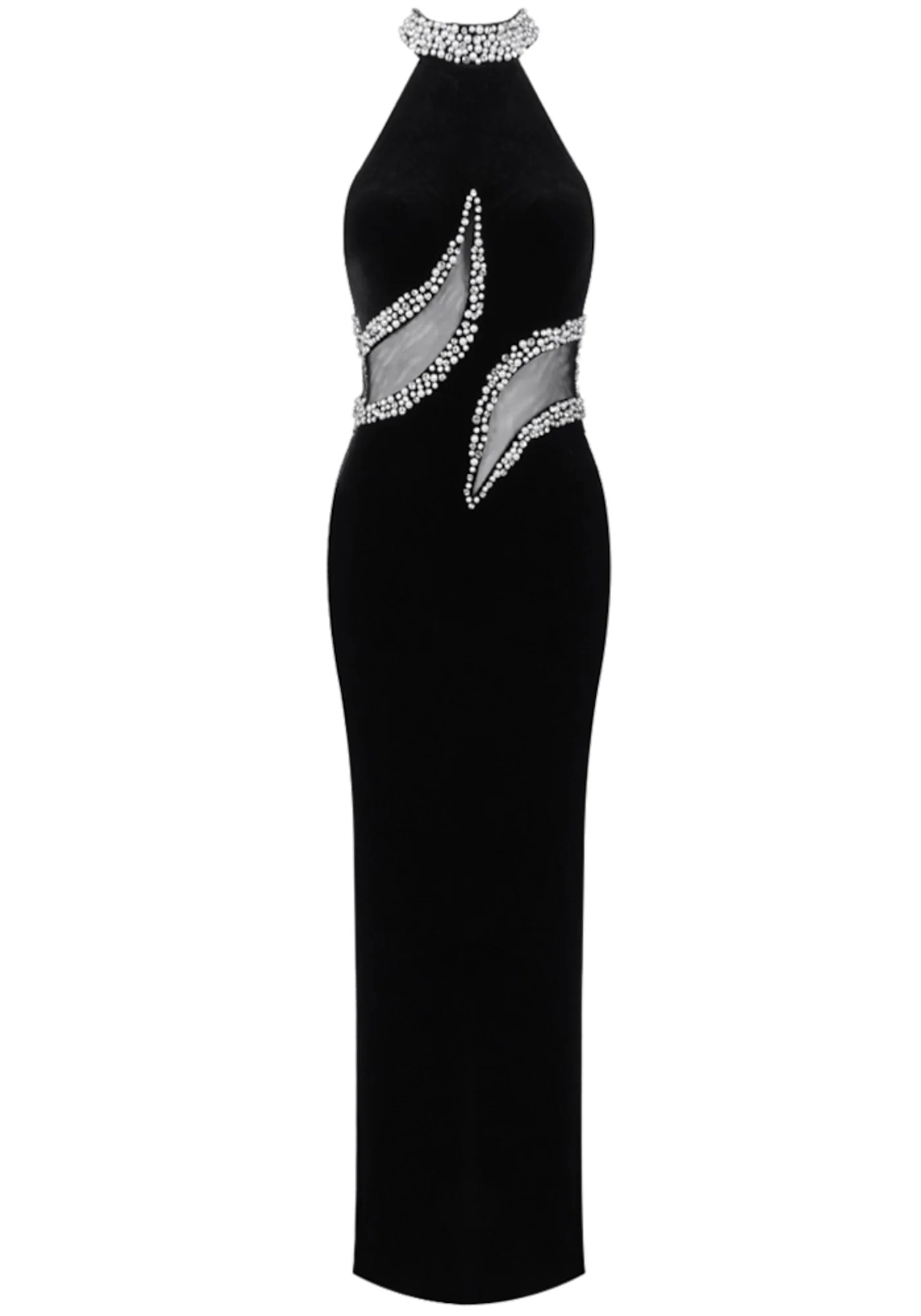 Indulge in the timeless elegance of this black velvet halter maxi dress adorned with delicate crystal embellishments. The sleeveless design features a mesh insert and a concealed YKK zipper for effortless glamour. Crafted from a blend of polyester, cotton, and velvet, this dress exudes luxury and sophistication. Maintain its beauty with gentle dry cleaning to enjoy every special occasion in style. Please note that color may vary due to lighting effects. Elevate your wardrobe with this exquisite piece from Night Novas.