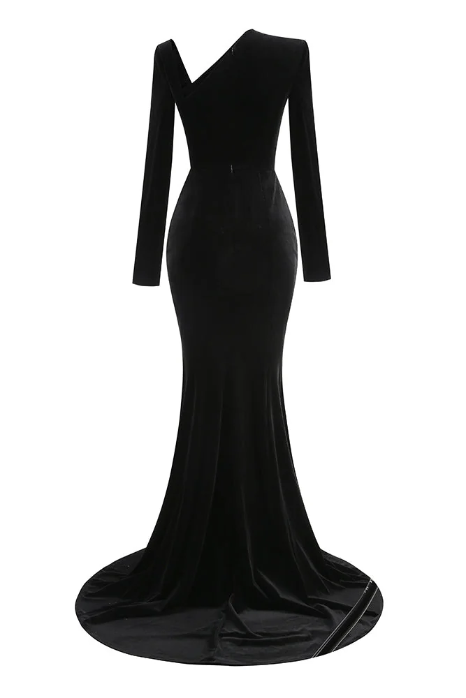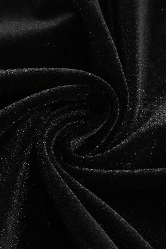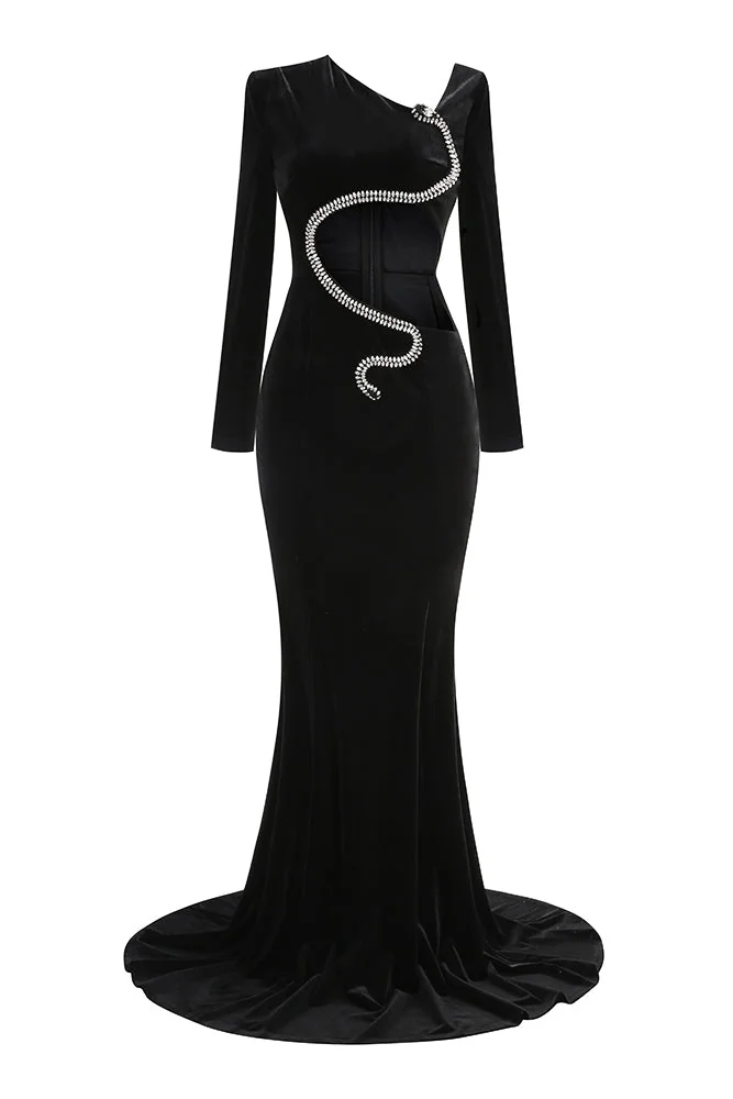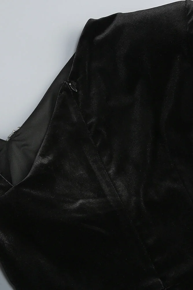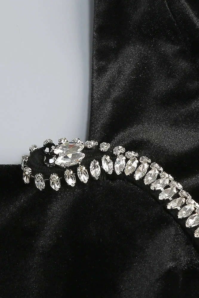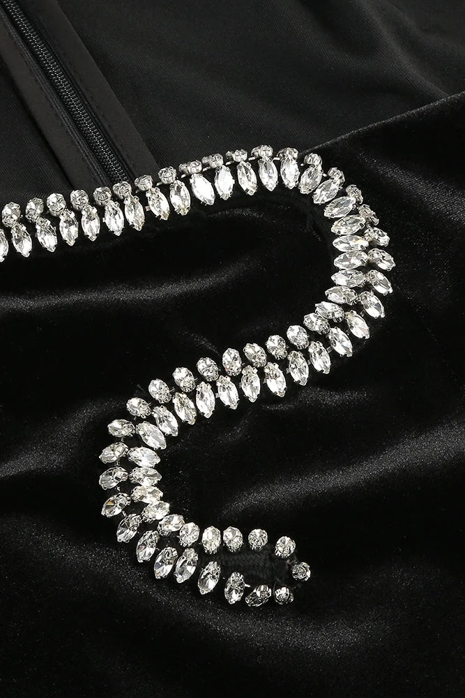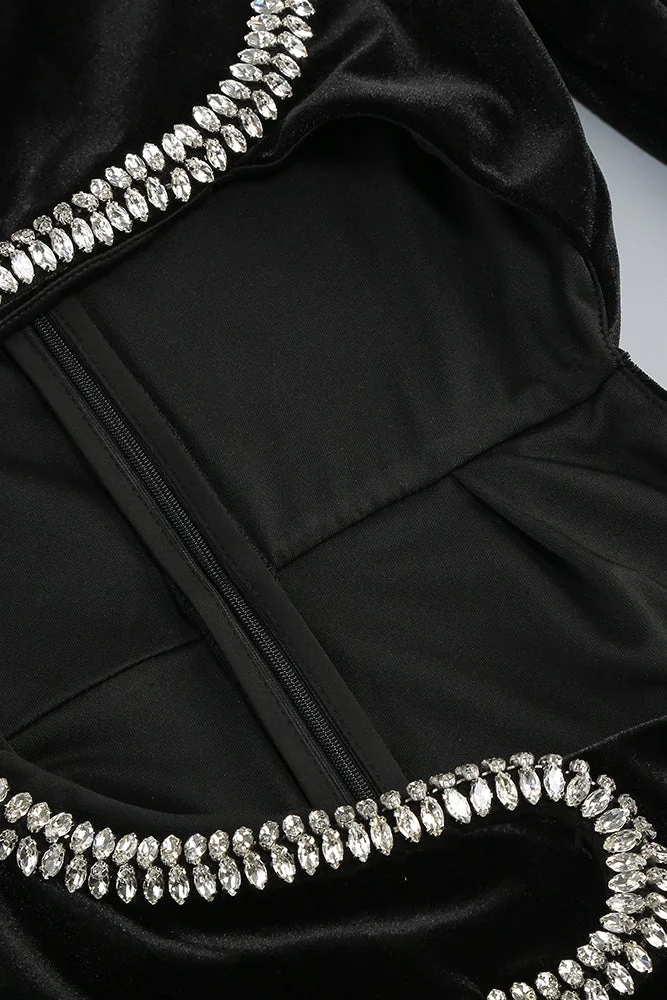 Stand out in elegance with our Black Velvet Rhinestone Paneled Maxi Dress. This stunning gown features rhinestone detailing, a chic cut-out design, and a floor-sweeping hemline for a show-stopping look. Made of luxurious velvet for comfort and style, perfect for formal events. Embrace luxury and glamour with this exquisite dress that is true to size for a flawless fit.