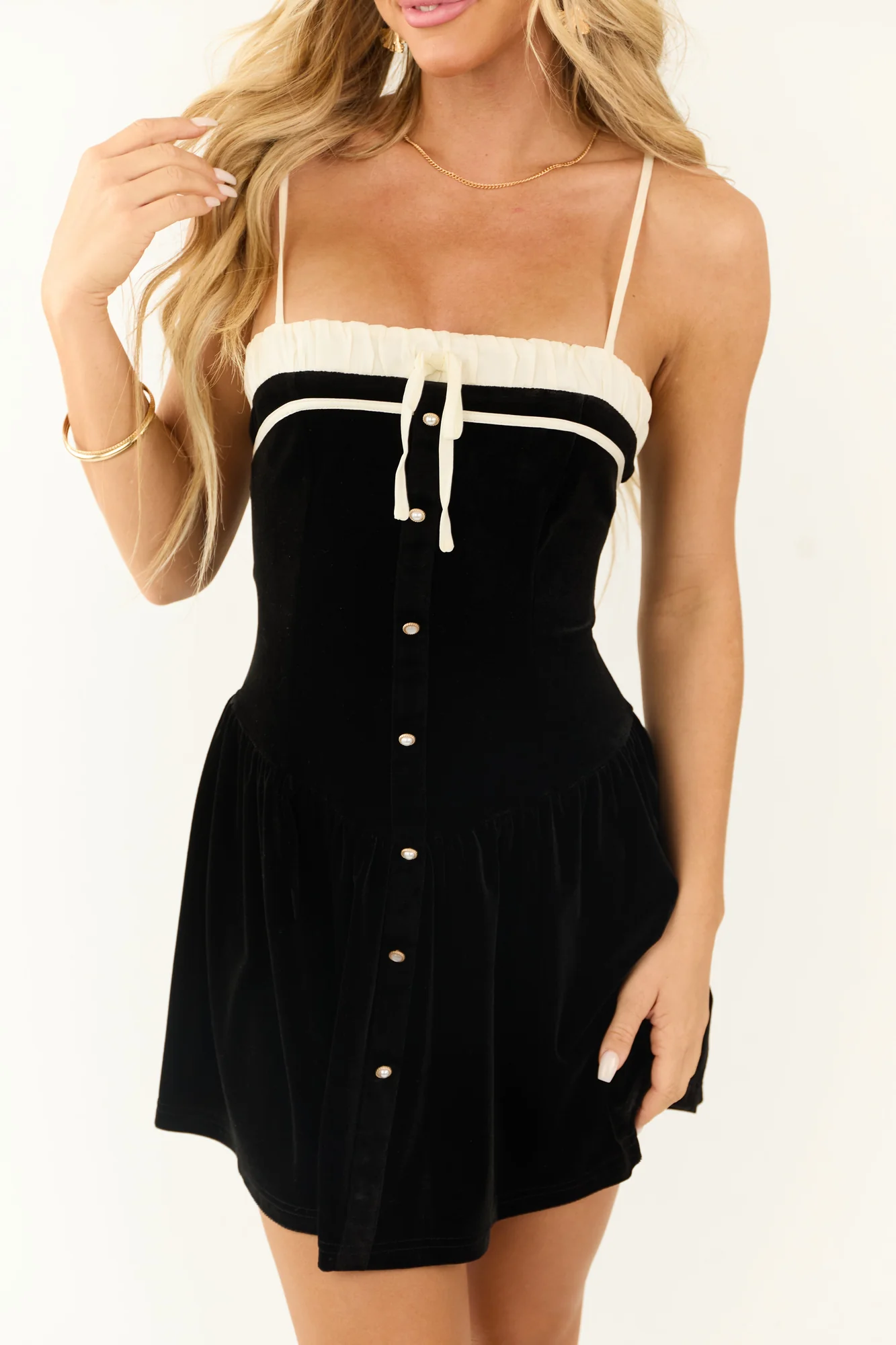 This Black Velvet Tie Detail Mini Dress is a chic and elegant choice for any occasion. With a pleated square neckline, adjustable straps, and non-functional buttons, this dress offers a corset style that enhances your silhouette. The contrast Ivory yoke stripe adds a touch of sophistication, while the semi-stretchy woven fabric ensures a comfortable fit. Perfect for date nights and holiday events, this dress is a must-have in your wardrobe. Hand wash cold, line dry, and low iron if needed.