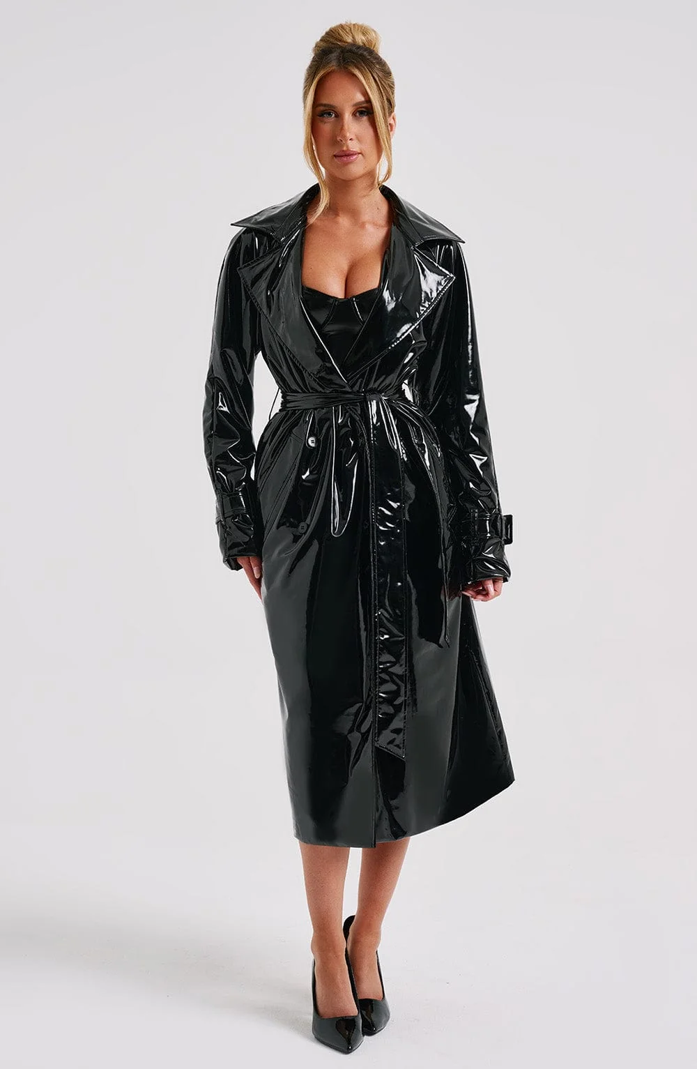 Elevate your wardrobe with our black vinyl trench jacket. Crafted from premium material, this stylish coat features a double-breasted design, waist-cinching belt, and a flattering midi length. Perfect for adding a touch of sophistication to any outfit. The trench jacket is a timeless classic that never goes out of style. Suitable for various occasions from evening events to everyday wear. Get yours now and experience the ultimate in chic outerwear!