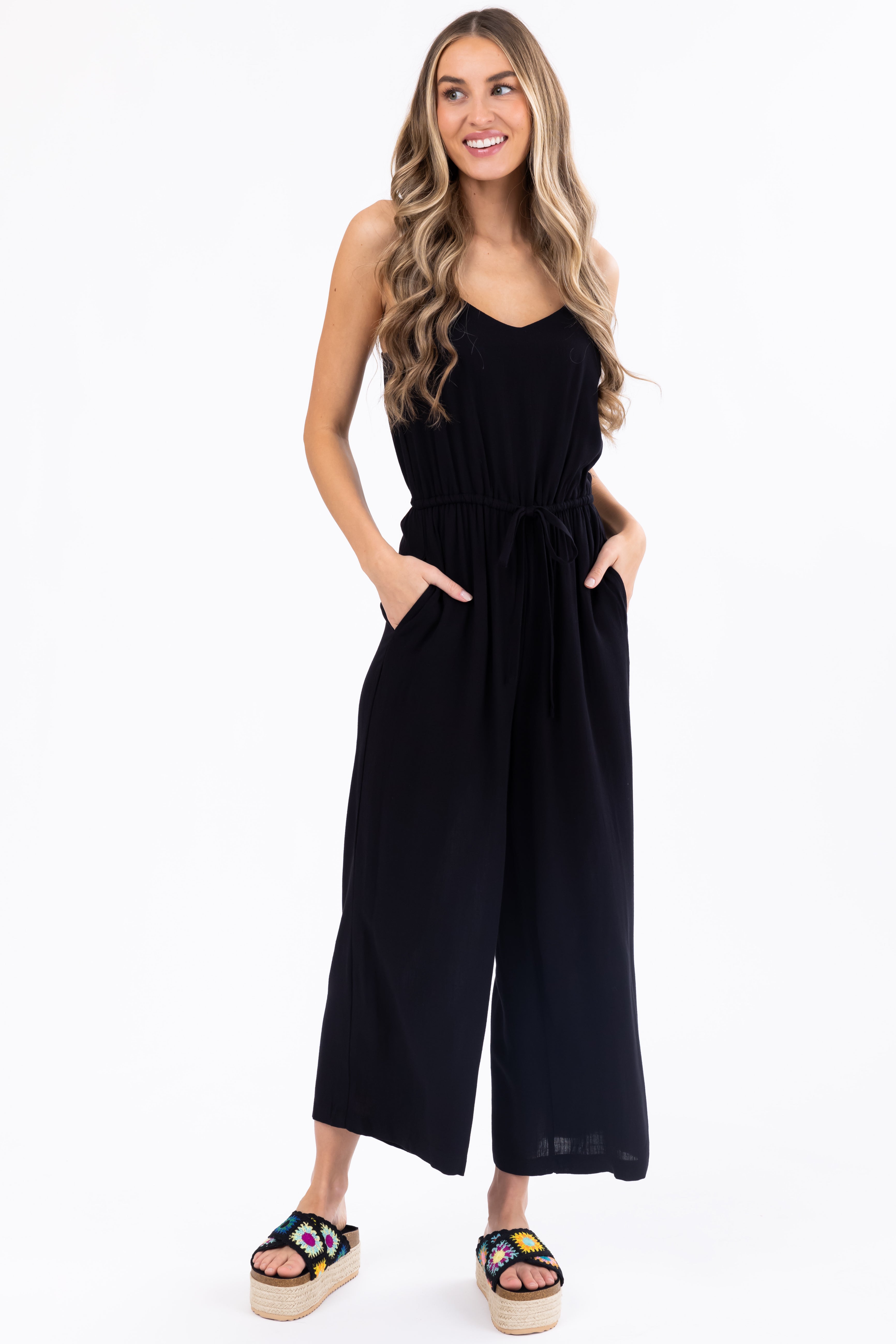 Stay chic and comfortable in this black sleeveless jumpsuit featuring a sweetheart neckline, adjustable straps, and side pockets. Made from 100% Rayon, this non-stretchy woven outfit includes an elastic waistband with a tie for a perfect fit. Perfect for daytime occasions, pair it with your favorite accessories. Hand wash cold and line dry for best care.