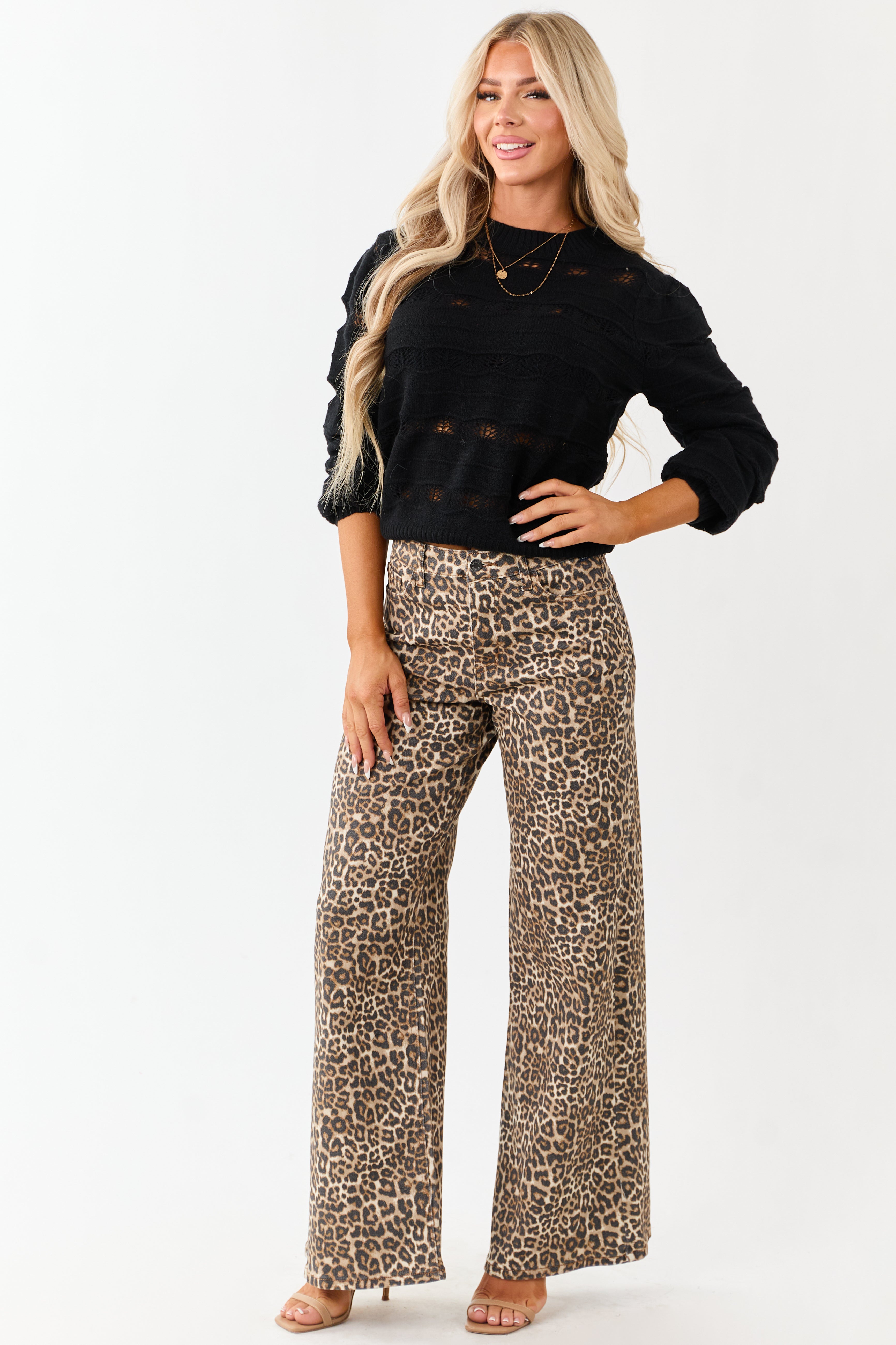 Stay trendy with our Black Wavy Stripe Knit Sweater available in sizes S, M, L, and XL. Youll love the dimension and breathability of the sheer open knit bands alternating with solid knit stripes. Featuring a stretchy ribbed banded trim and a slight puff shoulder, this sweater is made of 52% Acrylic, 25% Nylon, 23% Polyester for ultimate comfort. Ideal for any occasion, this sweater will elevate your style effortlessly.