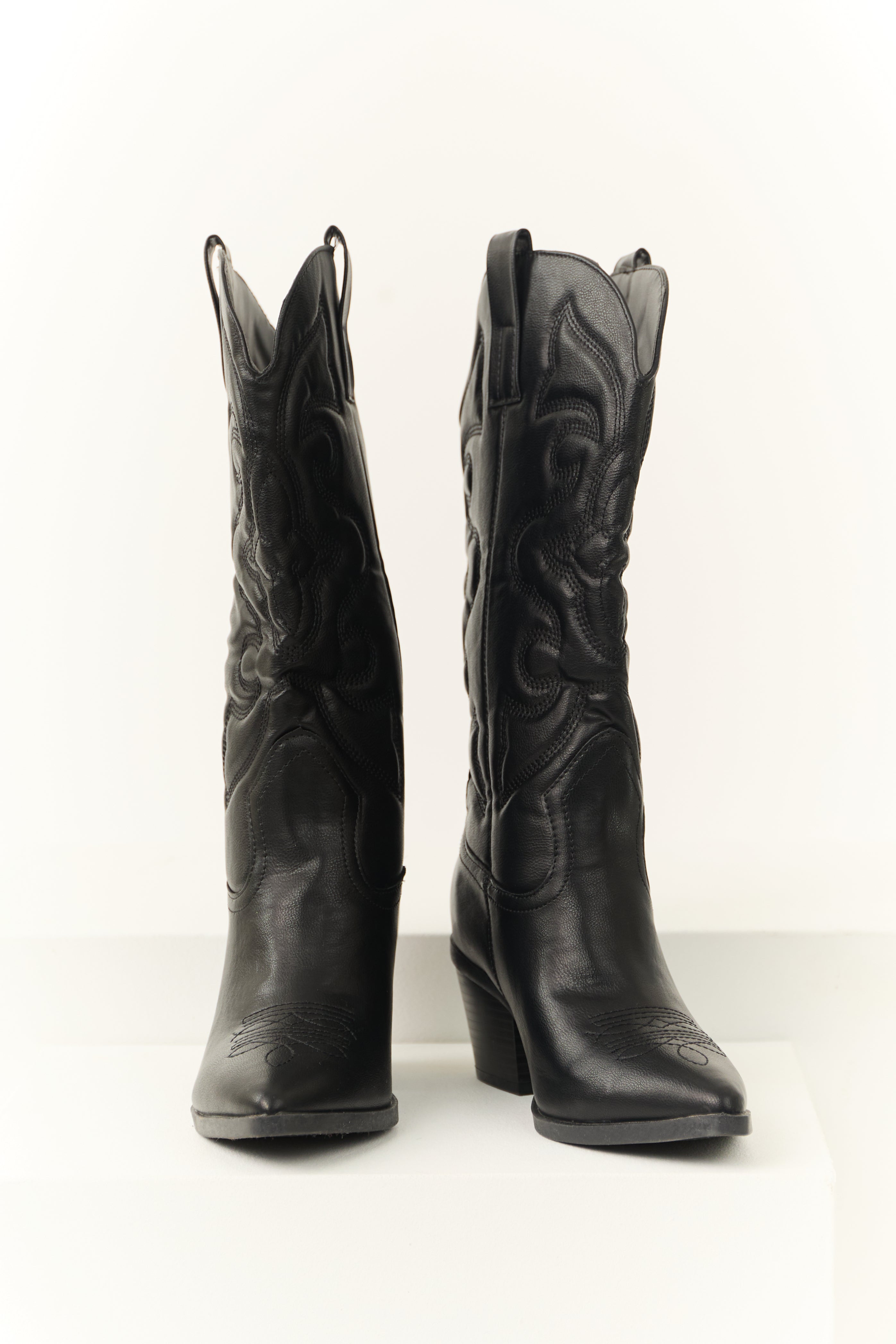 Experience timeless style and comfort with our Black Western Faux Leather Block Heel Calf Boots. Crafted from premium faux leather, these boots feature Western embroidery, a stacked block heel, curved opening, and side pull tabs for convenience. The 14″ shaft and 2.5″ heel offer a perfect blend of fashion and functionality. Imported and measured on size 8, these boots are a versatile addition to your wardrobe that exudes elegance and charm.