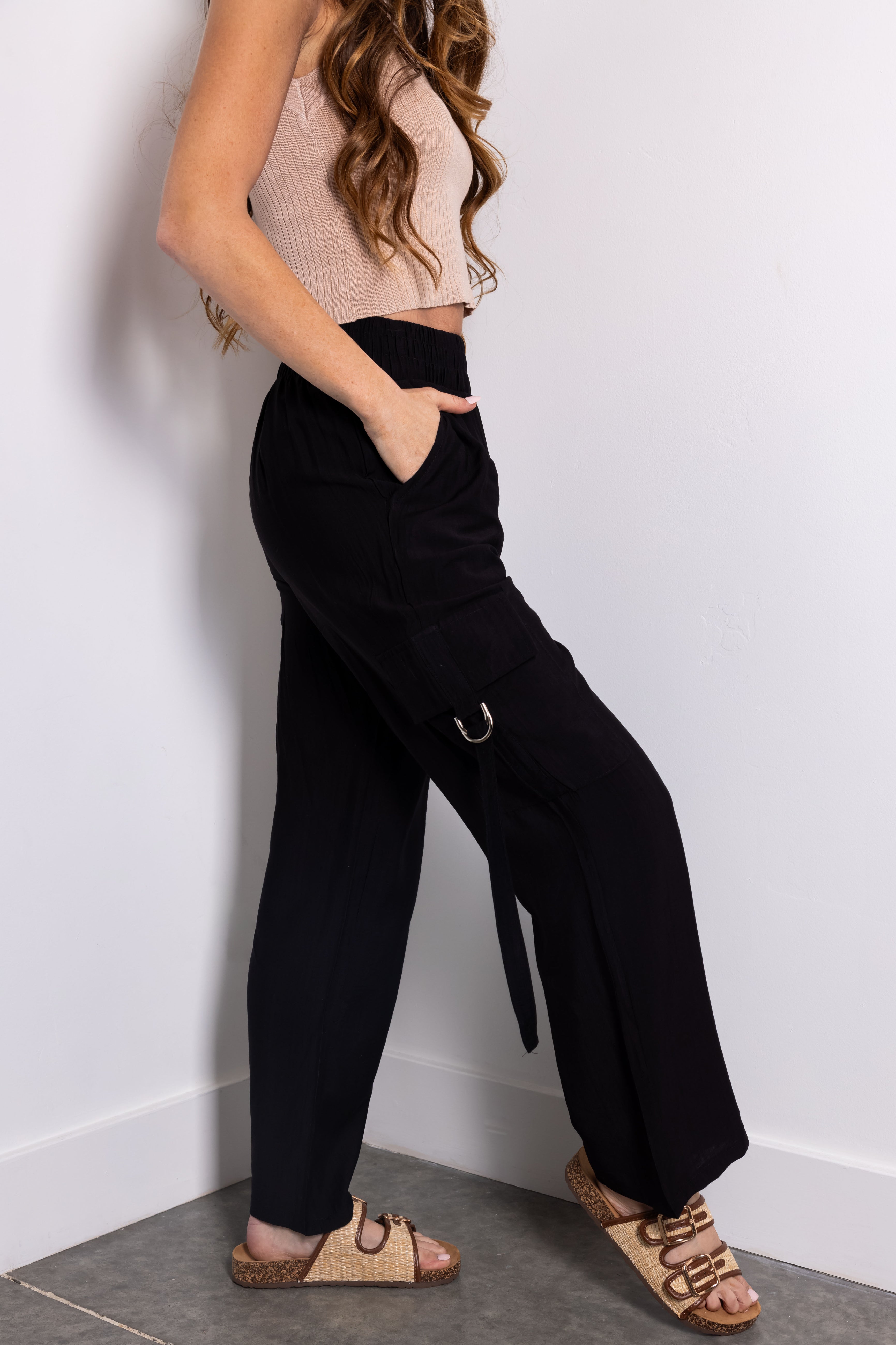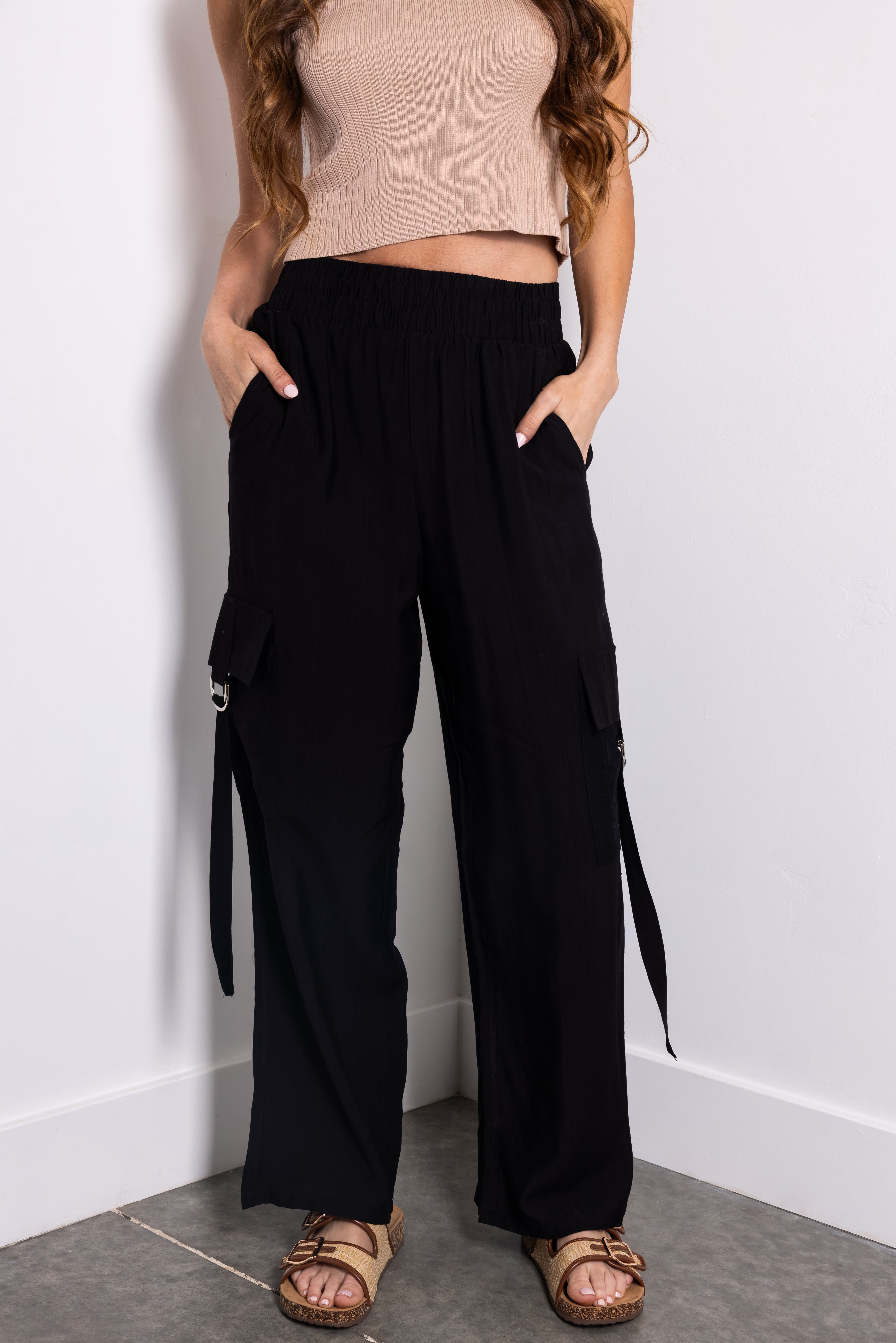 Stay comfortable and stylish in these Black Wide Leg Cargo Pants . Crafted from non-stretchy lightweight breathable woven material with a high waist design, smocked elastic waist, side pockets, and buckle strap cargo pockets. Perfect for casual daytime wear in spring and summer. This imported garment is unlined and made of 75% Rayon and 25% Nylon. Care instructions: Hand wash cold, hang to dry. Available in sizes S, M, and L. Model is wearing Small. Model’s Profile: Size 2, Height 58″, Bust 32″, Waist 25″.