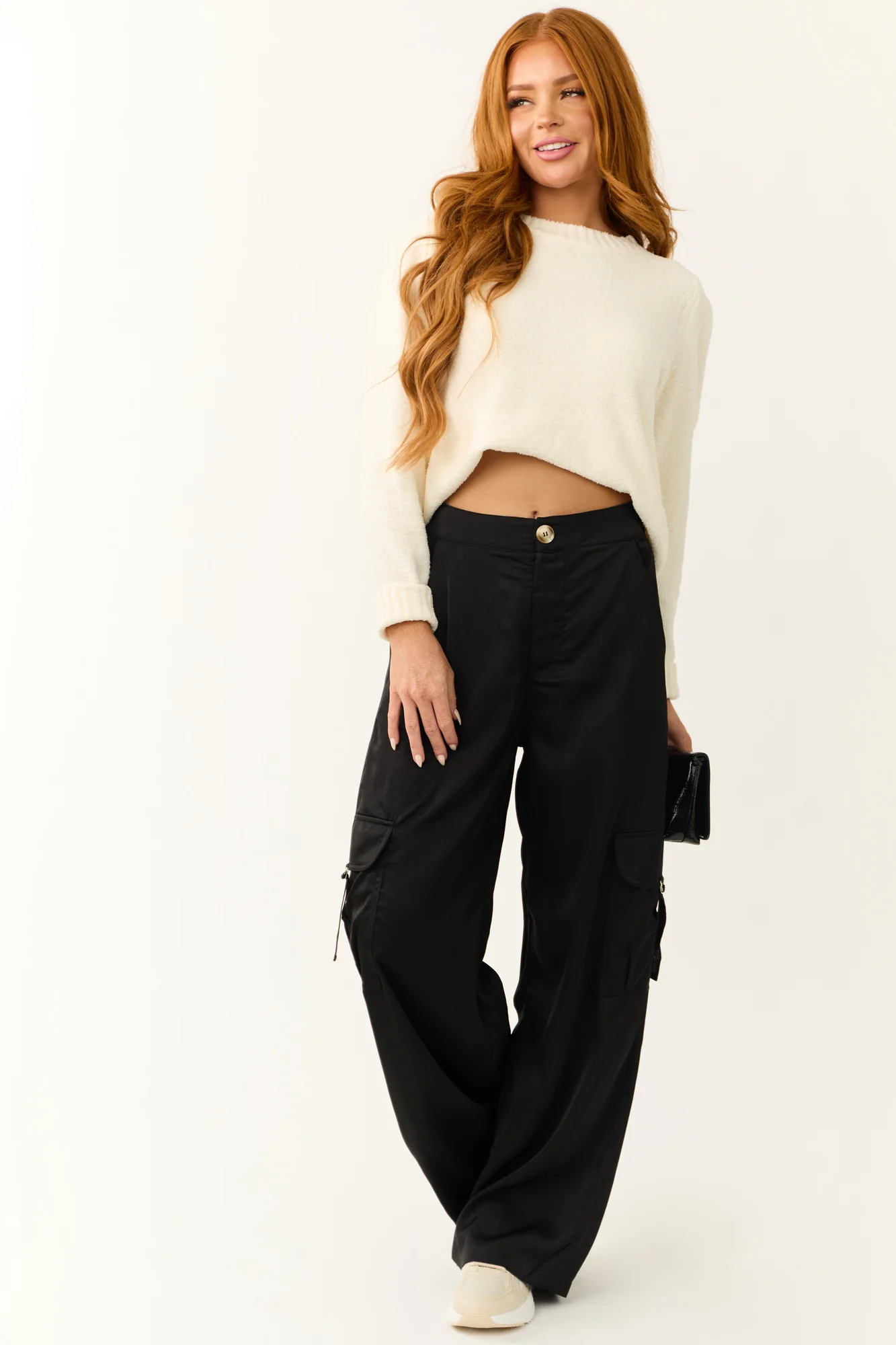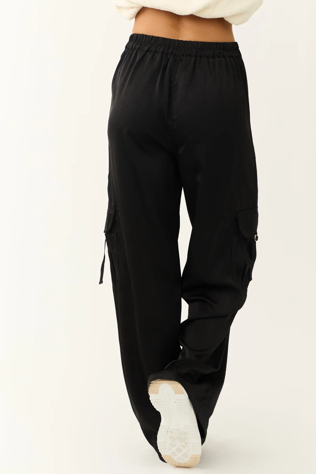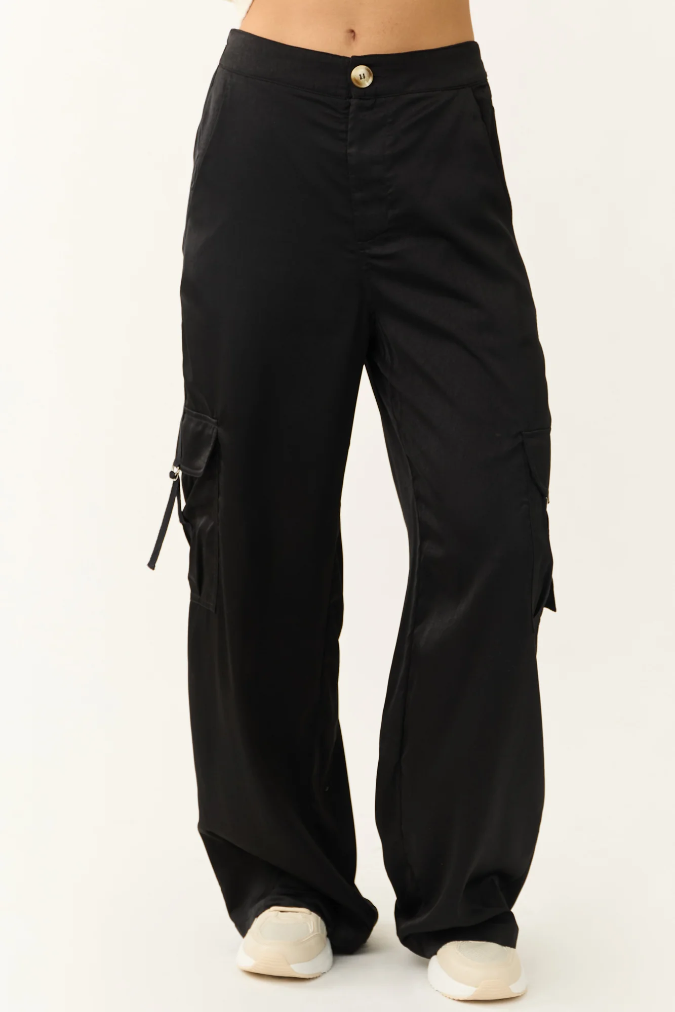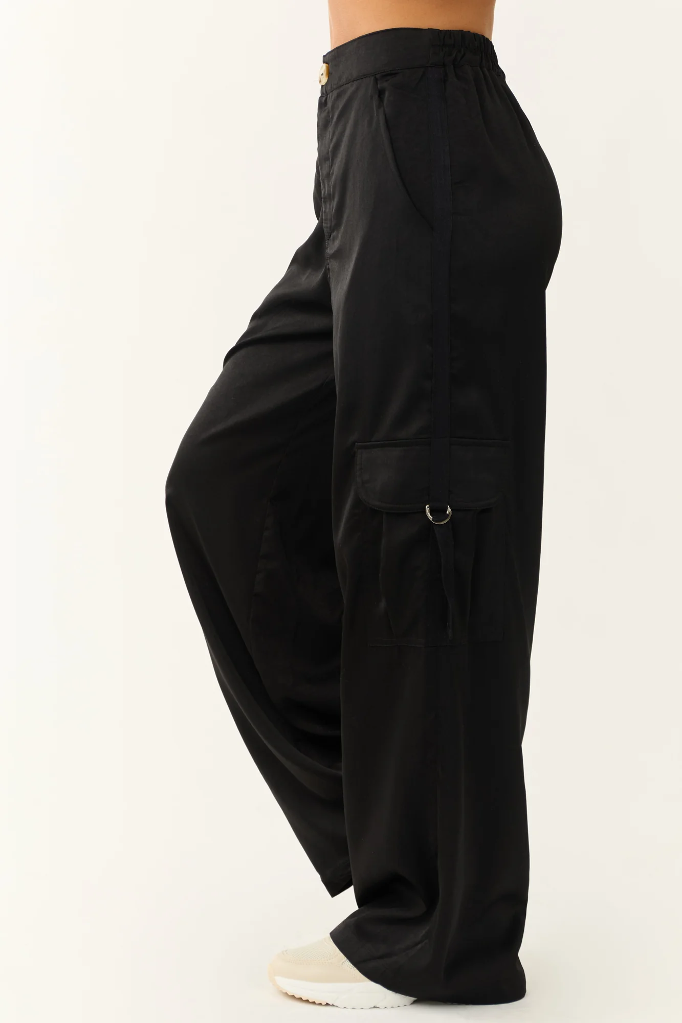 These stylish Black Wide Leg Cargo Pocket Pants are a must-have for your wardrobe. Crafted from 100% polyester, they feature side pockets, two cargo pockets, and a zip-up fly with a button closure. Available in S, M, and L sizes with a waist range of 26-30 inches and inseam of 30 inches. The non-stretchy woven design adds a touch of sophistication to your look. Perfect for casual daytime wear in fall, these pants can be paired effortlessly with any top. Hand wash cold and line dry for best care results. Model is wearing size Small. Models measurements: Size 1, Height 55″, Bust 31″, Waist 24″.