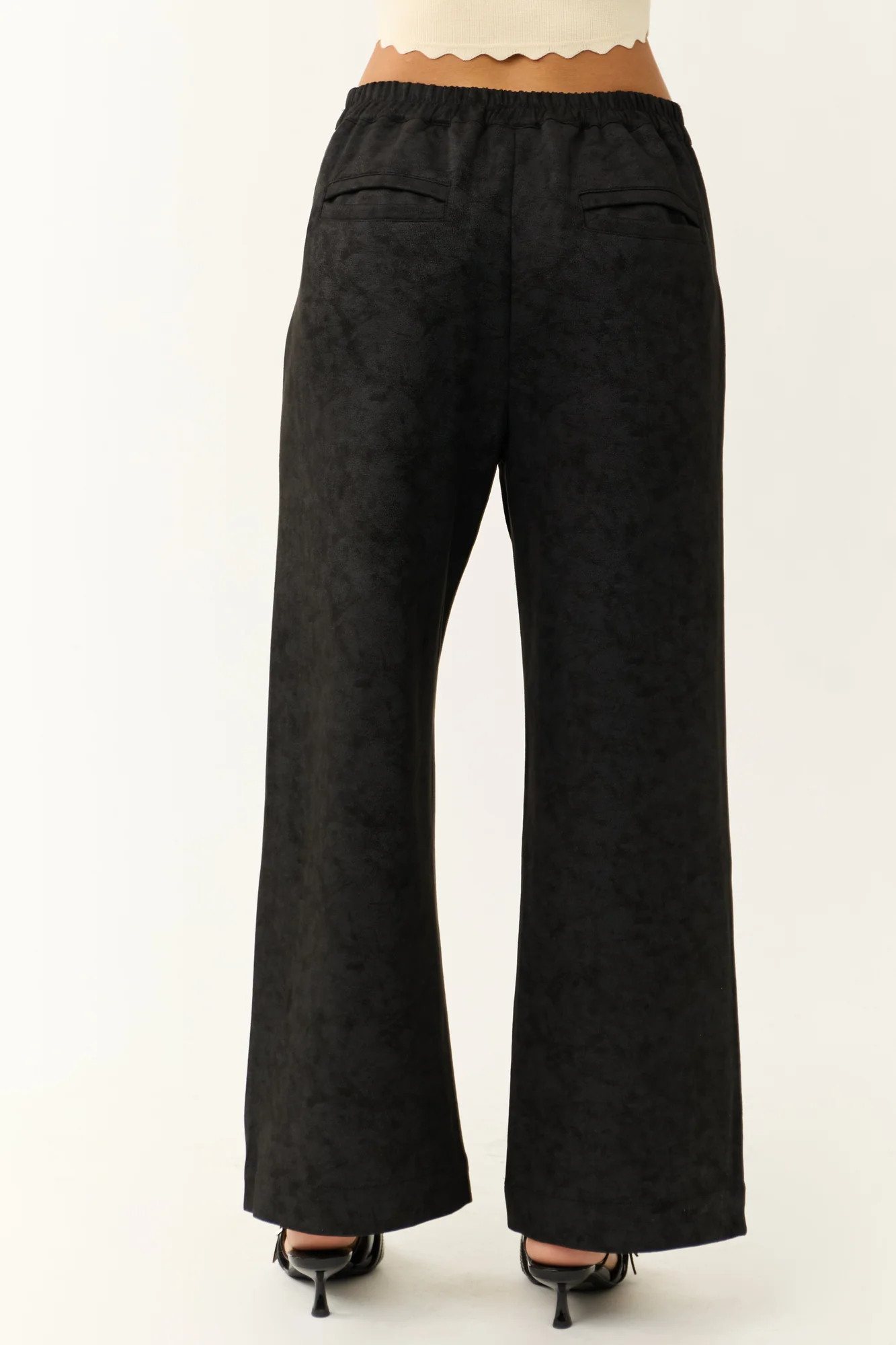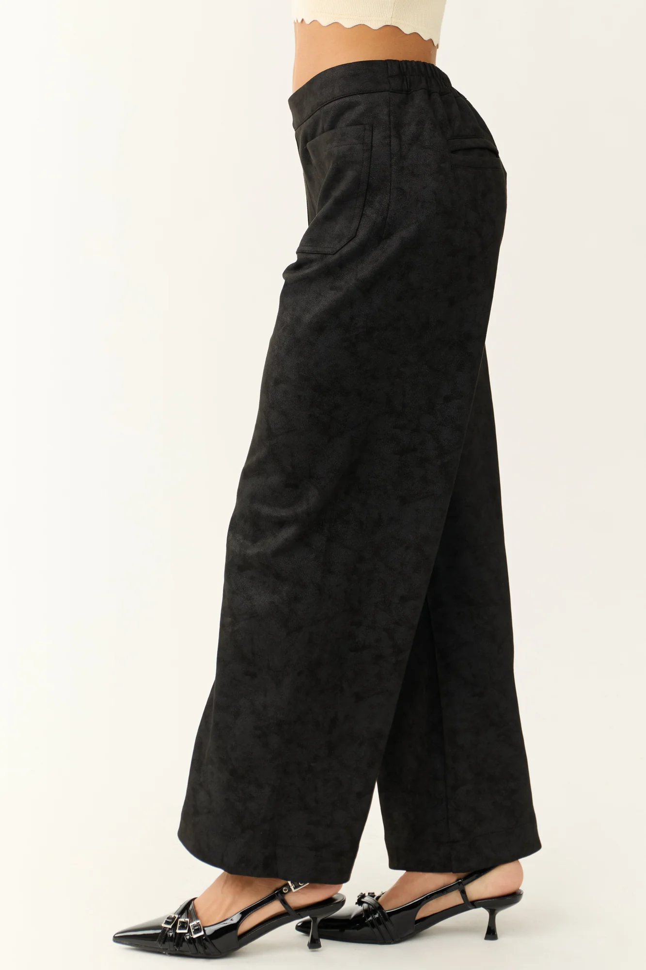 These Black Wide Leg Faux Suede Pants come in sizes S, M, L, and XL with waist measurements of 28″, 30″, 32″, and 34″ respectively. The inseam length ranges from 26″ to 27.5″. Made of 90% Polyester and 10% Spandex, these semi-stretchy pants feature an elastic waistband for a comfortable fit and front pockets for convenience. Ideal for daytime and work wear, these unlined pants exude style and comfort. Care instructions: Hand wash cold, do not wring or twist, use non-chlorine bleach, line dry, and iron low as needed. Model is wearing a size Small. Models measurements: Size 1, Height 55″, Bust 31″, Waist 24″.
