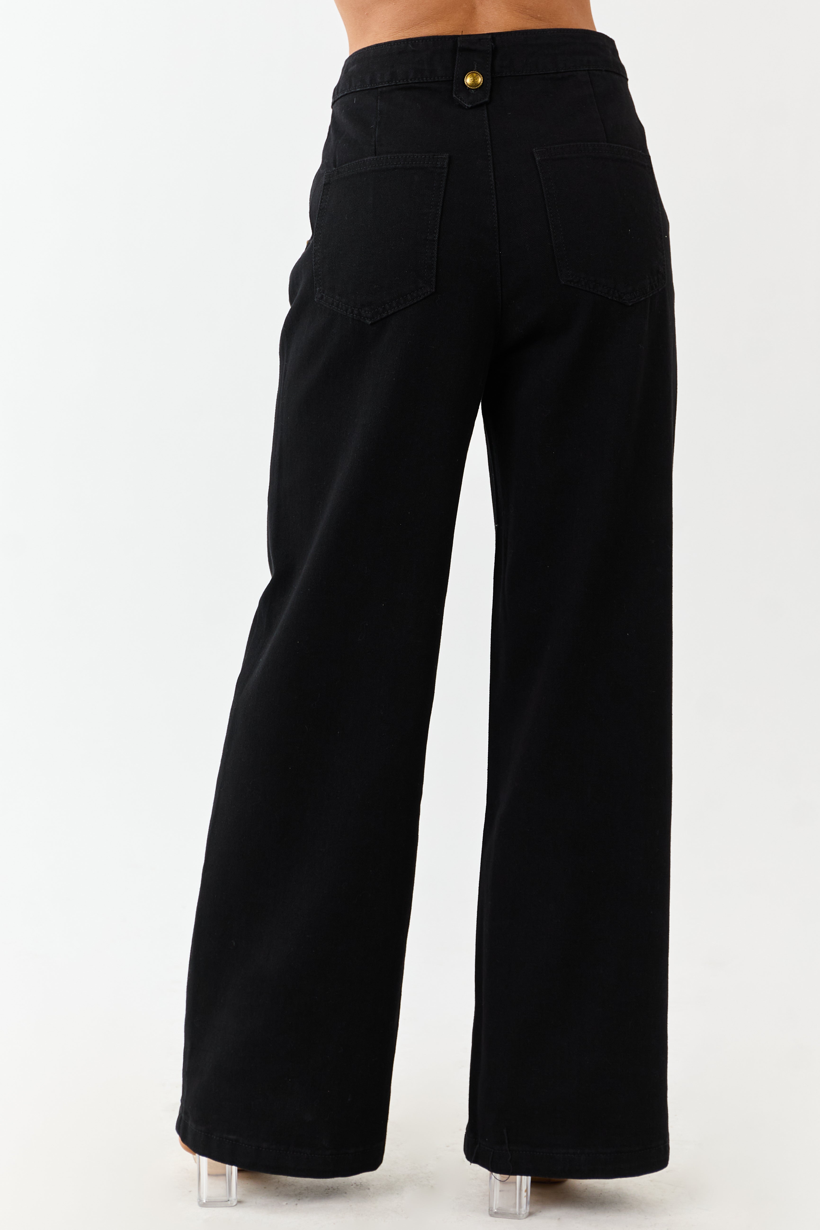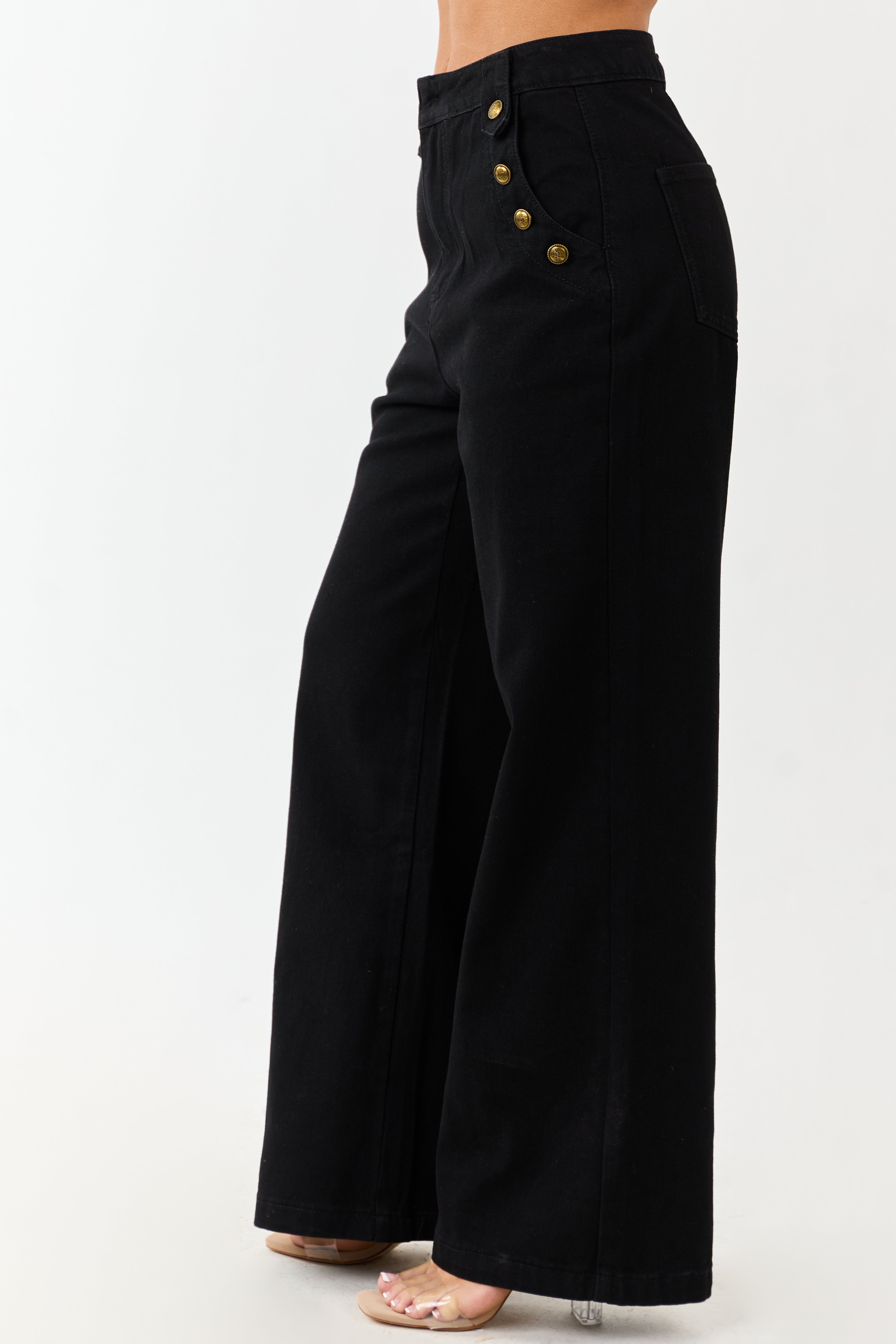 Experience timeless style and comfort with these black wide-leg high-rise denim jeans featuring a nautical gold-buttoned trouser design. Made from non-stretchy denim, these jeans offer a forgiving fit, creating a flattering silhouette. The garment includes angled pockets, decorative pocket buttons, and button-tab belt loops. With a high rise and a 31″ inseam, these jeans are both chic and practical. Constructed from 65% cotton and 35% polyester, these imported jeans are a must-have for any fashion-forward individual. Model is wearing size Small, with waist 27″ and hips 38″. Elevate your wardrobe with these stylish and versatile jeans.