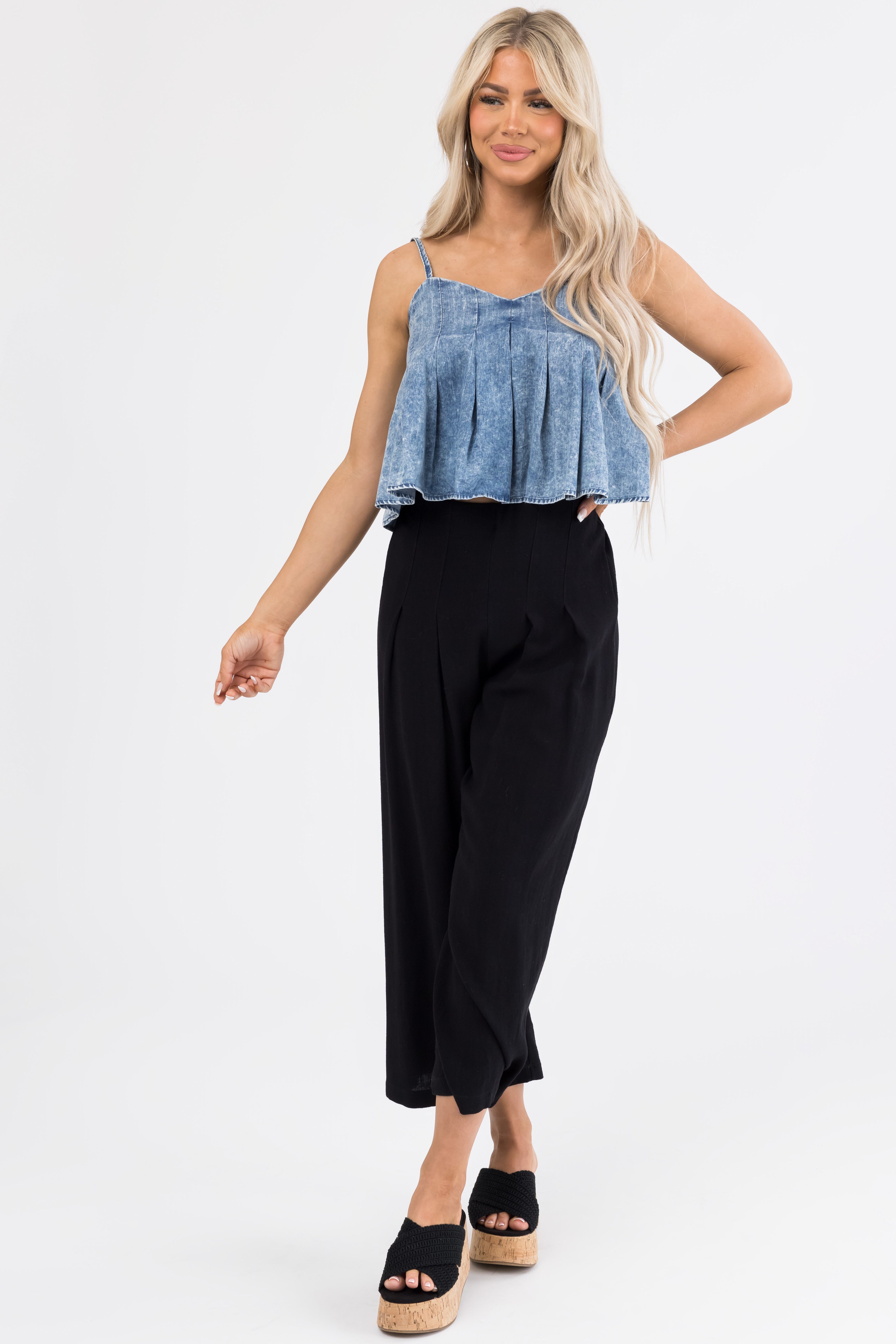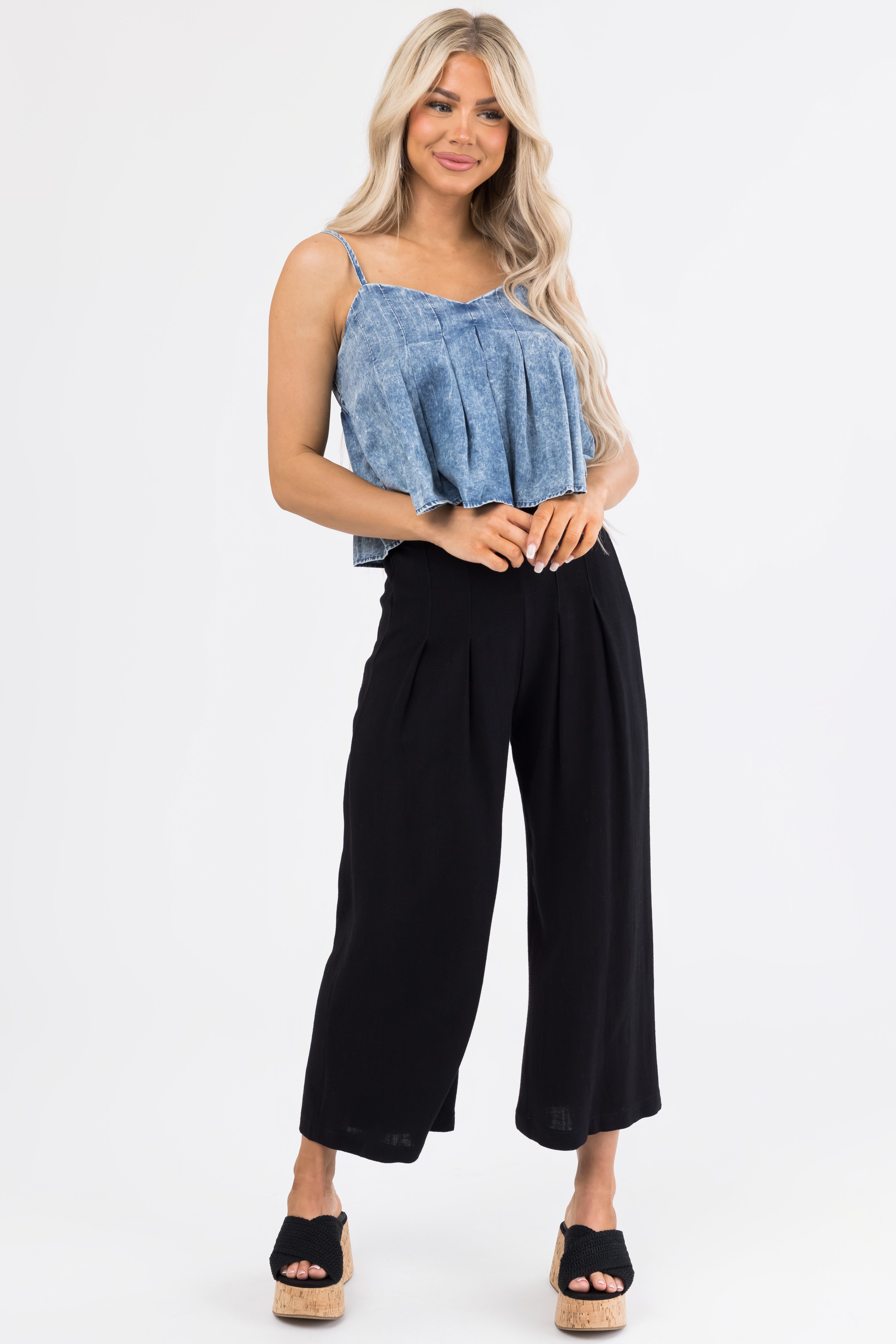 Stay chic and comfortable in these Black Wide Leg High Waisted Linenblend Palazzo Pants. Crafted from a non-stretchy linen blend, these pants feature an elastic waistband for extra room, a wide leg design, and are made in the USA. Perfect for a casual daytime look, these pants are unlined and ideal for the spring and summer seasons. Care instructions: Machine wash cold, do not bleach, lay flat to dry, low heat iron if needed. Model is wearing a size Small. Model’s Profile: Size 1, Height 57″, Bust 34″, Waist 26″.