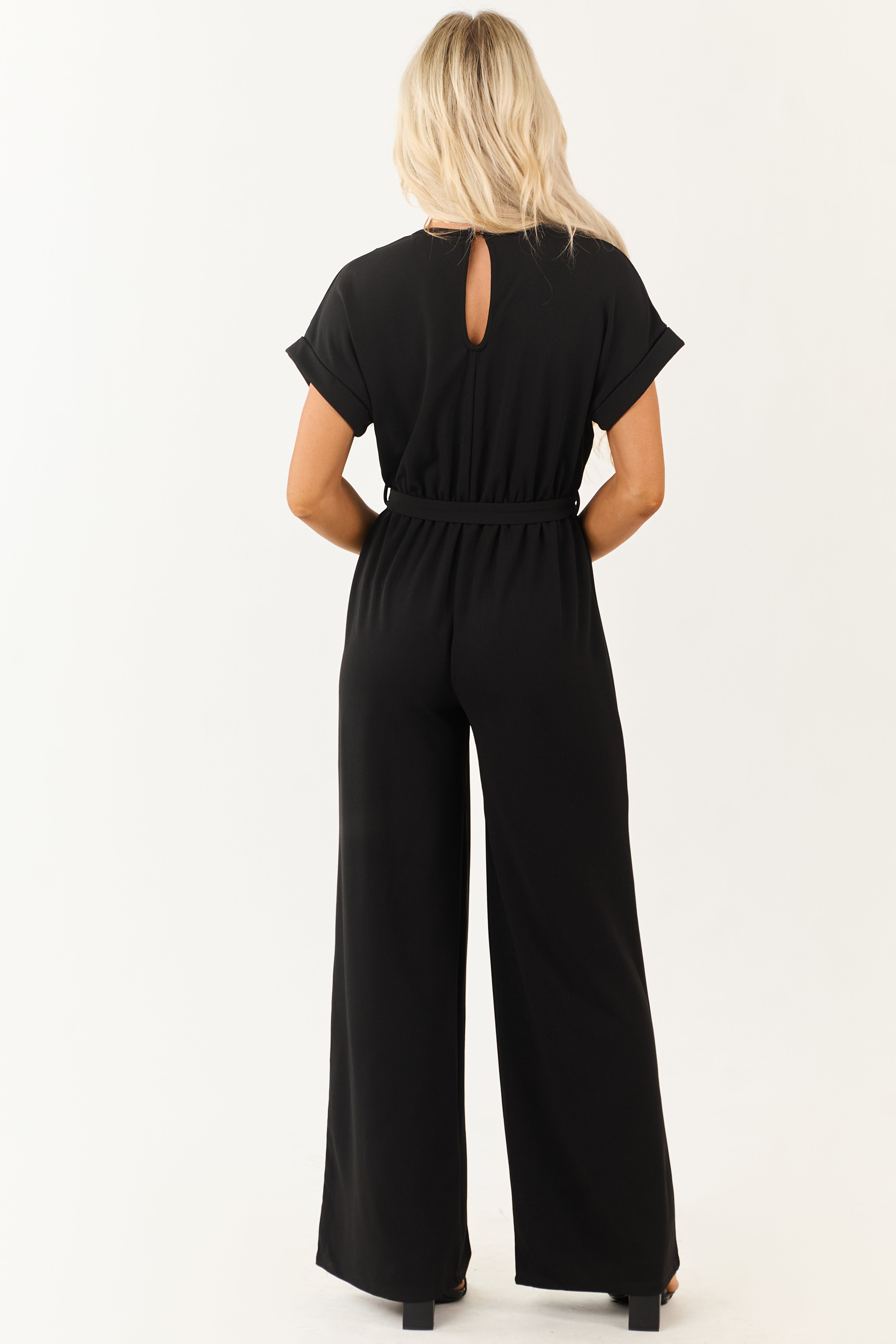This black jumpsuit offers a chic one-and-done look with a surplice wrap front, adjustable waist tie, and wide flowy legs. Made of stretchy knit with removable belt, keyhole back, and banded cuffs, it provides comfort and style in one piece. Get yours today!