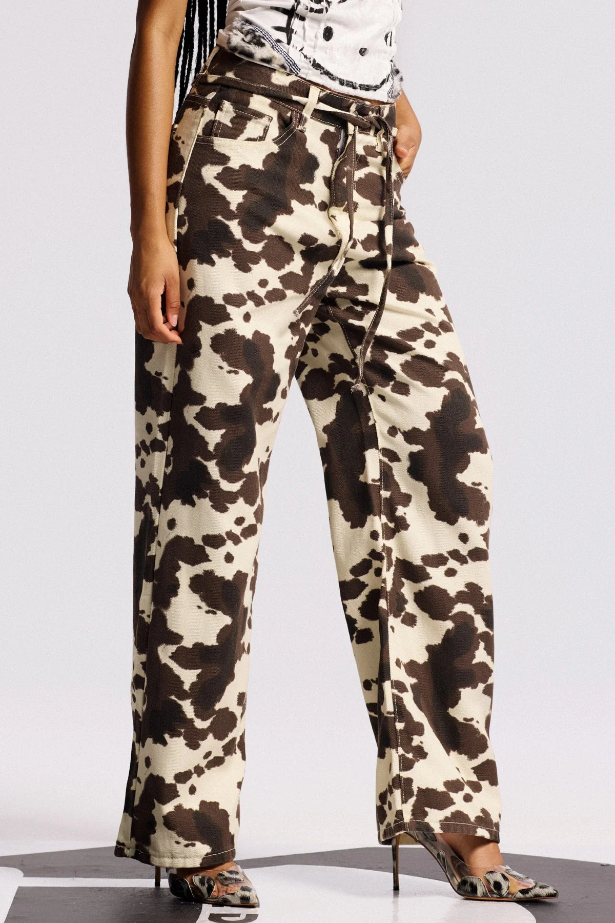Step out in style with these expertly crafted Bleached Cow Print Denim Jeans . Featuring a unique bovine-inspired pattern achieved through precision bleaching techniques, these jeans offer a bold fashion statement with a contemporary twist. The durable premium denim construction ensures both comfort and longevity. The strategic bleached areas create a versatile urban edge with a touch of brown hues. These non-stretch jeans are perfect for those seeking a distinctive look. Plus, gentle machine wash care allows for easy maintenance. Please note that color variations may occur due to image lighting.