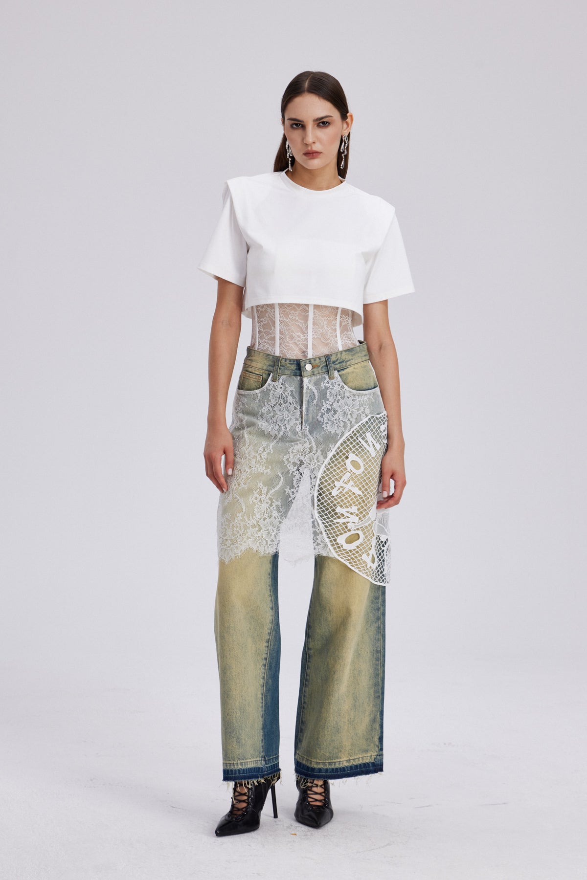 Elevate your wardrobe with the Bleached Lace Detail Jeans in Blue Denim, expertly crafted to combine edgy style with delicate lace accents. Featuring a unique bleached wash and intricate detailing, these jeans offer a refined yet bold look. Designed for both comfort and durability, they provide a flattering fit that enhances your silhouette while making a distinct fashion statement. Ideal for those seeking a sophisticated twist on classic denim. These non-stretch jeans are easy to clean with a gentle machine wash. Please note that color may vary slightly due to different lighting conditions in images.