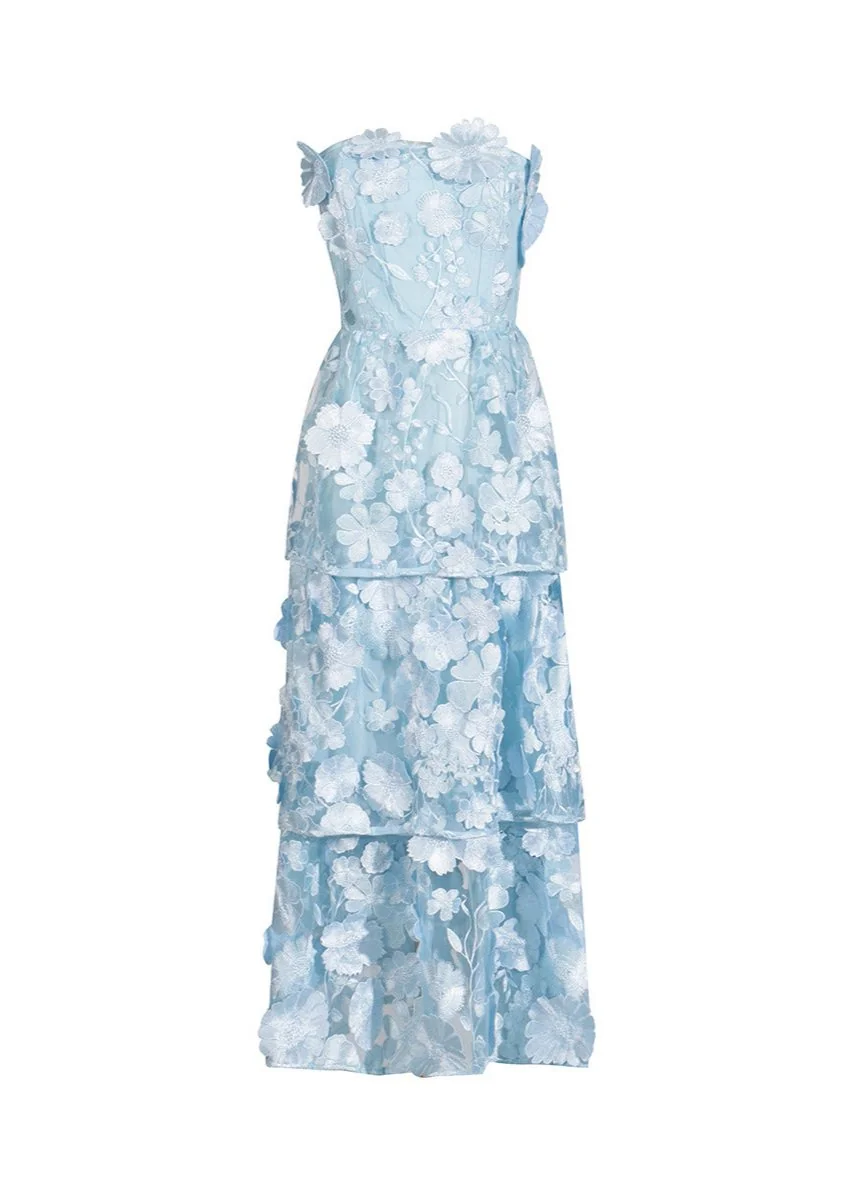 Elevate your style with our Blue 3D Floral Tiered Maxi Dress. The intricate 3D flower details add dimension and texture, while the tiered design brings movement and flow to your look. This cocktail maxi dress features a fitted bodice, straight neckline, and tiered flared skirt with 3D floral lace. Made with 100% polyester for a timeless and versatile look suitable for any occasion. Complete with a center back invisible zipper for easy wear. Available in XL, S, M, and L sizes.