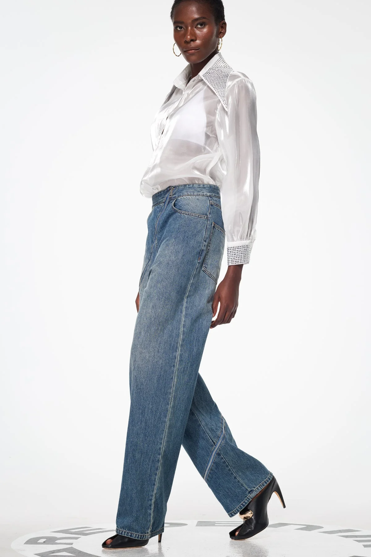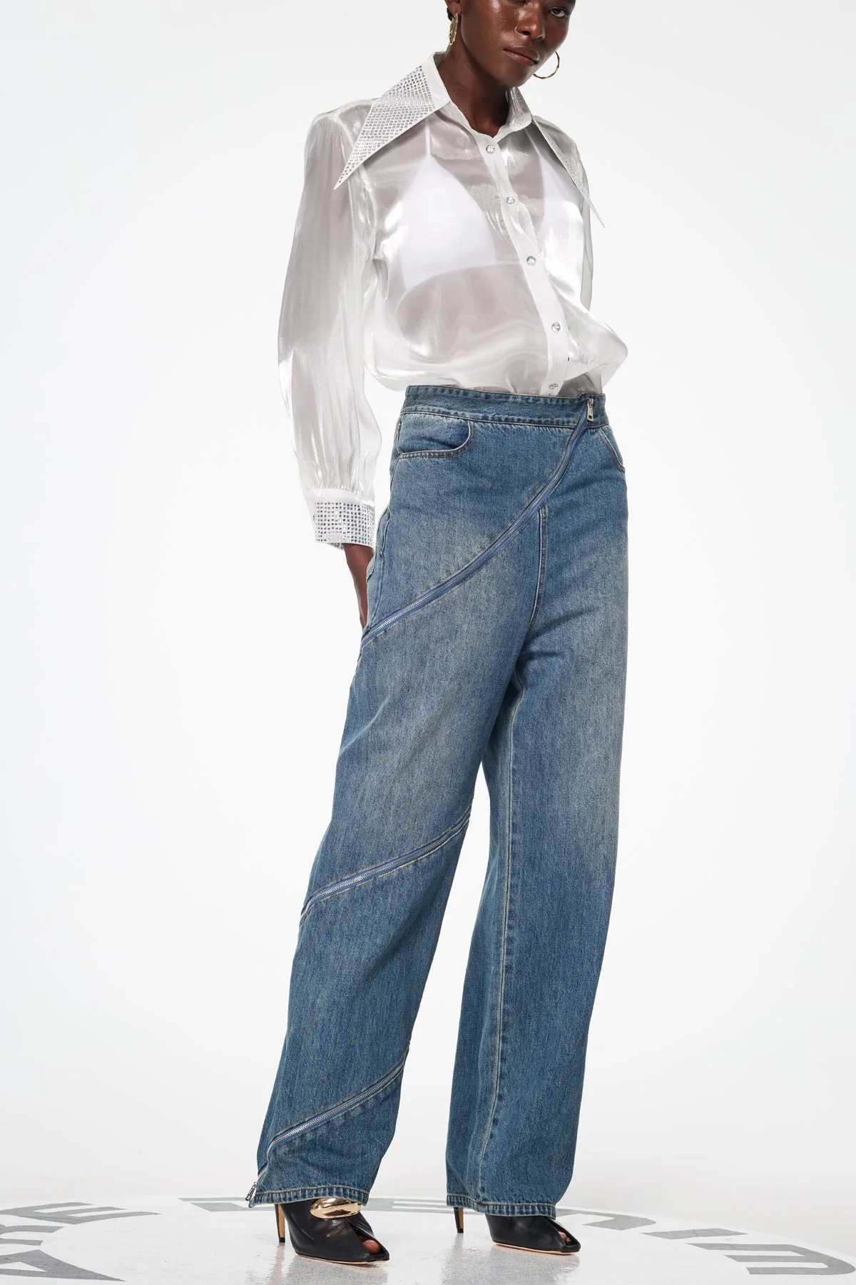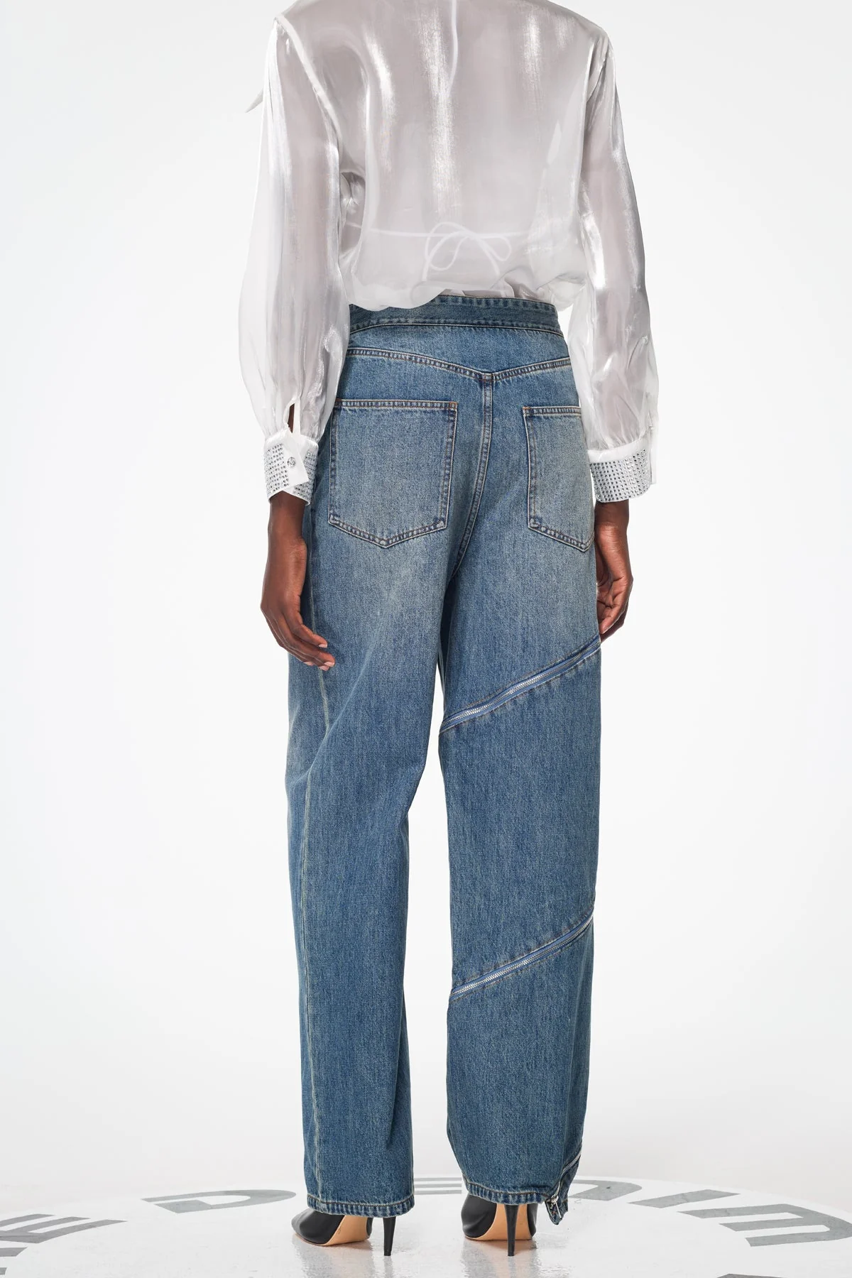 Indulge in the exceptional style and comfort of these Blue Asymmetric Zipper Deconstruct Jeans . Featuring a unique asymmetric design with deconstructed elements, this pair offers a contemporary twist on the classic denim look. The edgy zipper detail adds a touch of flair while maintaining functionality. Elevate your wardrobe with these essential jeans crafted from 50% Polyester and 50% Cotton blend. Whether its a casual day out or a night on the town, these jeans are sure to make a statement. Please note: Color variations may occur due to image lighting. For optimal care, machine wash gently.
