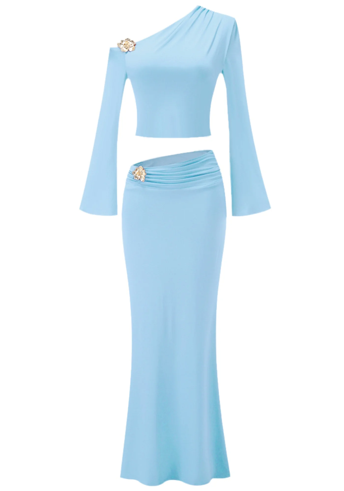 Discover elegance and style with our Blue Bardot Maxi Dress. This off-the-shoulder design features long sleeves and draped details for a stunning look. Crafted from a blend of Polyester and Cotton, the high-quality fabric ensures durability. Carefully stitched with a YKK zipper for reliability. Maintain its beauty with gentle dry cleaning. Please note, color may vary due to lighting. Elevate your wardrobe with this timeless piece.