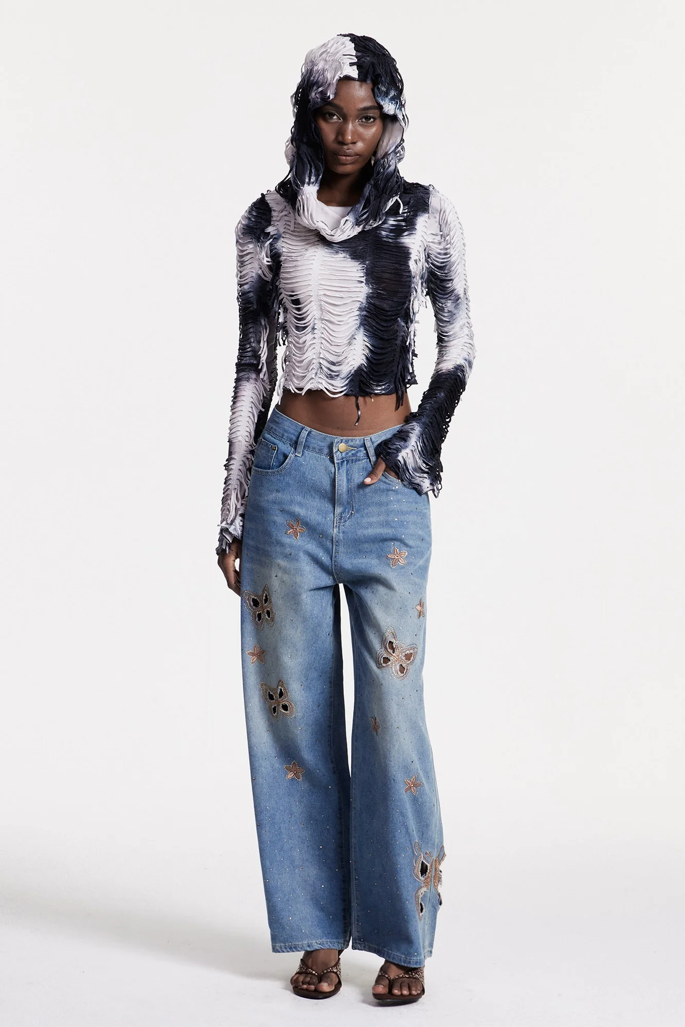Discover the allure of our Blue Butterfly Embroidered Cutout Jeans . These jeans feature exquisite butterfly embroidery and expertly crafted cutouts, combining comfort with a touch of artistic sophistication. Elevate your casual wardrobe effortlessly. Non-stretch material for a classic fit. Ideal for expressing your romantic coquette style. Color variations may occur due to image lighting. Gentle machine wash recommended.