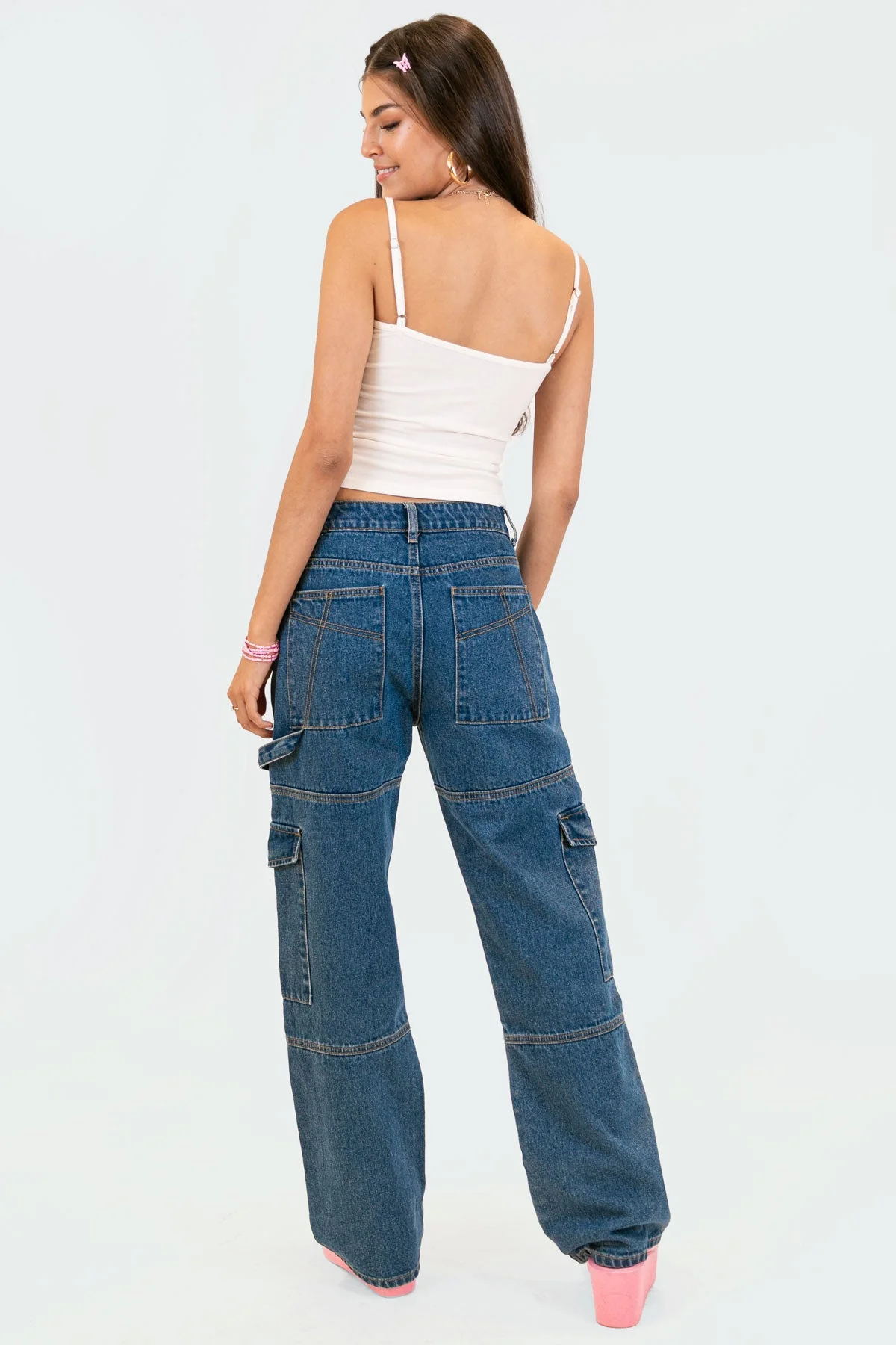 Crafted from 100% Cotton, these Blue Cargo Jeans feature a Boyfriend fit with Military style pockets, offering both style and functionality. The model wears size S and stands at 57. Care instructions: Machine wash with similar colors for best results.