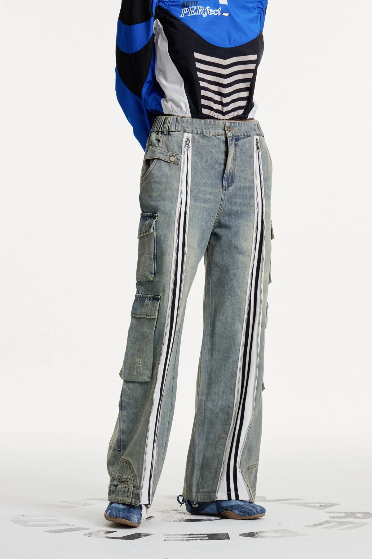 Experience the perfect blend of functionality and contemporary style with our Blue Cargo Jeans featuring a unique zipper stripe detail. Designed for durability, these jeans boast practical cargo pockets for added utility. The versatile blue wash allows for a wide range of outfit options, from casual to urban chic. Crafted for comfort, these non-stretch jeans are ideal for fashion-forward individuals who appreciate both style and practicality. Dont miss out on adding these must-have jeans to your wardrobe today. Discover ultimate denim versatility with our expertly crafted Blue Cargo Jeans! This garment should be washed gently in a machine to maintain its fresh appearance. Please note that color variations may occur due to lighting during photography sessions.
