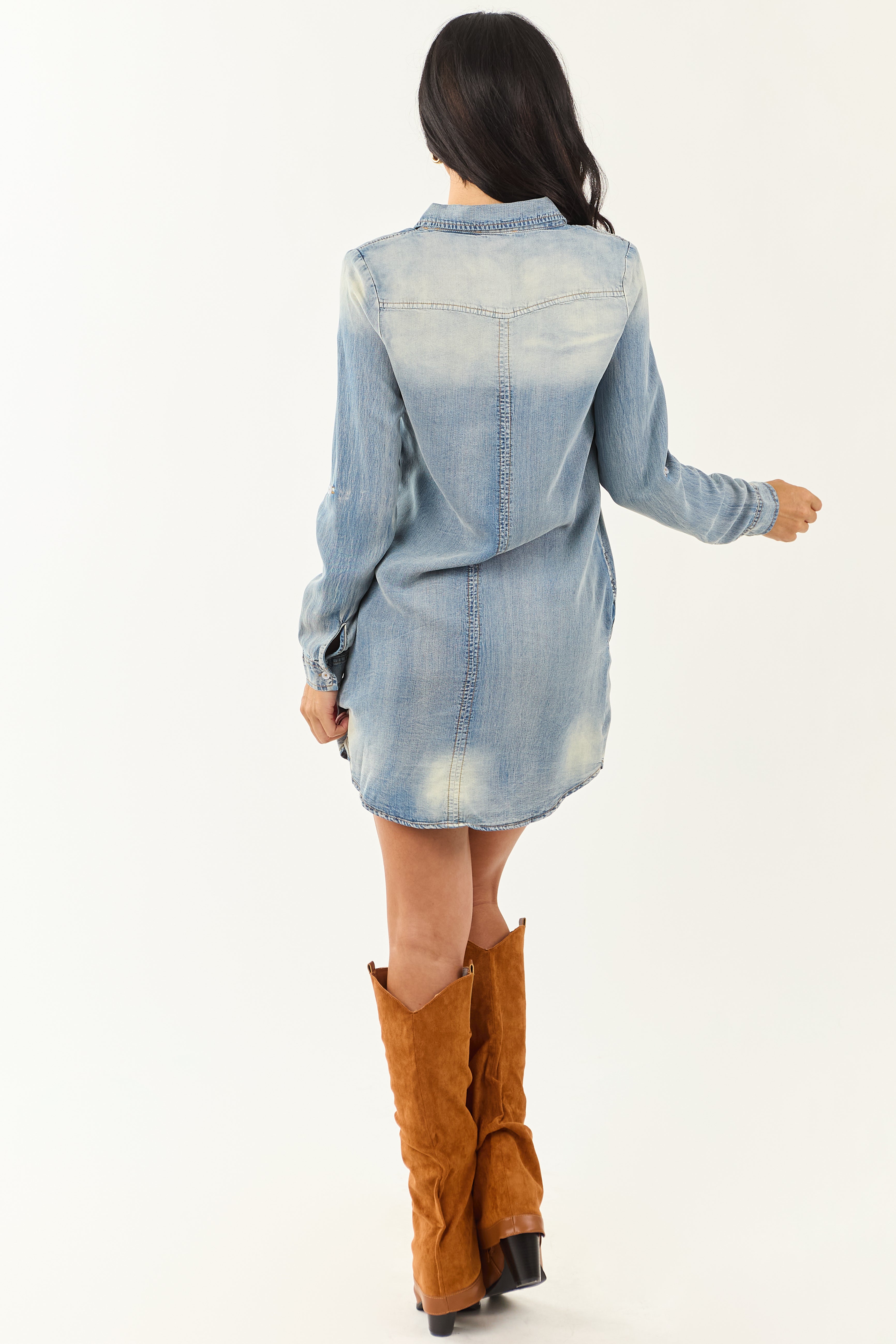 This chic blue chambray mini dress features a relaxed shift fit, side and chest pockets, banded button cuffs, and a button sleeve for rolled cuffs. Made of 100% Tencel for a buttery-soft feel, this lightweight denim dress is perfect for any casual or elevated look. Pair it with a belt and strappy heels for a fashionable ensemble that fits true to size. Find garment specs for size small: bust 36″, waist 36″, length 34″. Non-stretchy and unlined, this imported piece exudes ease and style while maintaining a comfortable loose fit. Model is 59″ and wearing a size Small. Dress measurements: Bust 31-40″, Waist 23-32″.