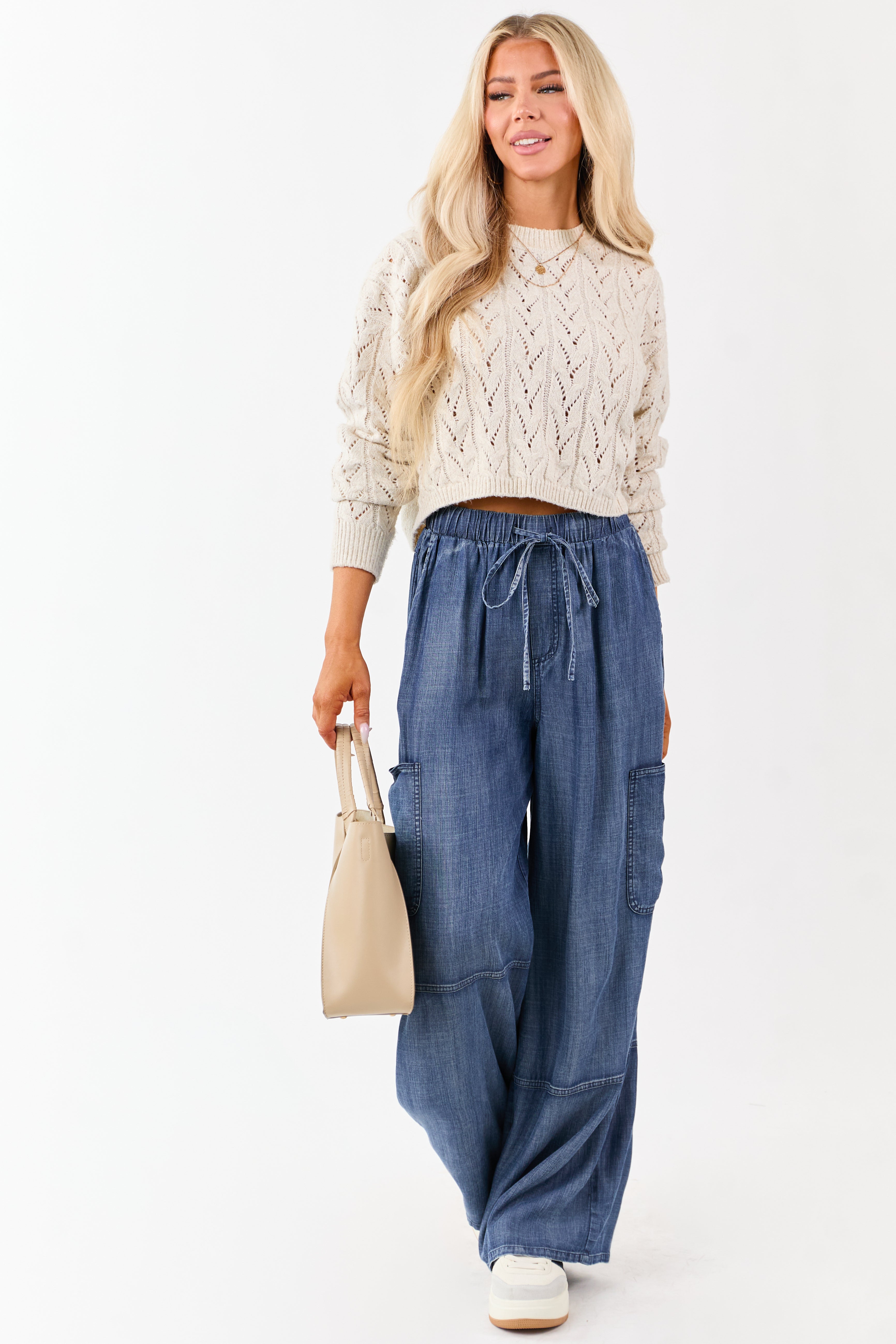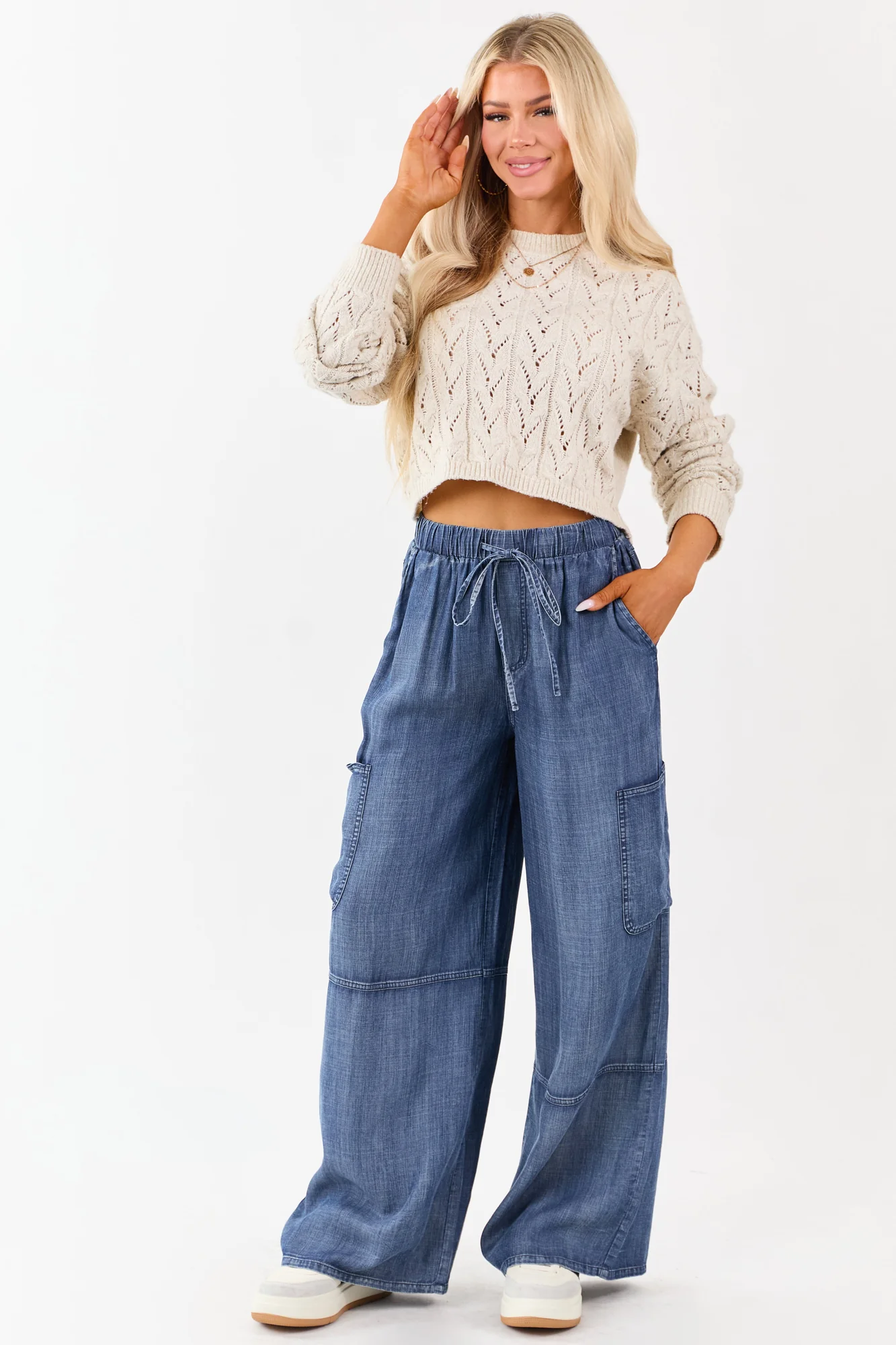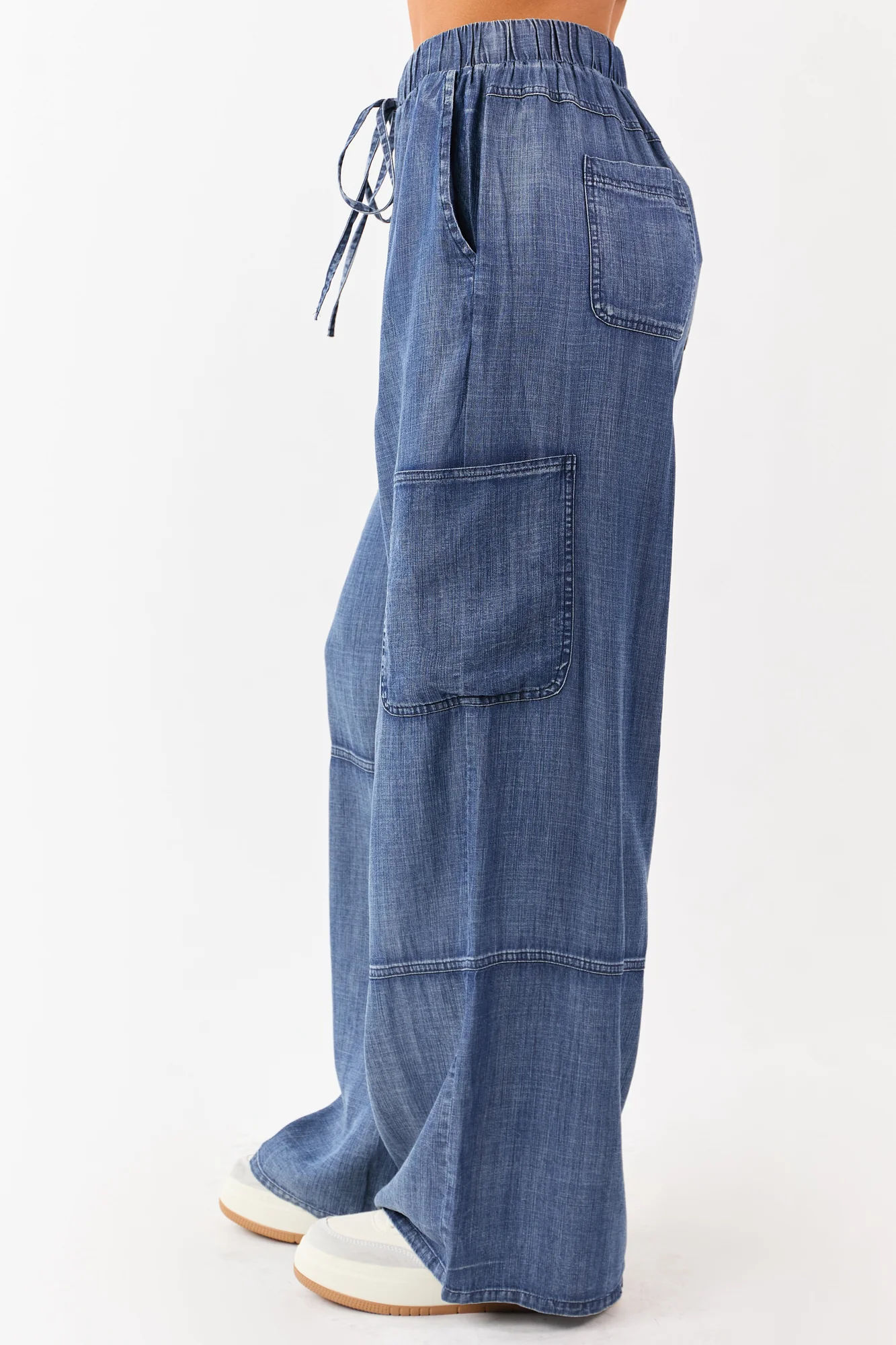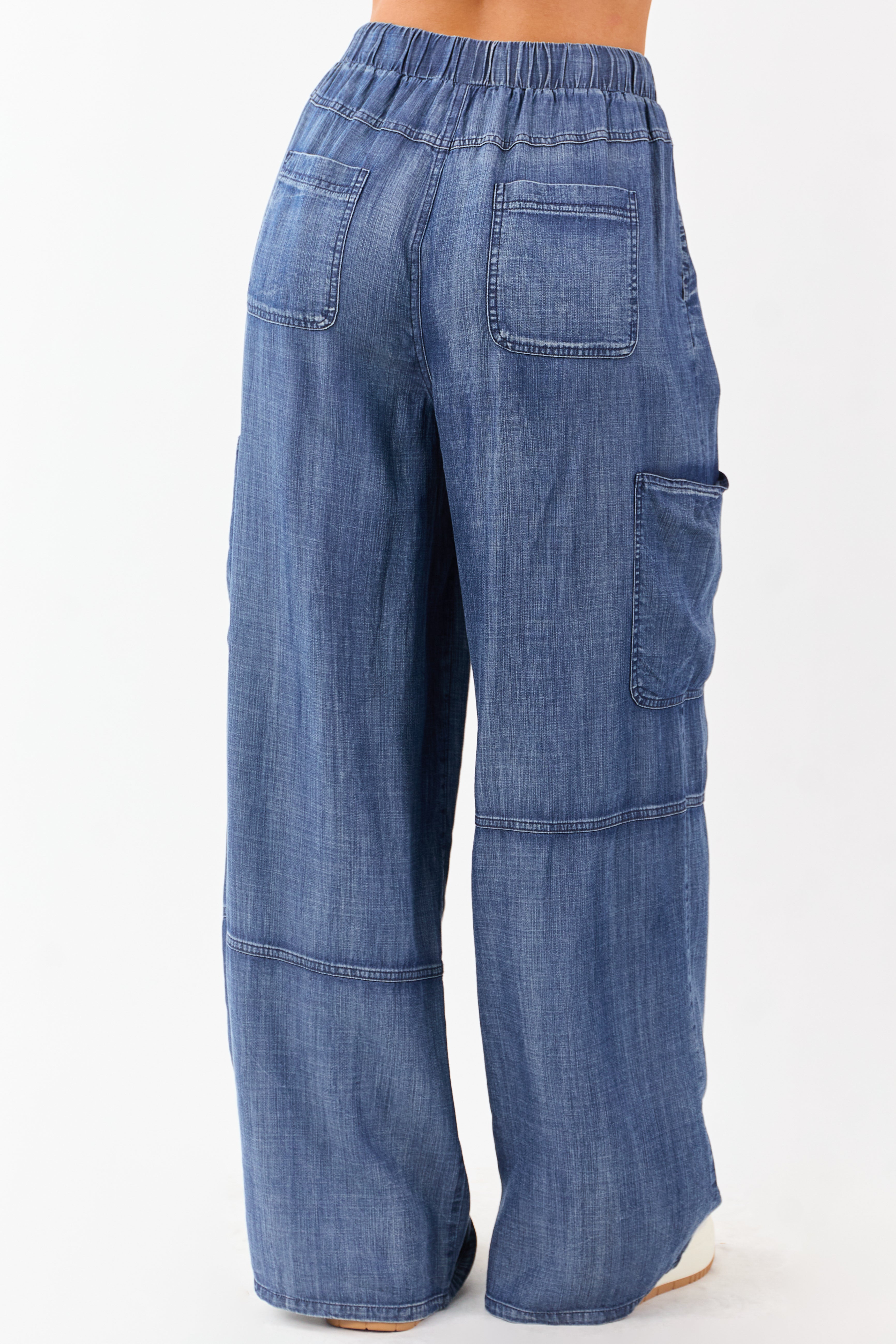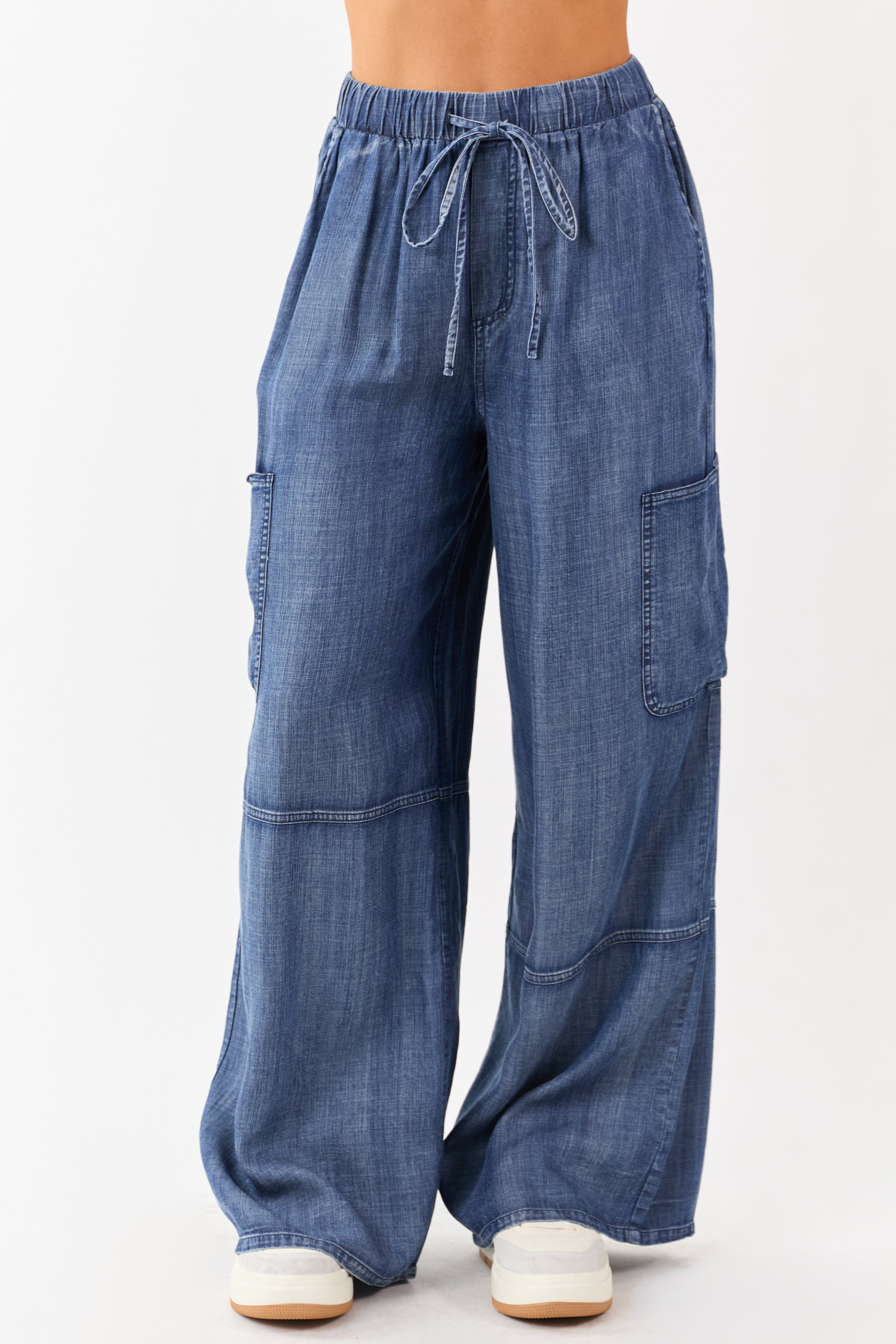 These versatile chambray cargo pants in a medium wash offer a breezy feel and a relaxed wide leg design. Crafted from 100% Tencel denim, they feature an elastic drawstring waist, high waist, 6 pockets, and decorative fly detail. Perfect for everyday wear, these non-stretchy pants have an inseam of 29 inches. Model is 57″ tall, wearing a size Small.