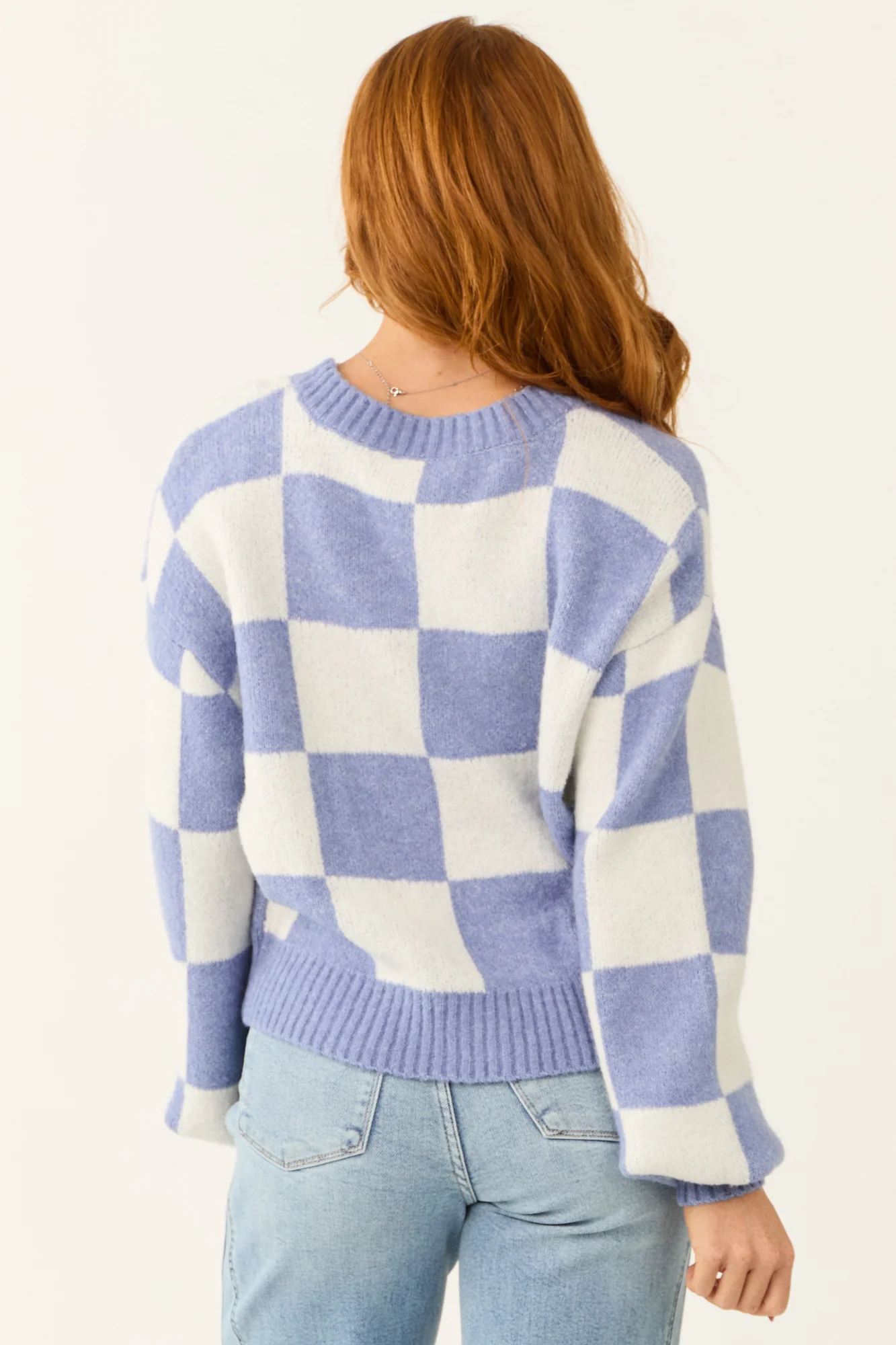 Indulge in the cozy charm of our Dusty Blue and Ivory Checkered Print Cardigan. This stylish outerwear features long bubble sleeves and a button-down front for effortless layering. Crafted from a stretchy knit fabric with ribbed trim, it offers a casual fit thats perfect for any occasion. The blend of 64% Acrylic, 25% Polyester, 8% Nylon, and 3% Spandex ensures comfort and durability. Whether youre running errands or relaxing at home, this cardigan is a versatile wardrobe staple. Remember to hand wash cold, dry flat, and avoid ironing. Available in sizes S, M, and L.