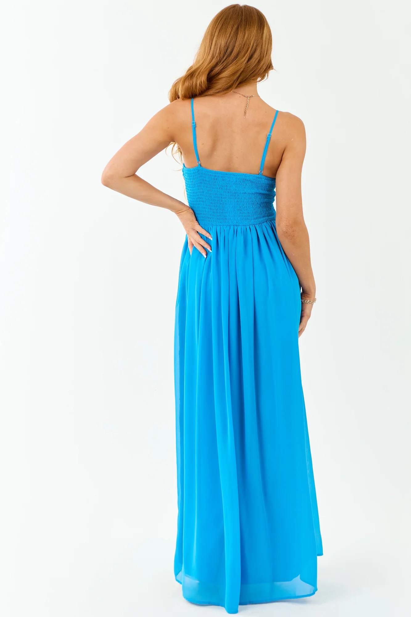 Indulge in the timeless elegance of this flowy blue chiffon maxi dress. Find yourself in a dreamy silhouette with a front twist detail, adjustable spaghetti straps, and a high side slit for a truly unforgettable look. Made of 100% Polyester, this dress is perfect for any special occasion. Available in sizes XS to XL. See the size chart for exact measurements. Feel confident and beautiful in this luxurious piece.