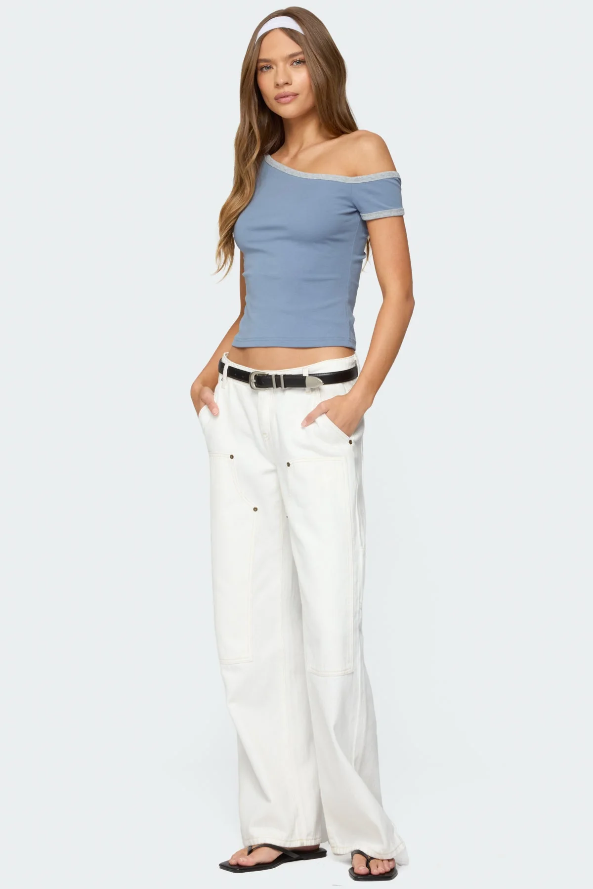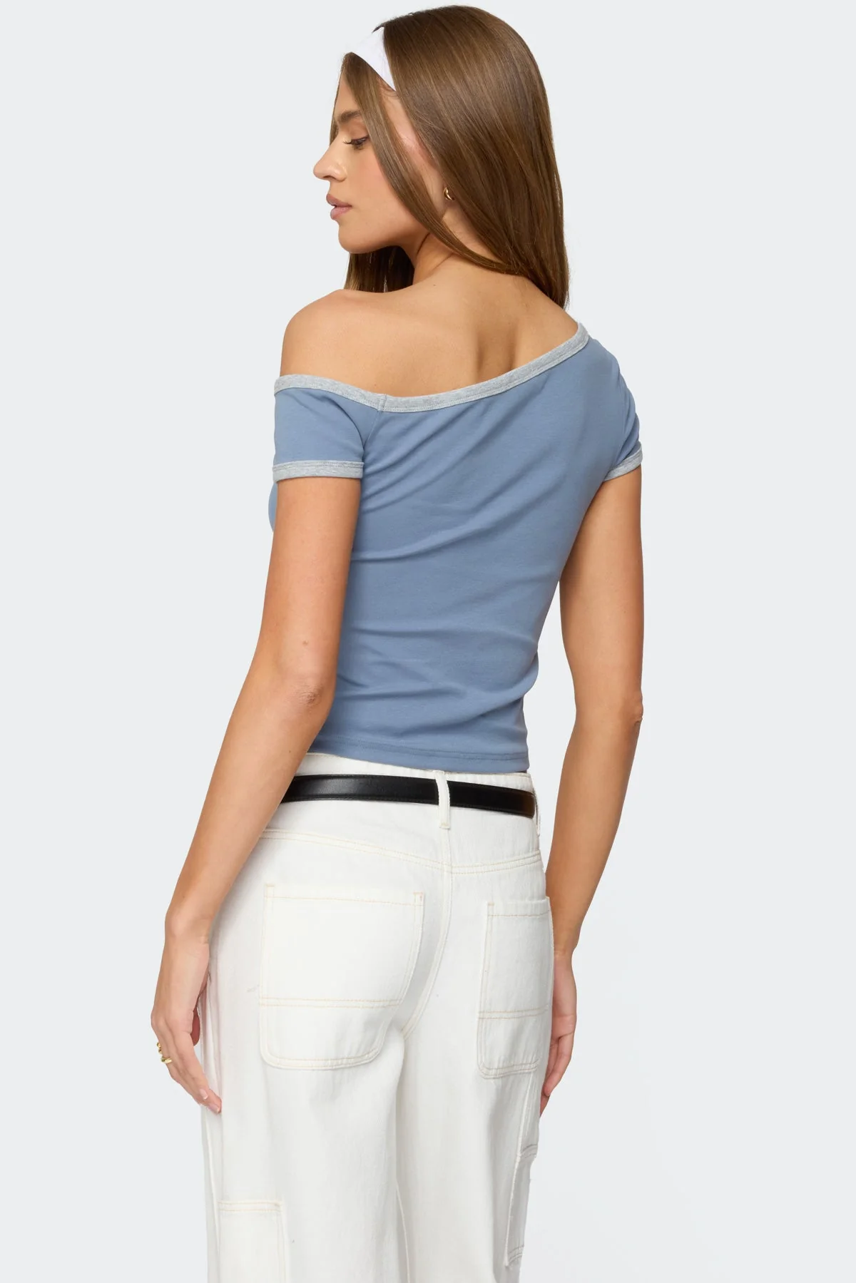 This Blue Contrast Off Shoulder Top features a stylish design with a flattering off-shoulder fit and contrasting binding. Made of high-quality cotton and spandex blend, it ensures comfort and stretch. Available in sizes XS to XL. Care Instructions: Machine wash cold, do not bleach, tumble dry low, iron low heat, do not dry clean.