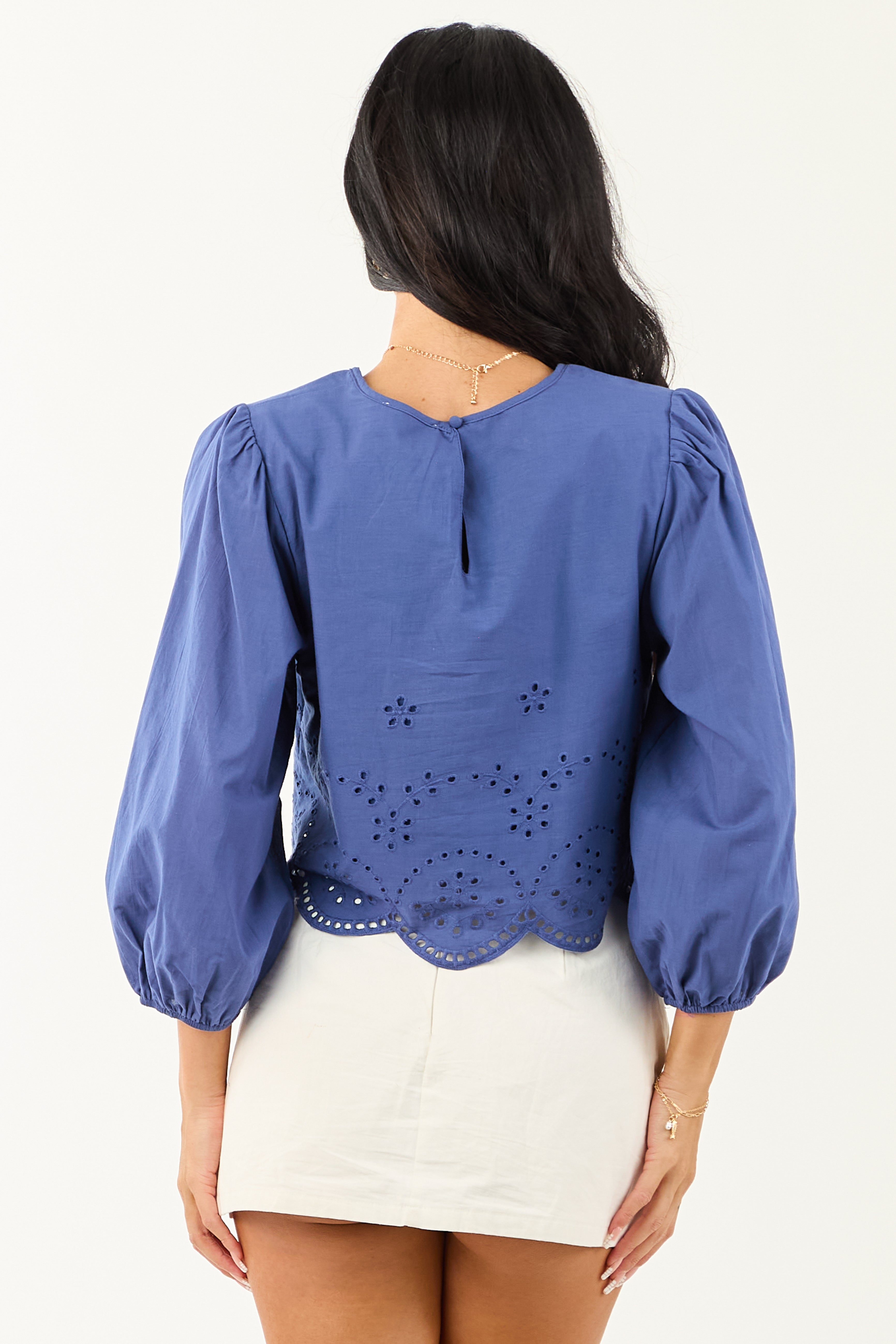 Stay cool and classy in this beautifully colored blue cotton crop top. Made from non-stretchy lightweight 100% cotton, this top features elastic cuffs, a scalloped hem, and a back keyhole with button closure. The lined torso provides extra comfort and quality. Available in sizes S, M, and L. Model is wearing a size Small. Perfect for casual outings and warm weather days.