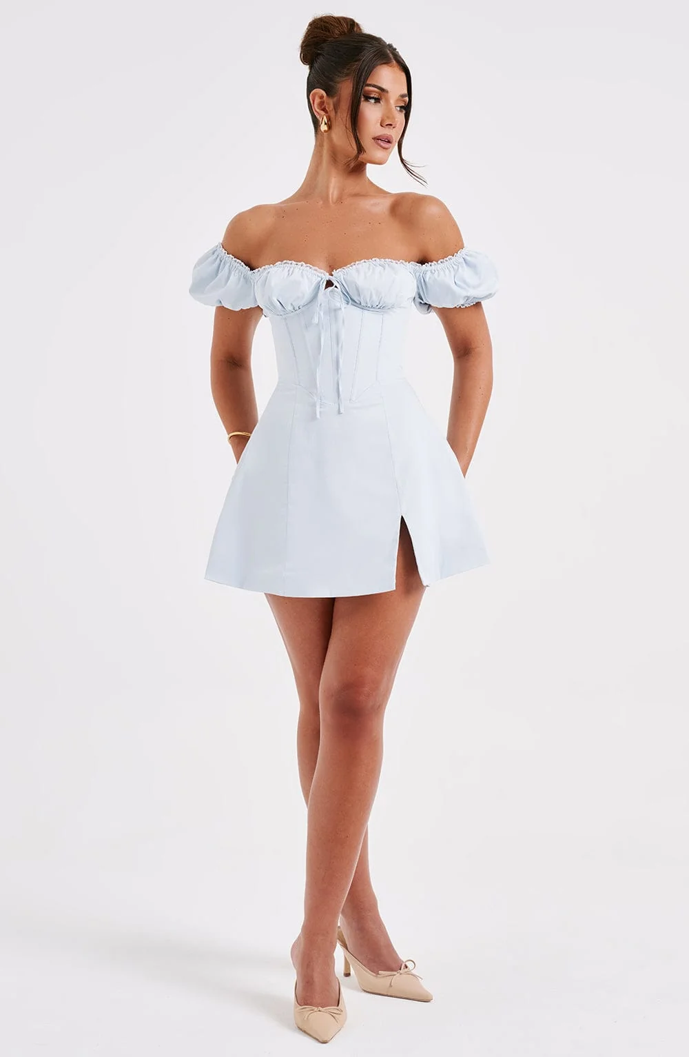 Elevate your look with the stunning Caitlyn Mini Dress in blue. Featuring a boned bodice, lace-up back, puff sleeves, and underwired cups, this dress is perfect for all your events. Crafted from a premium non-stretch cotton blend fabric, fully lined for comfort. Complete with a tie detail, lace trim, and invisible zipper. Step out in style with this mini-length beauty. Suitable for weddings, parties, brunch, and more. Available in sizes XS to XXL.