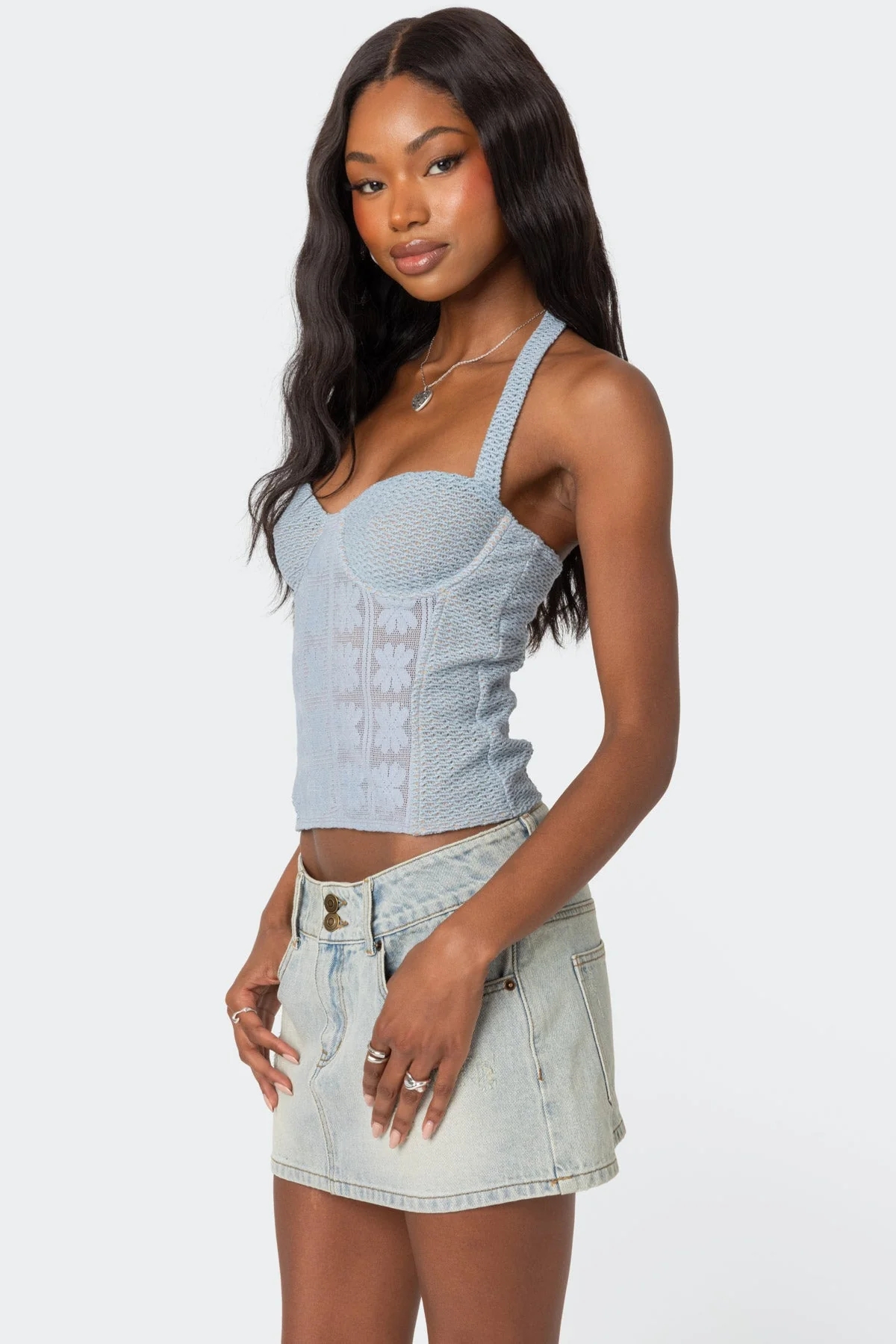 Experience elegance with our Blue Crochet Halter Neck Corset Top. Made from a blend of Polyester and Spandex, the cupped construction and mixed crochet fabric provide a stylish and comfortable fit. This top is machine washable and easy to care for. Elevate your wardrobe with this stunning piece.