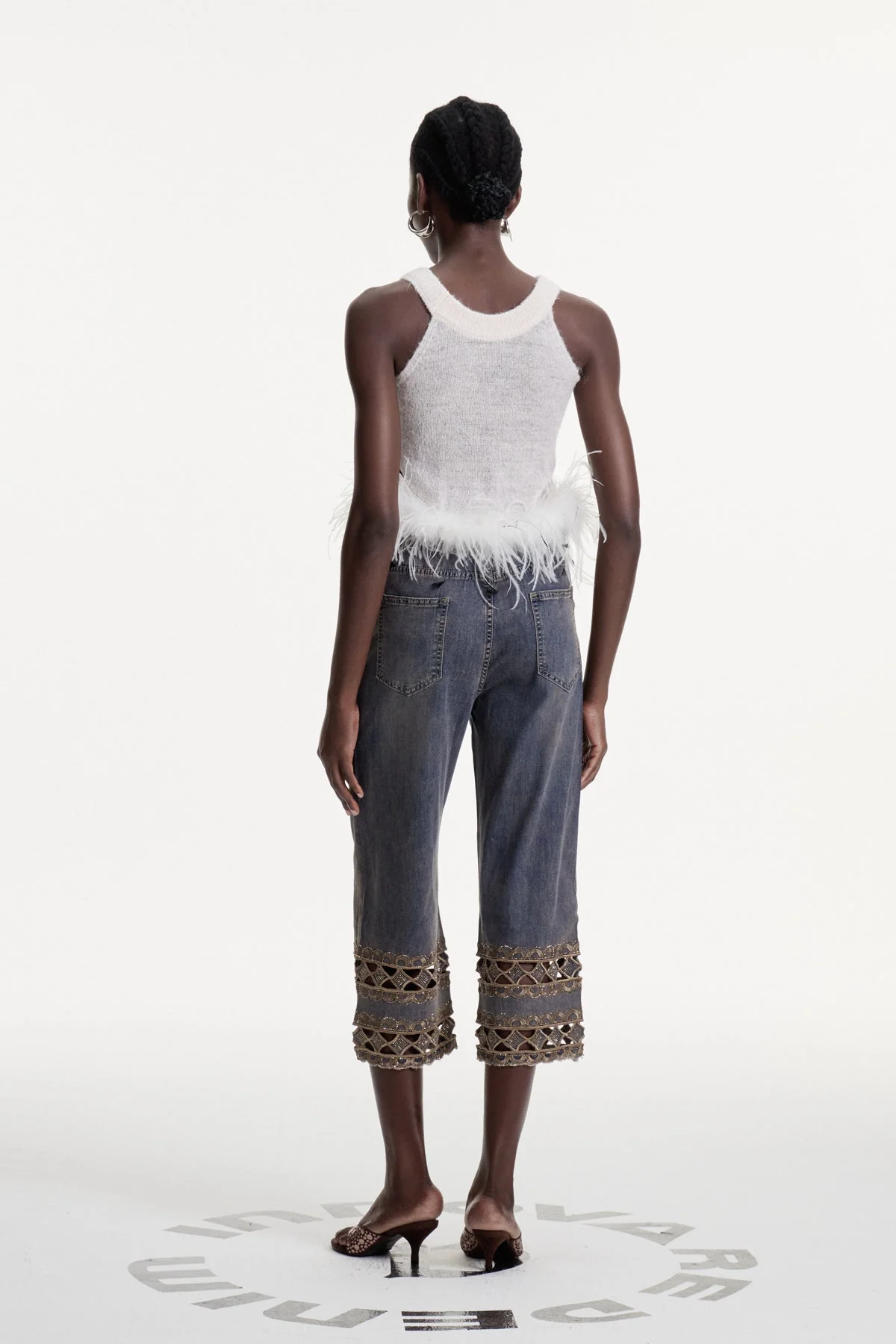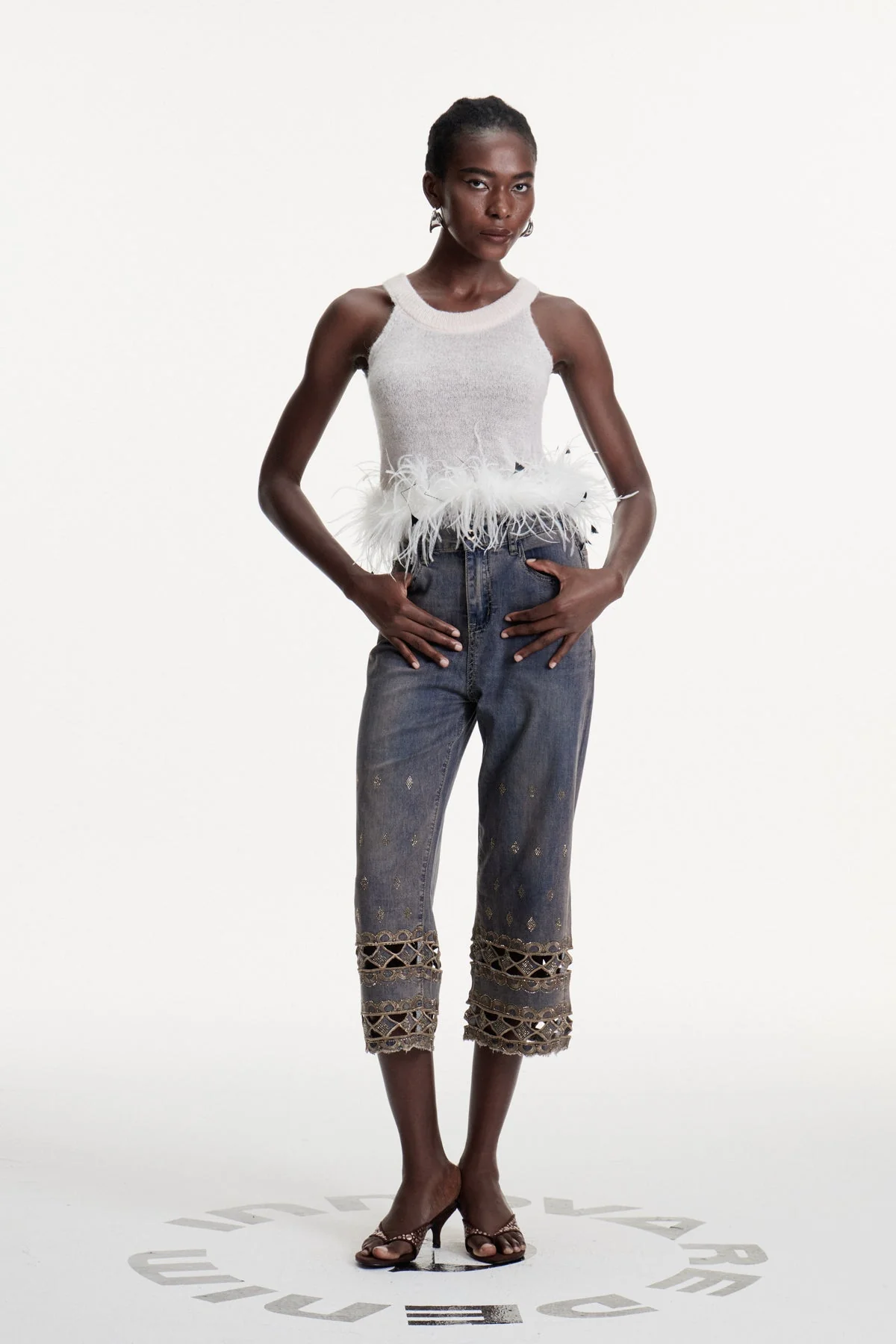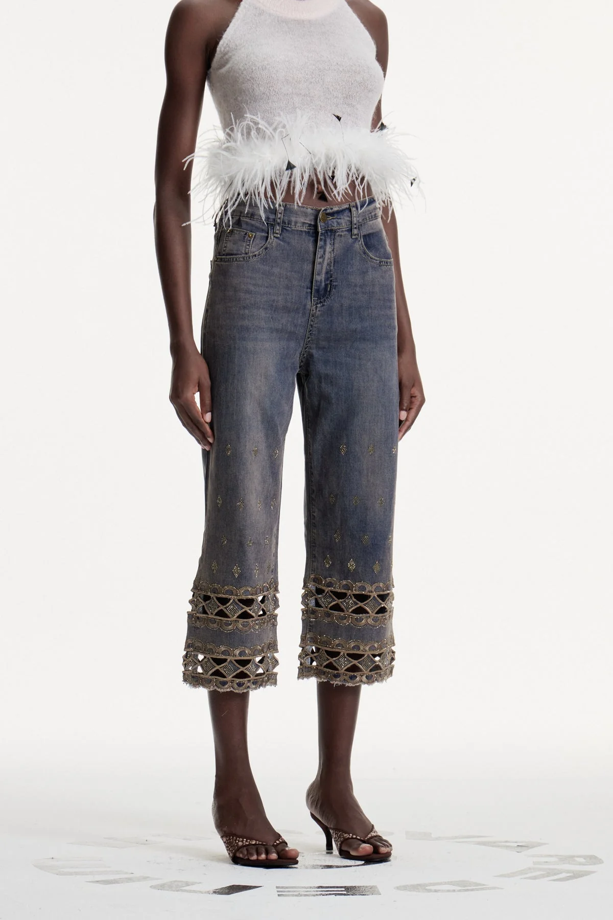 Elevate your denim collection with the Blue Cutout Rhinestone Slim Fit Jeans. Expertly crafted with strategic cutouts adorned with sparkling rhinestones, these jeans make a bold fashion statement. Combining contemporary edge with refined detailing, they offer comfort and standout style for those seeking wardrobe uniqueness. Perfect for showcasing confidence and individuality at any occasion. This non-stretch denim is best cleaned with a gentle machine wash. Please note, color may vary due to lighting in images.
