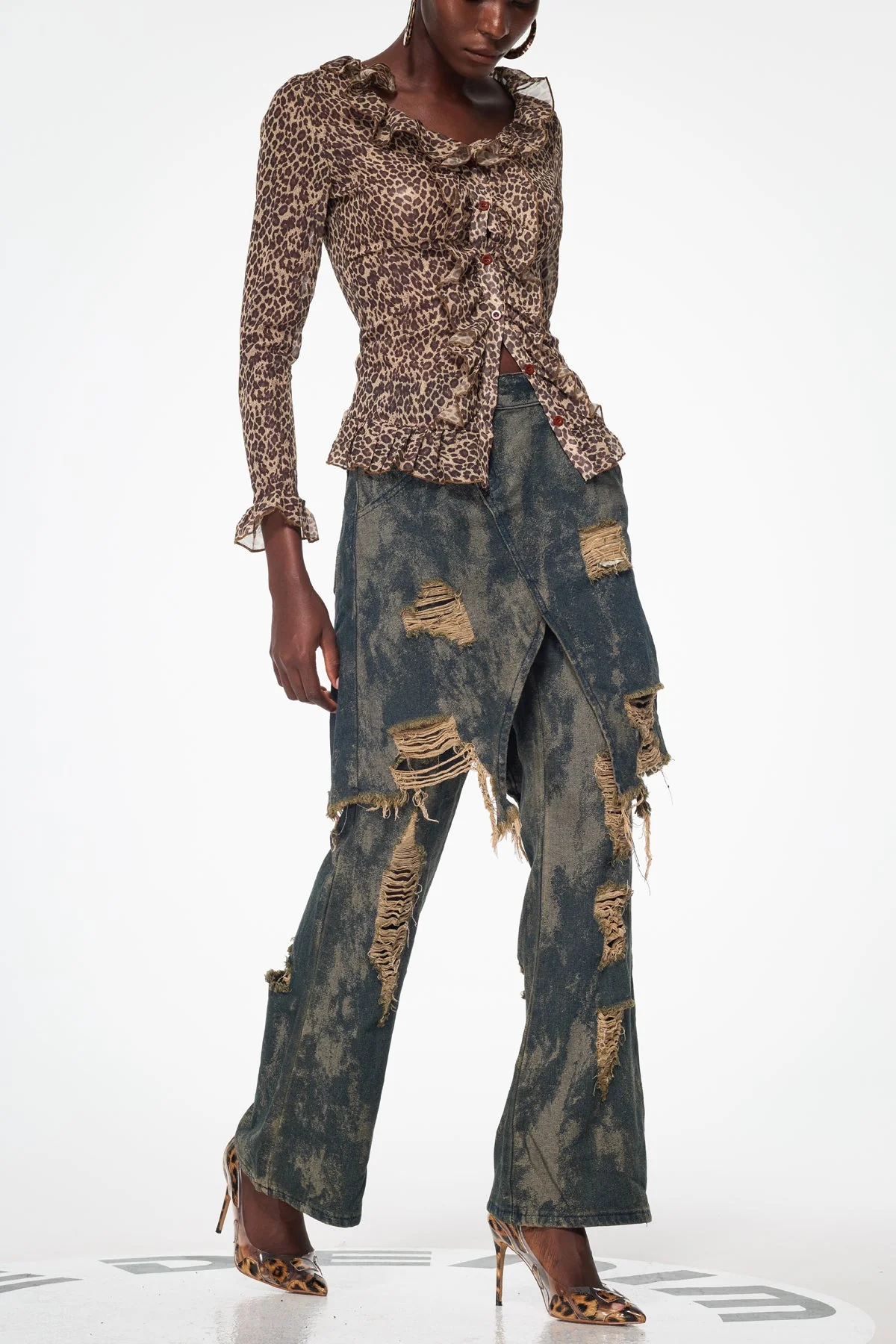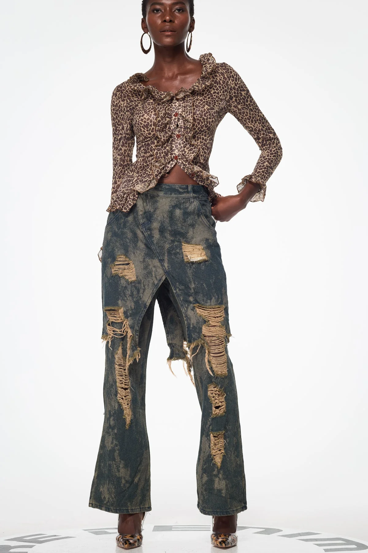 Elevate your style with these high-quality denim jeans . Crafted for comfort and durability, the Bairrfhionn Ripped Deconstruct Jeans feature a stylish ripped design for a unique and edgy look. Made of 50% Polyester and 50% Cotton, these non-stretch jeans are easy to care for with a gentle machine wash. Experience all-day comfort in style. Please note that color may vary due to lighting.