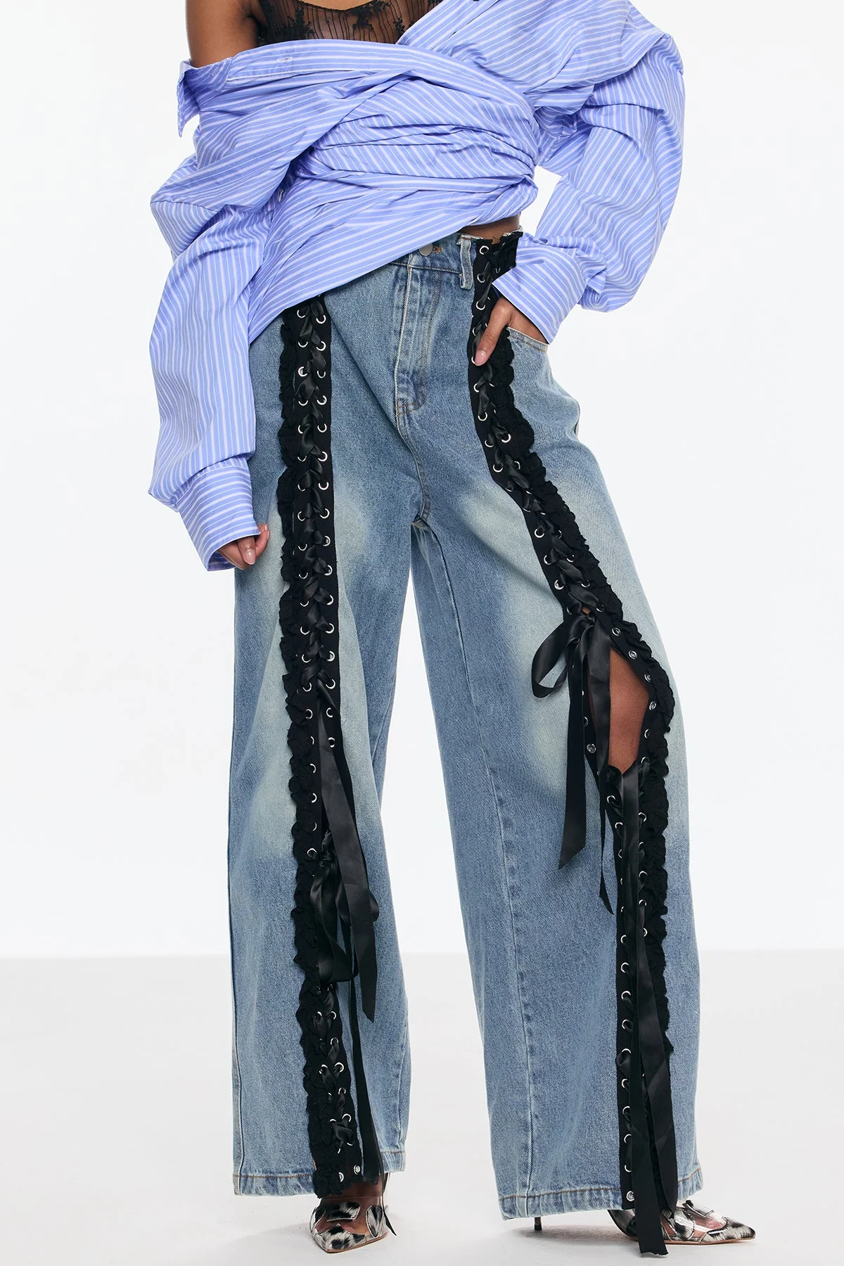 Discover the edgy flair of these Blue Deconstruct Lace-Up Fringe Jeans . Crafted with a deconstructed design and lace-up fringe detail, these jeans are a stylish, must-have addition to any wardrobe. Constructed from 50% Polyester and 50% Cotton for durability and comfort. Explore urban edge fashion with these non-stretch jeans that add a unique touch to your look. Note: Color may vary due to lighting affect.