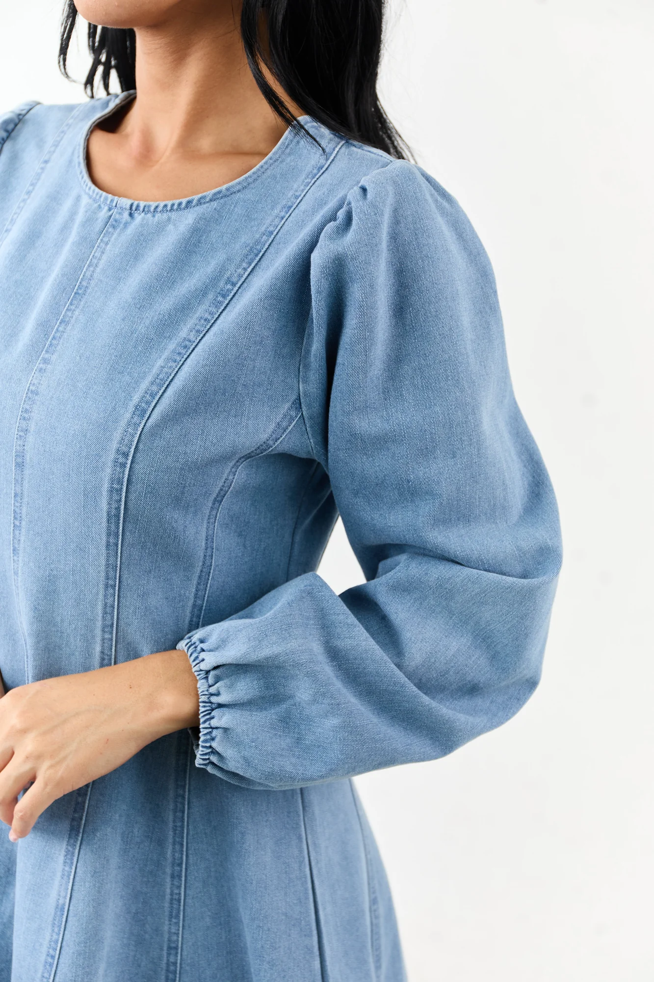 This denim mini dress in blue features an A-line fit with a lived-in finish. Crafted from non-stretchy lightweight denim, it includes elastic cuffs, back zipper, and is unlined. Ideal for sizes XS to XL. Detailed with specs for size SM: Bust 38″, Waist 32″, Length 33″. Suitable for fall season with 80% Cotton and 20% Polyester blend. Belt not included. Imported. Model is 59″ tall, size Small, with a bust of 34″ and waist of 26″.
