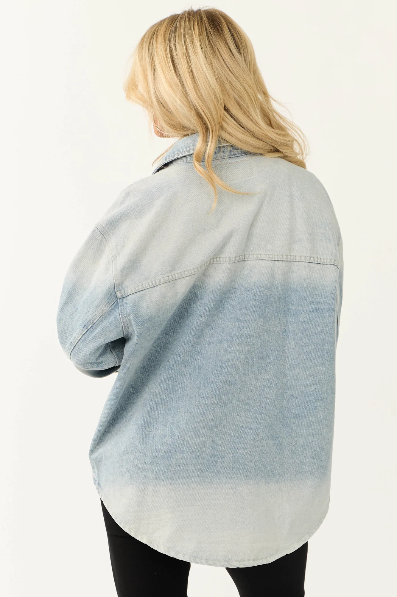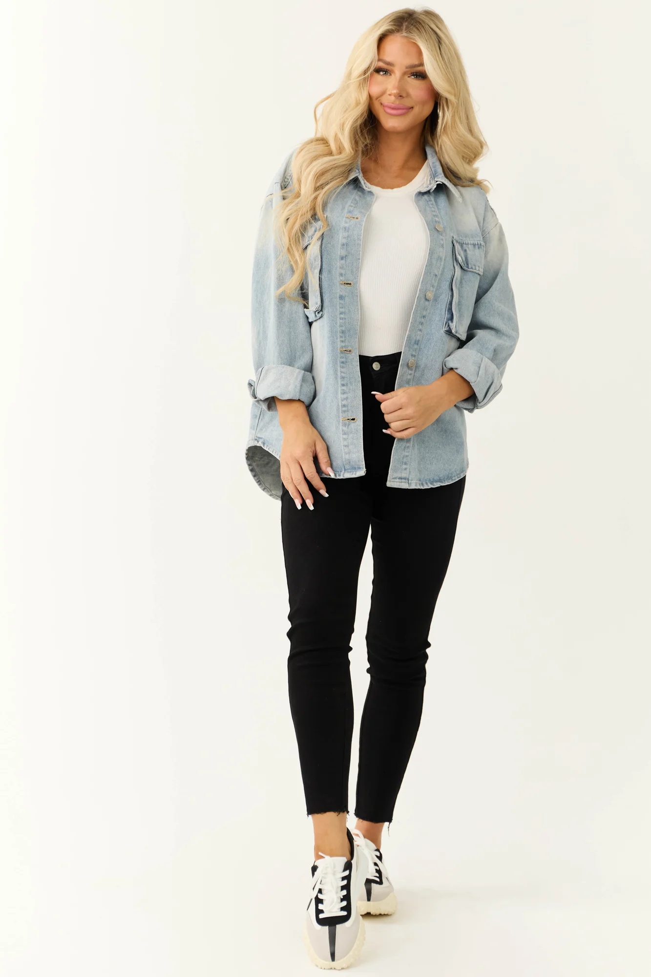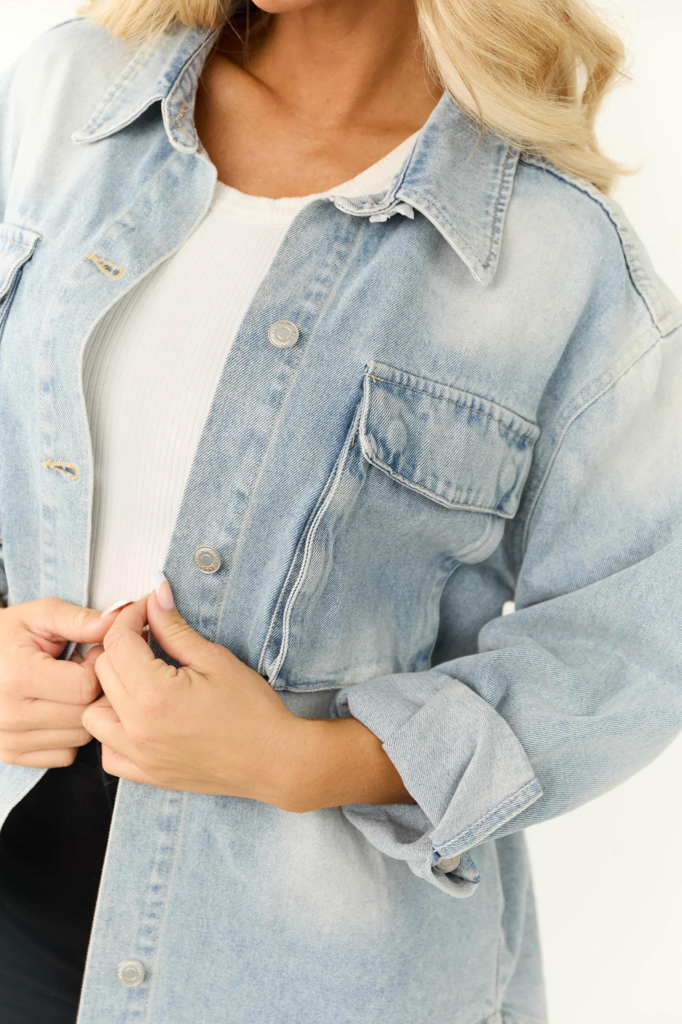 Stay warm and stylish with our Light Wash Denim Long Sleeve Buttoned Jacket. Made from non-stretchy denim, this jacket features a collared neckline, drop shoulder design, two chest pockets with snap button closure, banded buttoned cuffs, and a high-low hem. Perfect for casual daytime wear, this unlined jacket is crafted from 100% Cotton and comes in sizes S, M, and L. Hand wash cold and line dry for best care.